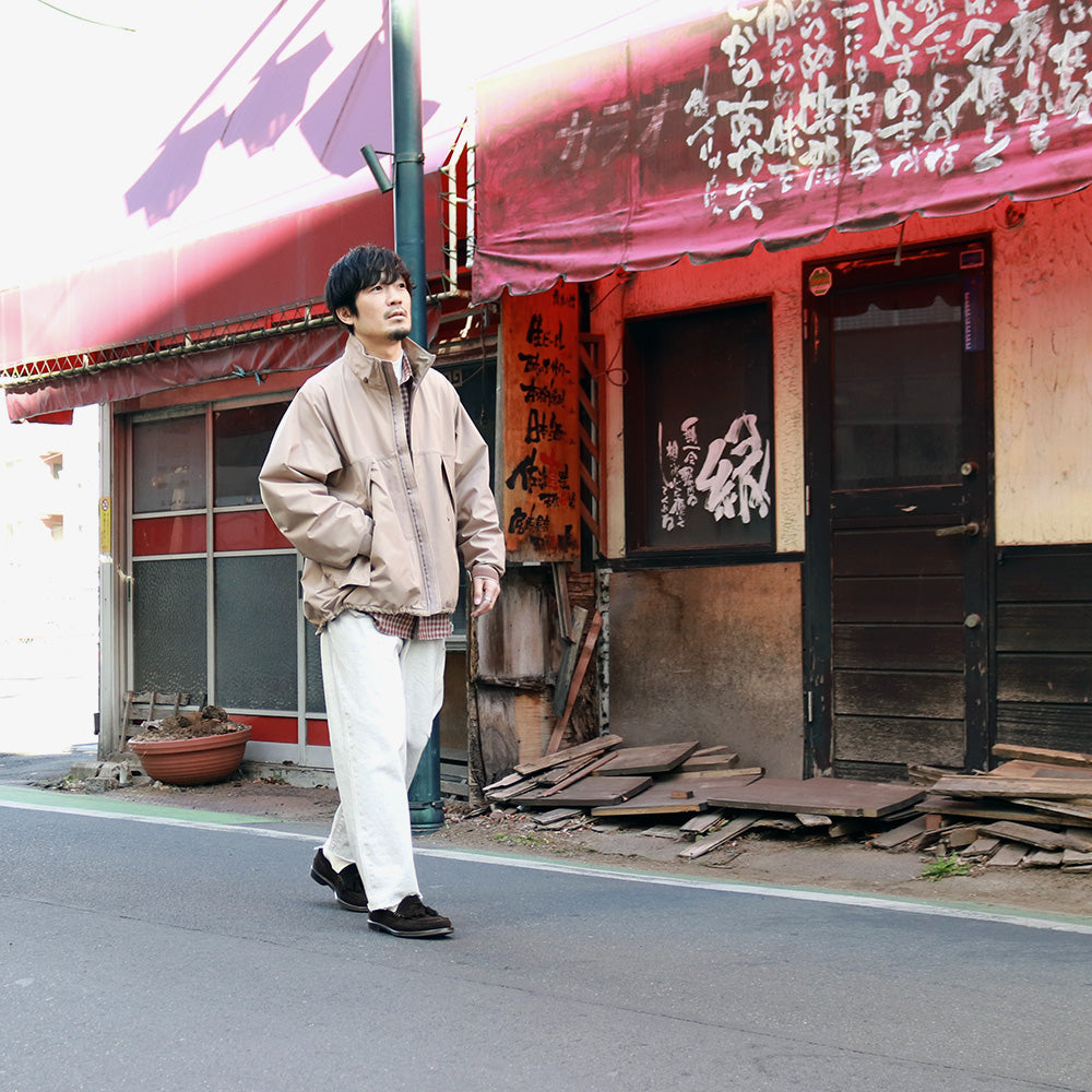 model:175cm 67kg 着用サイズ:ジャケット ONE SIZE、シャツ 48、パンツ 2 着用アイテム O- BARTHLOTTO JACKET Ernie Palo Silk Cotton Stripe Shirt saby TYPE01 DECADENT PROCESSING - 12.5oz Bingo Denime -