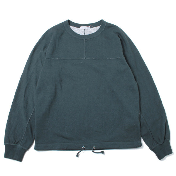 The garment is dyed and then specially processed to create a faded and uneven color. The modified raglan sleeves are a distinctive feature.