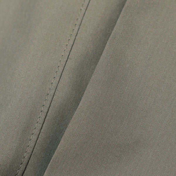 The warp threads are made of yarn-dyed, extremely fine count Finks cotton, and the weft threads are made of yarn-dyed, fine count polyester, creating a high-density woven chambray.