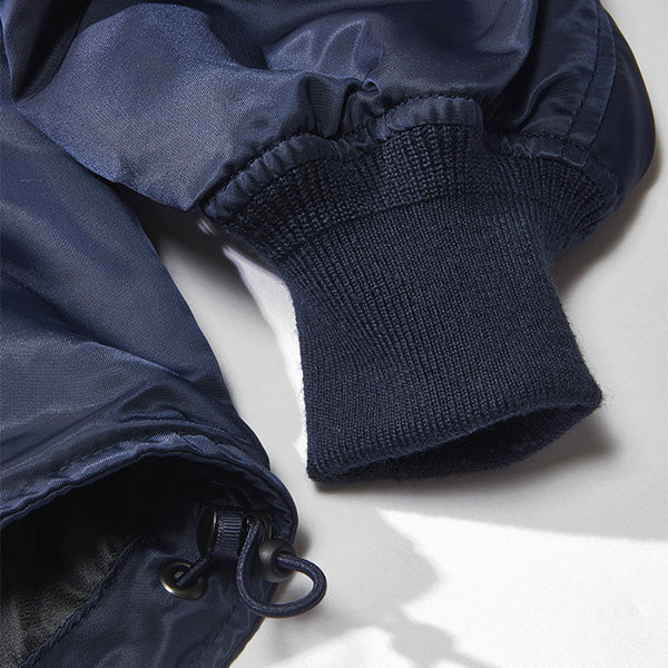 The drawstring at the hem and the inner pocket are details used in outdoor jackets.