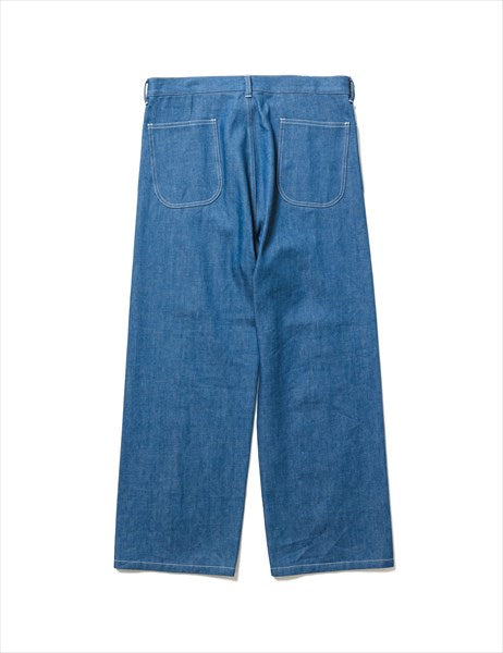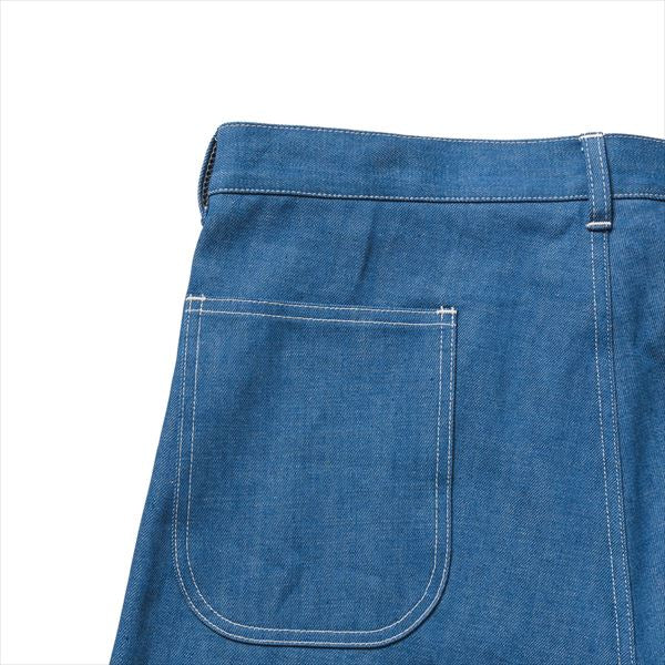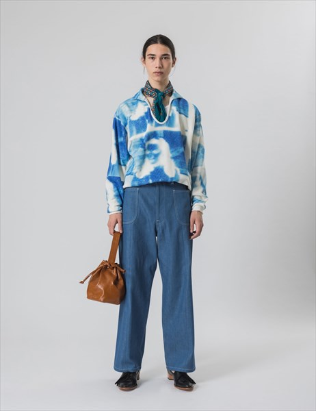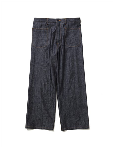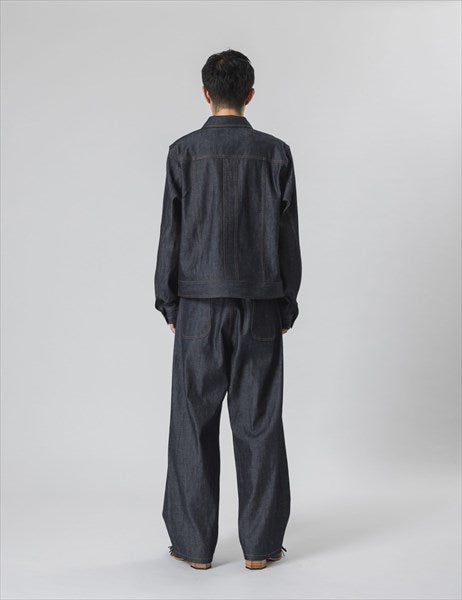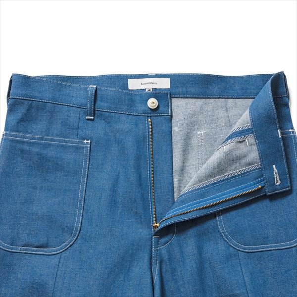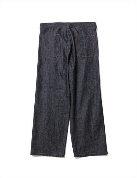 This is rigid denim with a flared silhouette made using 10oz slub yarn.