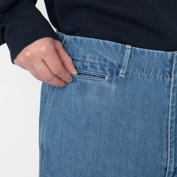 ・We developed our own thick uneven yarn, which is made of recycled polyester covered with cotton, and dyed it using rope dyeing. This original denim is lightweight, durable, and quick-drying, while also allowing you to enjoy the natural aging process.