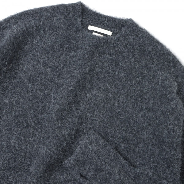 A blend of baby alpaca and merino wool, this item uses fluffy, soft yarn. It has a used look with napping. The sleeves are long and have thumb holes. The sleeve ribbing can be folded back when not in use.