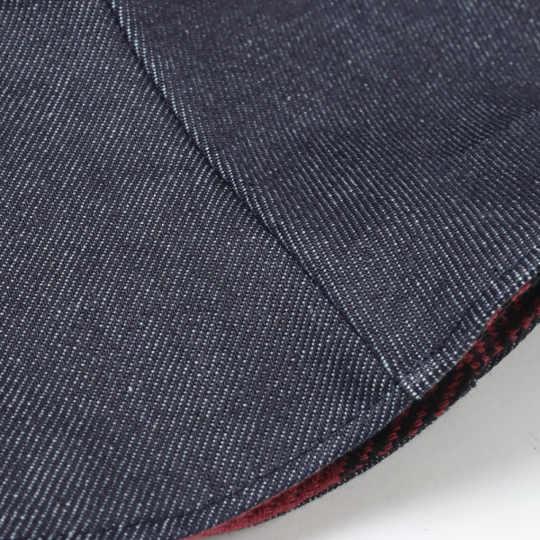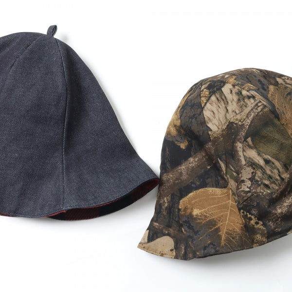 This is a reversible tulip hat made from a combination of denim and cotton flannel.