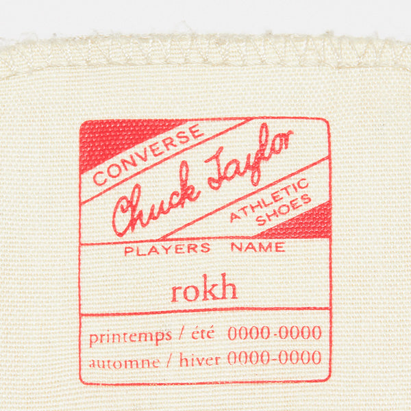 (2) Player's name: A reproduction of the name print on the bottom of the right foot that was seen on the "ALL STAR" of the 1960s. The brand name "rokh" is written on the PLAYERS NAME.