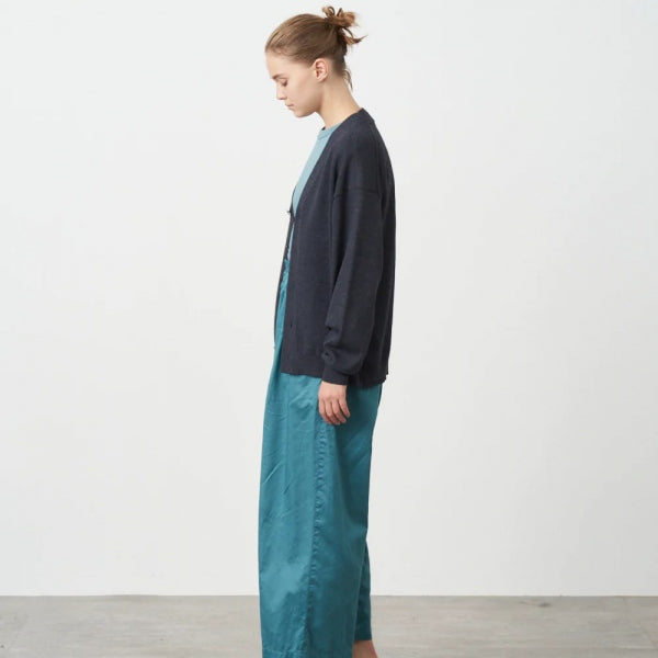 This cardigan features an oversized silhouette with a wider placket than usual. The ribbing at the hem is not too tight, so it can be worn lightly over a T-shirt. It is washable and highly absorbent, making it a piece that can be worn in three seasons except for the middle of winter.