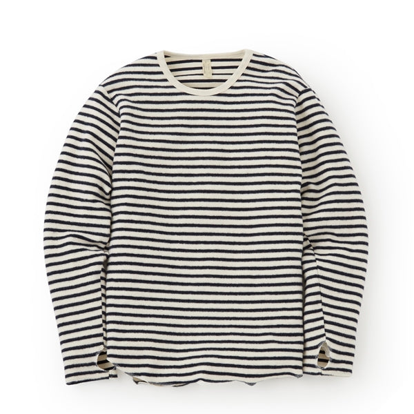 This is a long-sleeved T-shirt made of sturdy brushed striped fabric.