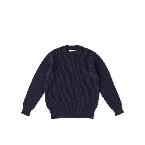The yarn was made by mixing a special wool yarn with a firm, crisp texture like that found in old knitwear, and ramie yarn, which has a rough feel and luster.