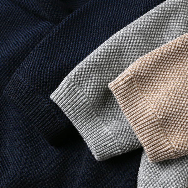 This time, two colors of yarn are knitted in a pique pattern, and the color scheme makes use of the unevenness of the fabric.