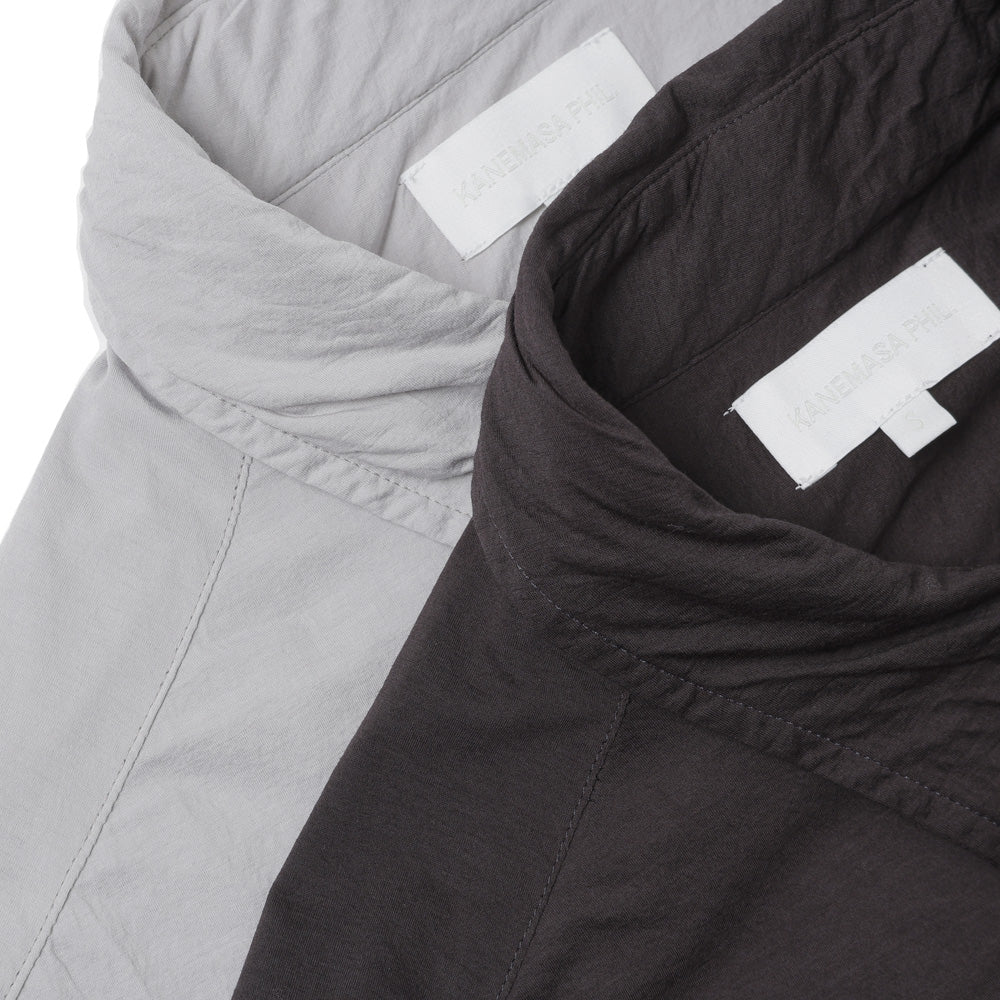 The high-gauge material is thin and difficult to work with, and the details, such as the raw edges on the hem, sleeves, and pockets, and the gathered yoke and cuffs, are all finished at a sewing factory in Japan.