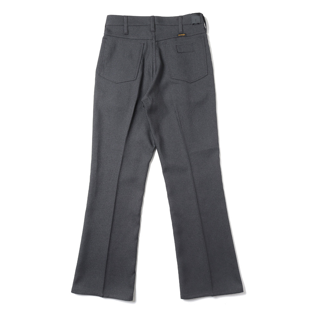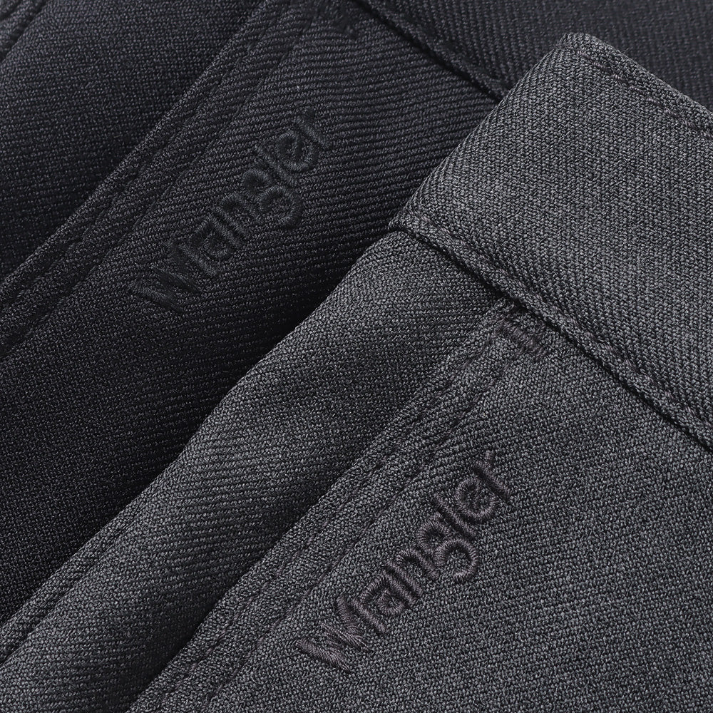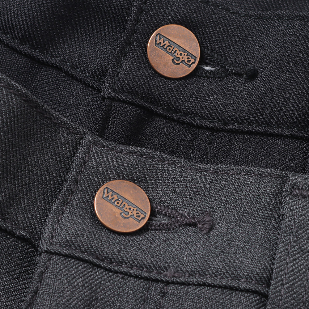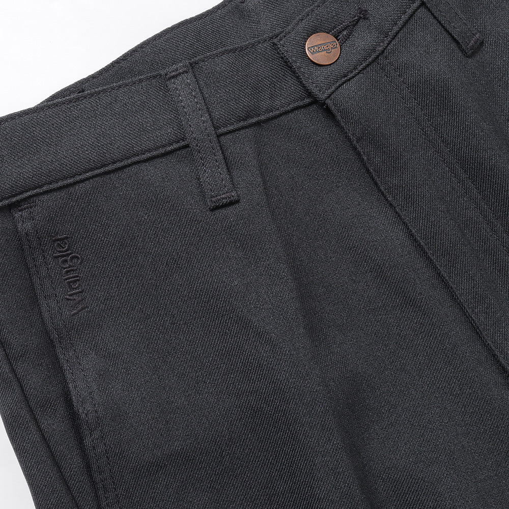 - A deep rise and a slim silhouette with a gently flared thigh . The Wrangler logo is embroidered in the same color along the slash pocket lines.
