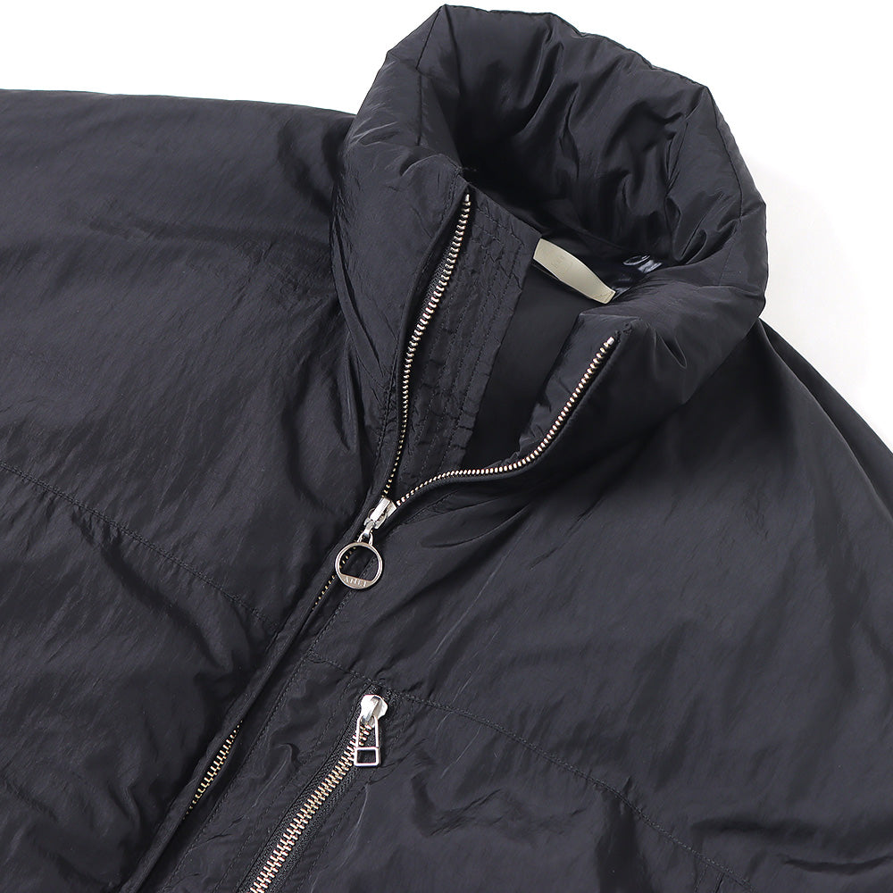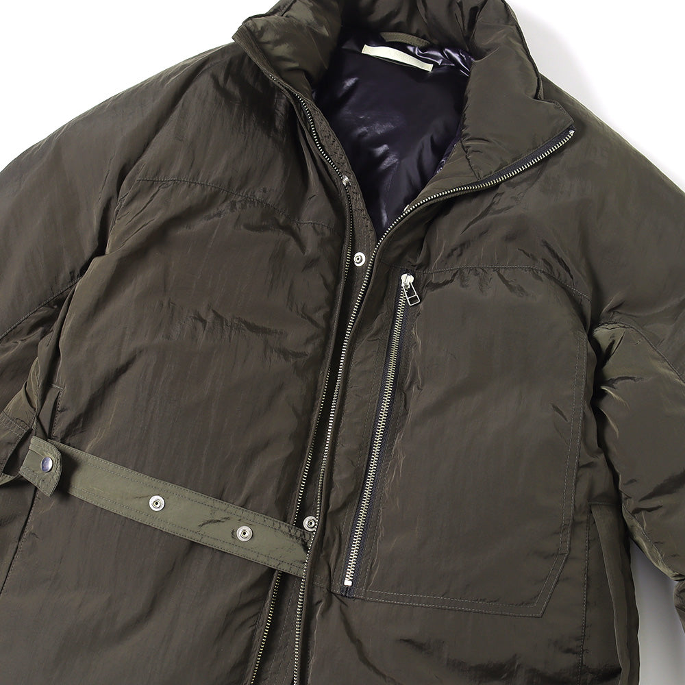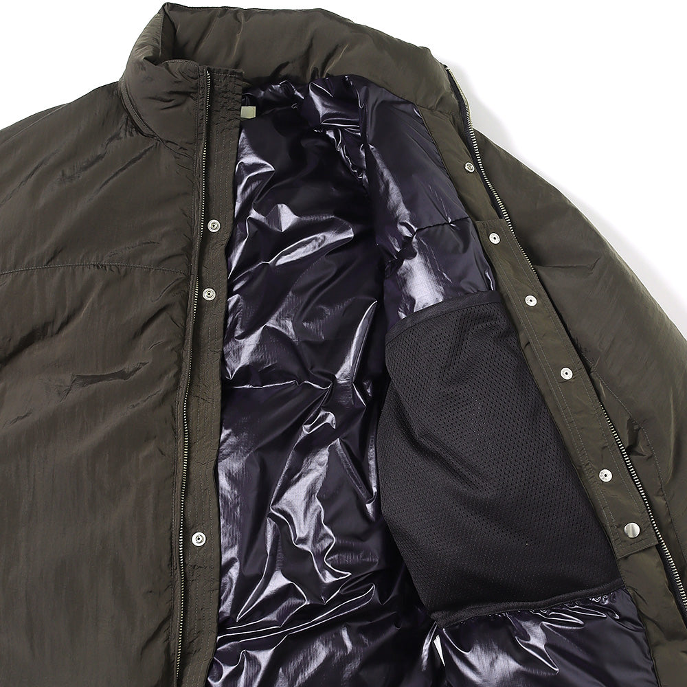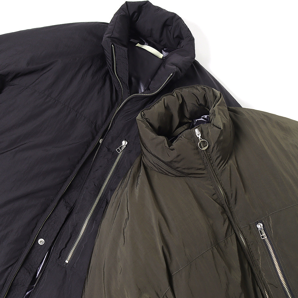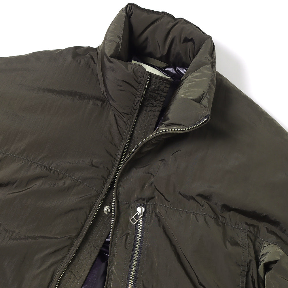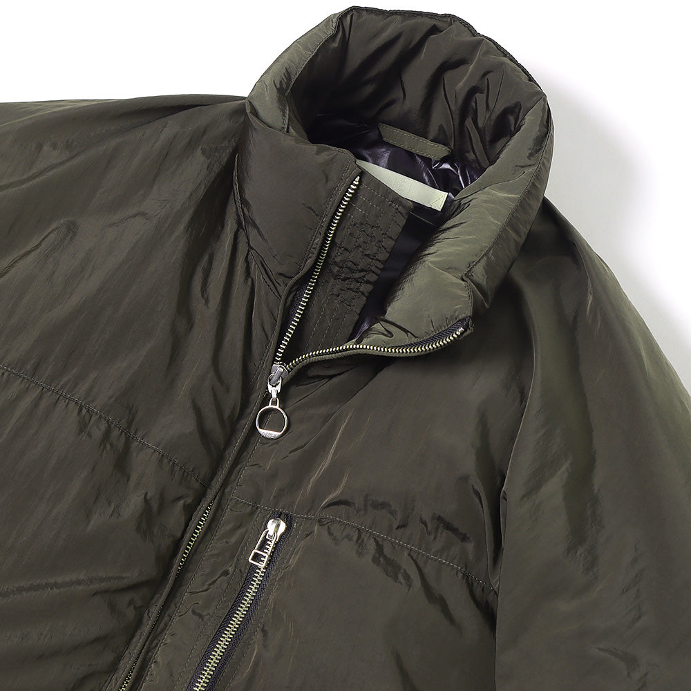 Stand collar down jacket with wide fit, yoke sleeves and a unique rounded silhouette thanks to its modified pattern structure.