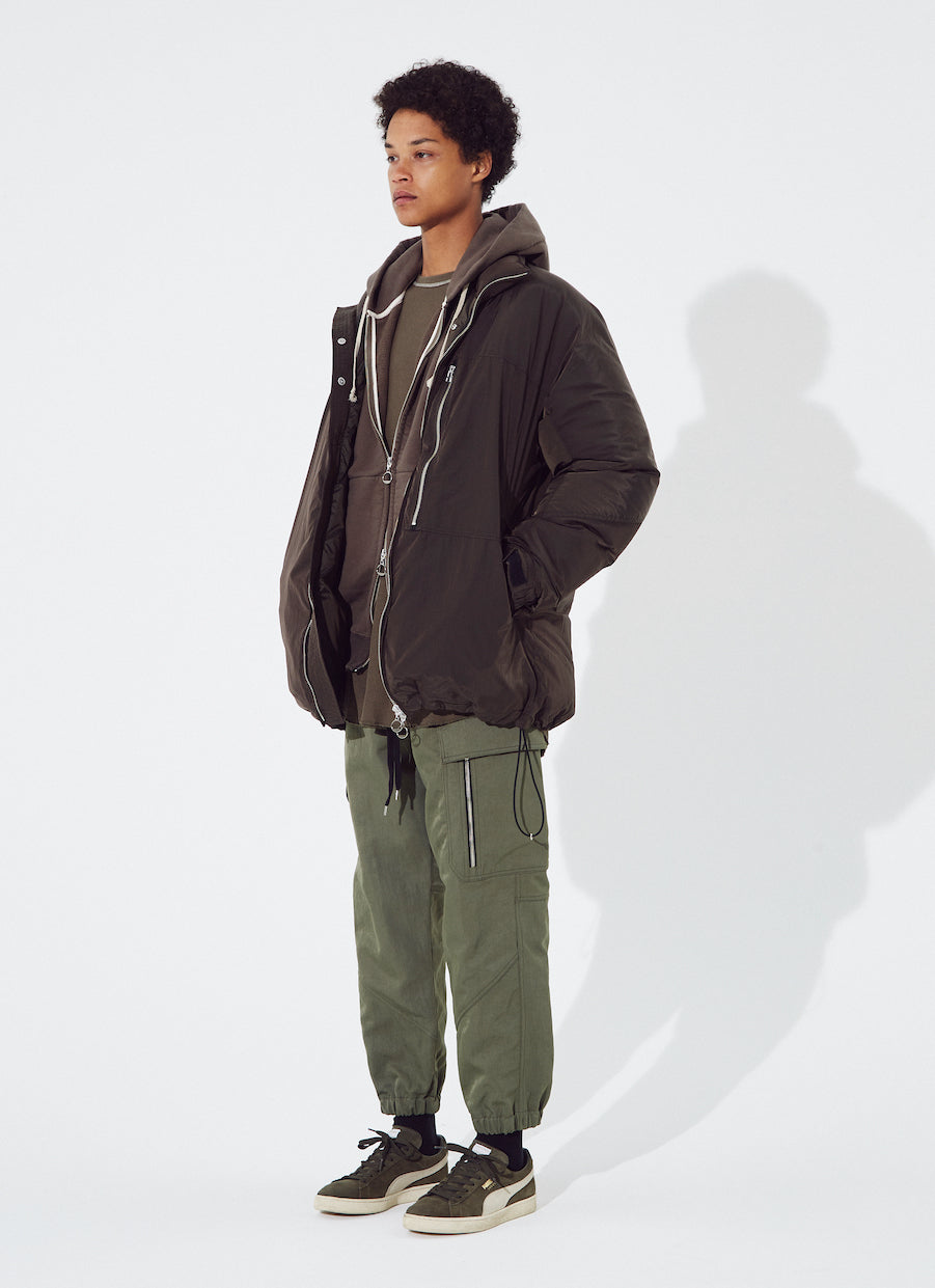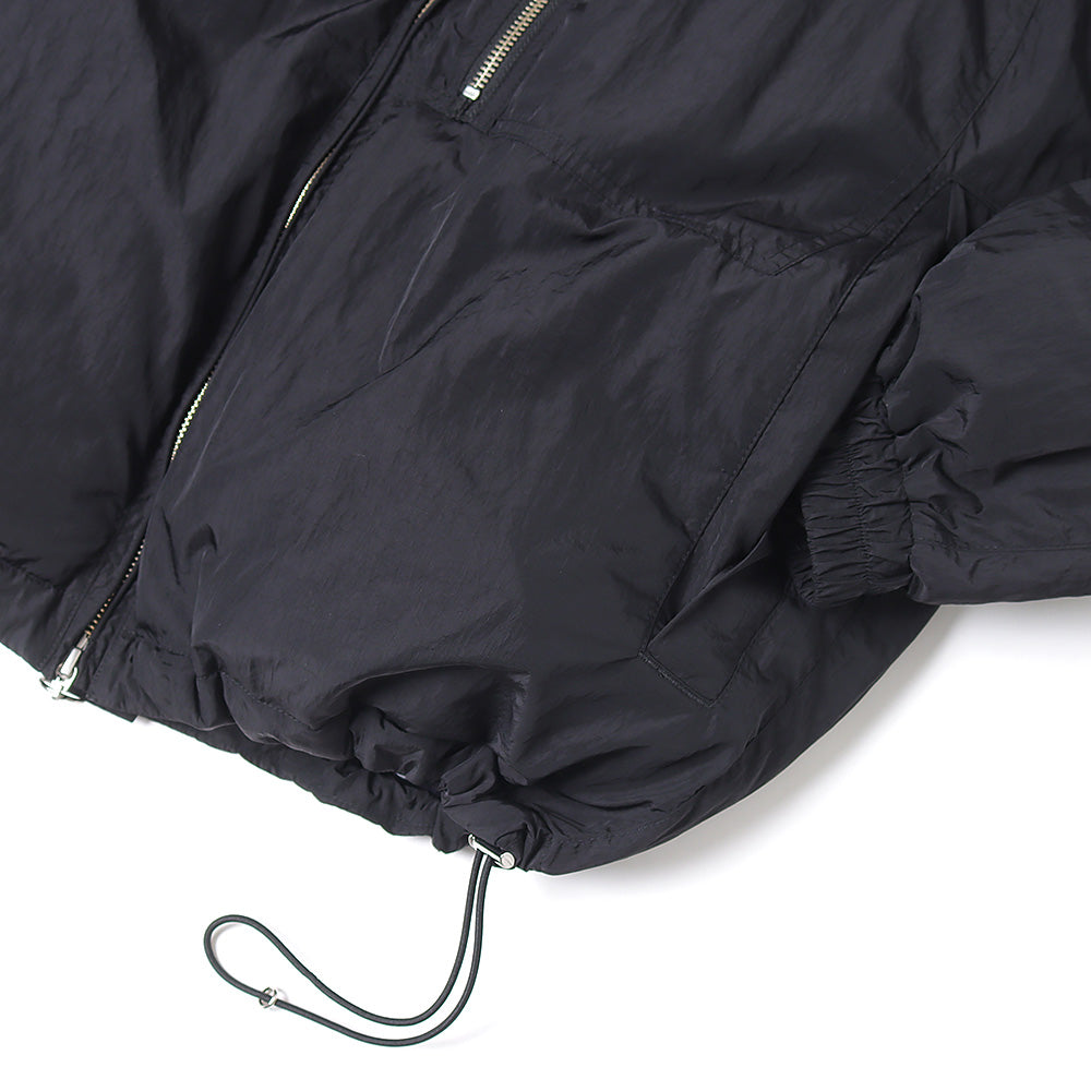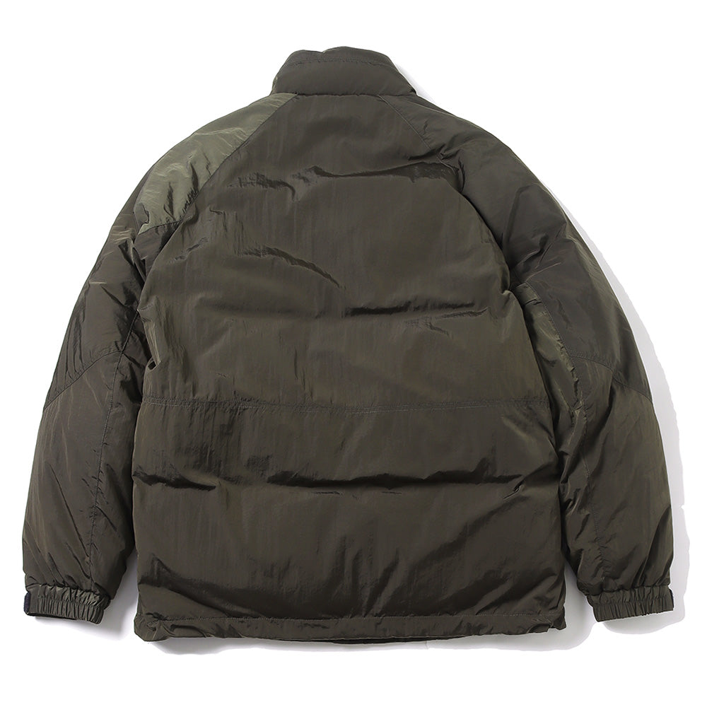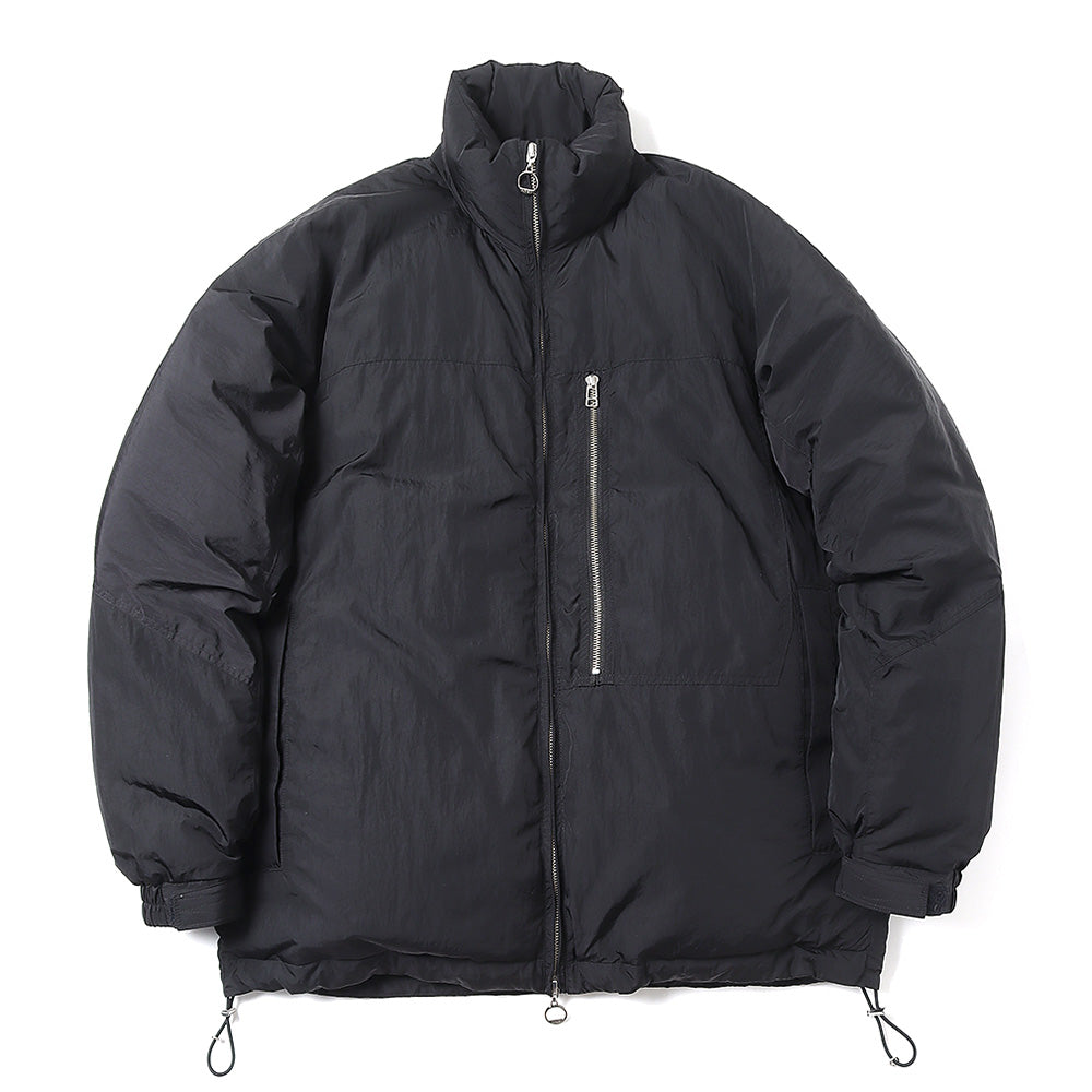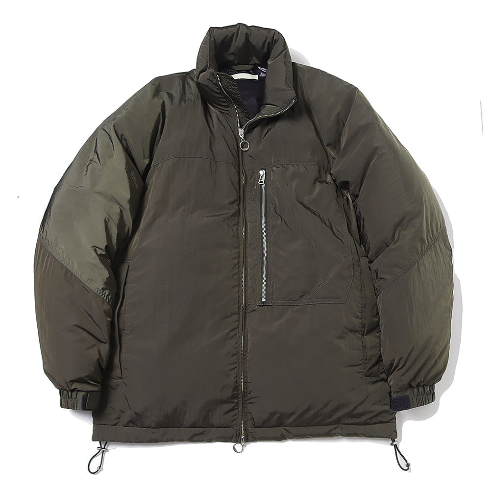 Stand collar down jacket with wide fit, yoke sleeves and a unique rounded silhouette thanks to its modified pattern structure.