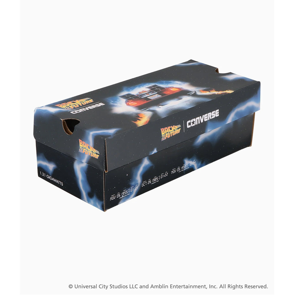 The outsole features a special design that subtly reveals the iconic scene of the protagonist Marty and "Doc" Emmett Brown standing side-by-side.