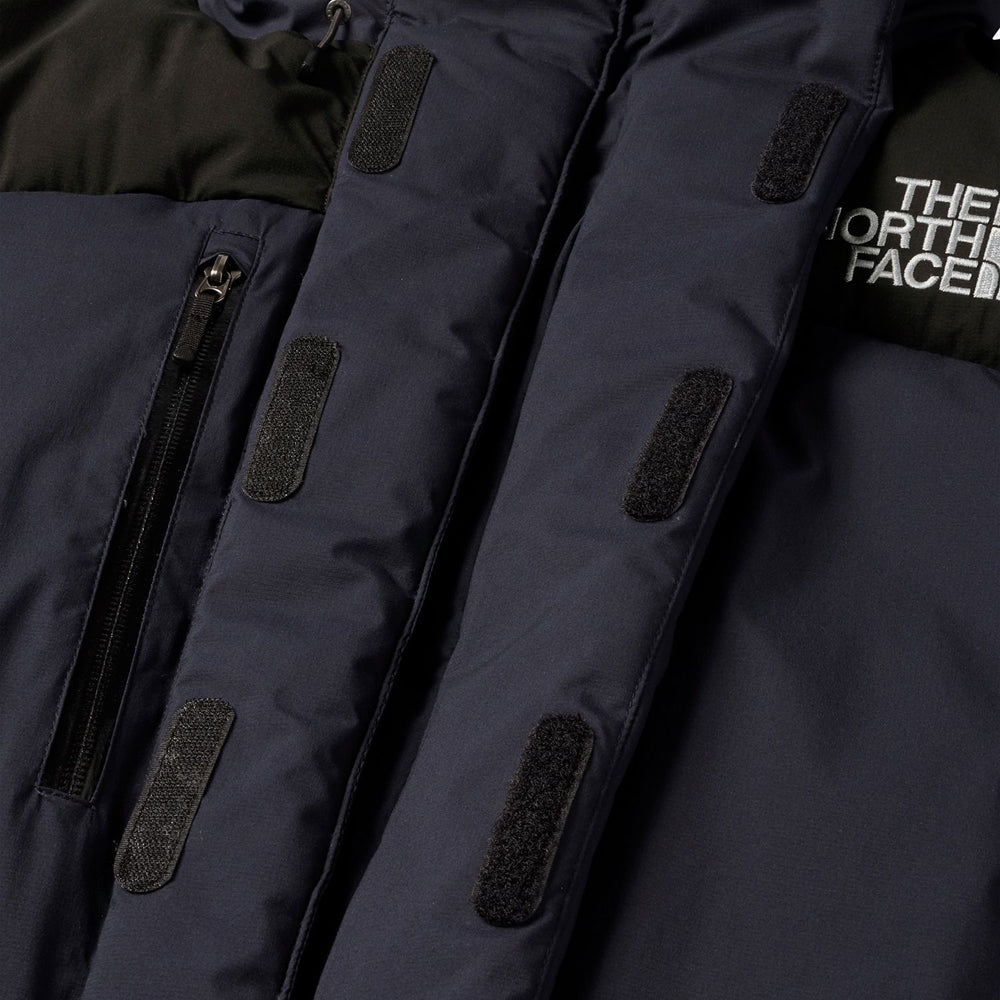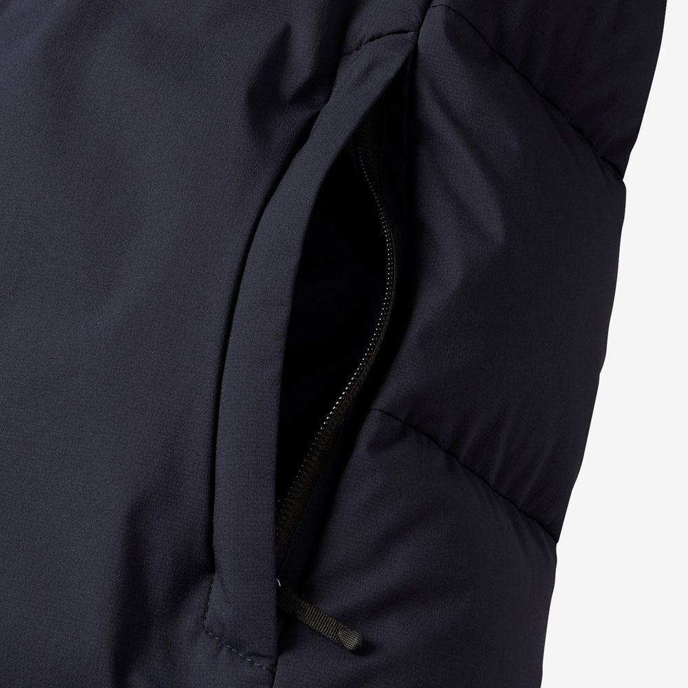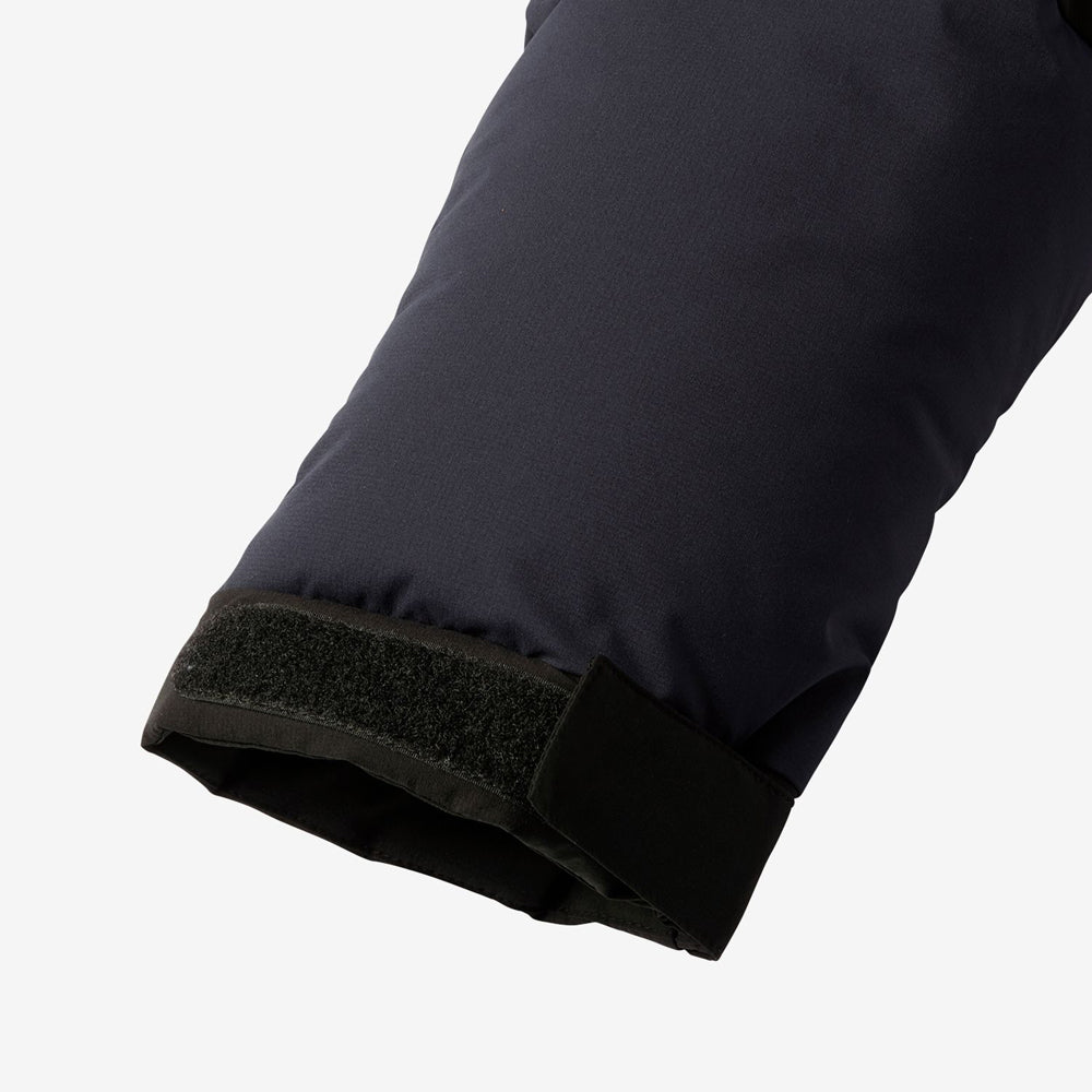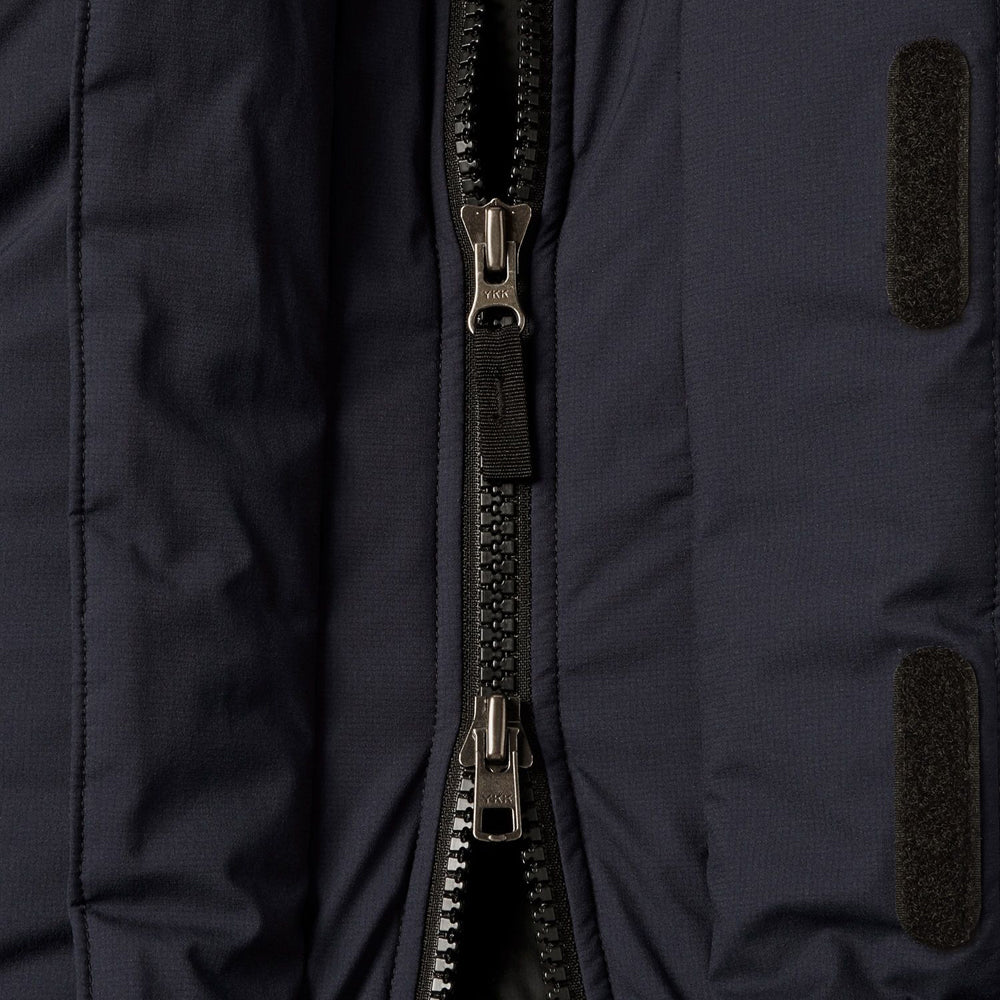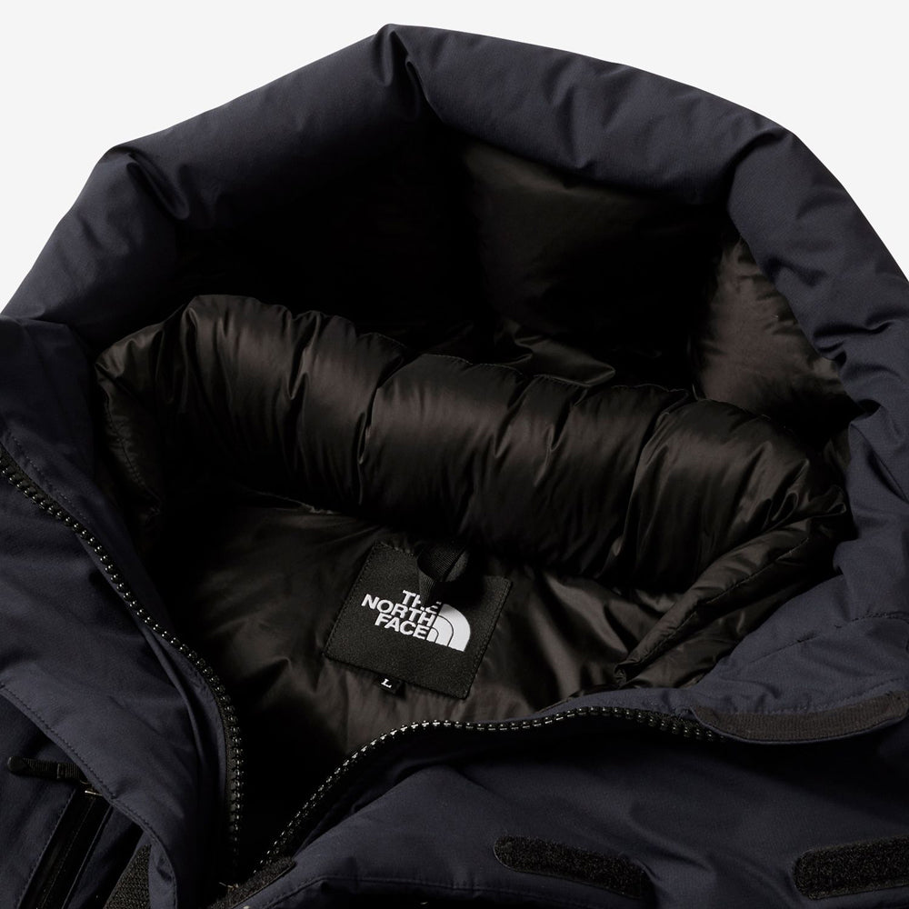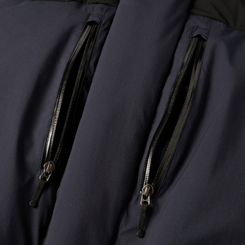 Double flap front / Two bottle pockets inside / One-hand adjuster hood / Waterproof zippers on both chest pockets / Down-filled inner collar