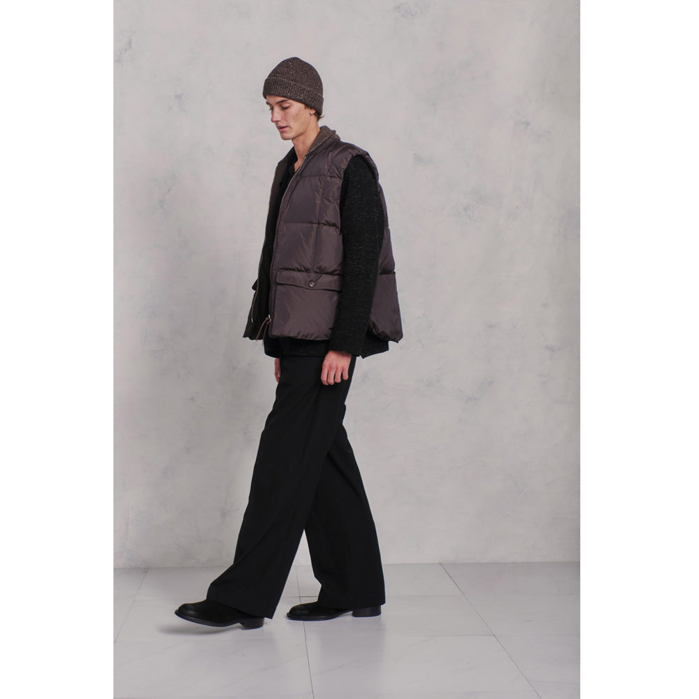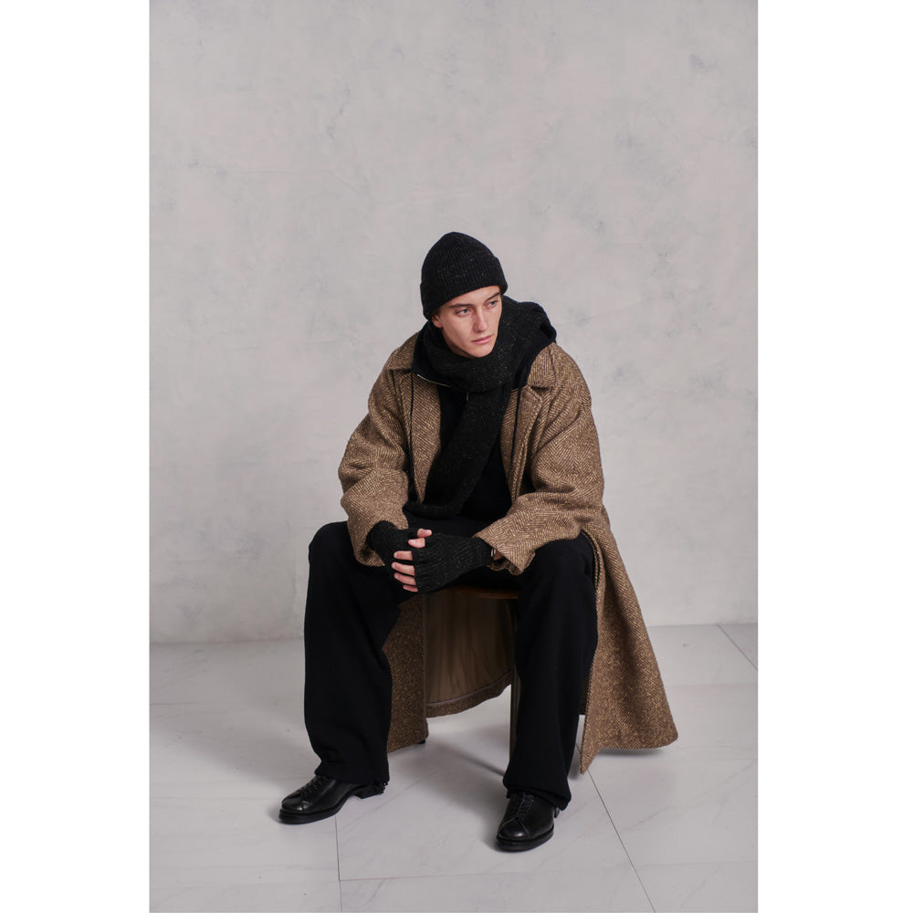 A blend of straight wool and linen kemp yarn, the rough feel of the kemp yarn stands out in the high-quality knit, creating a look with depth.