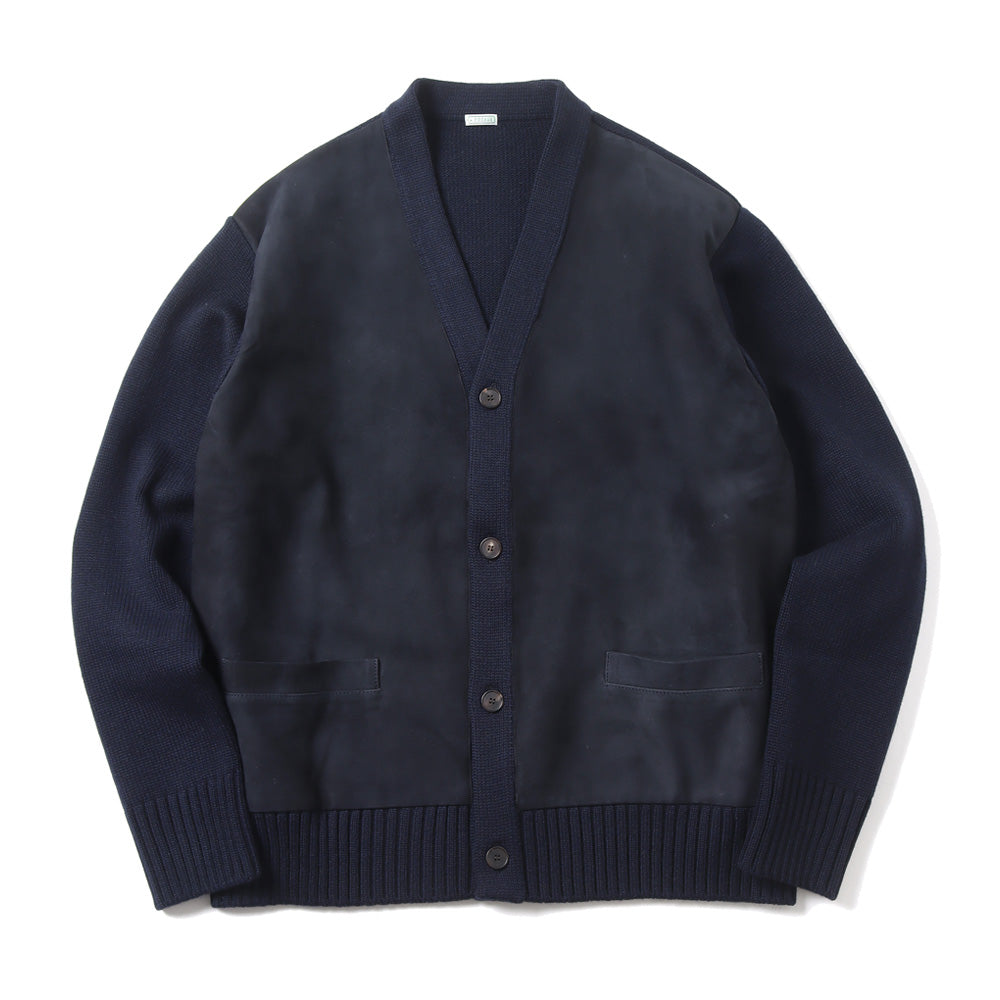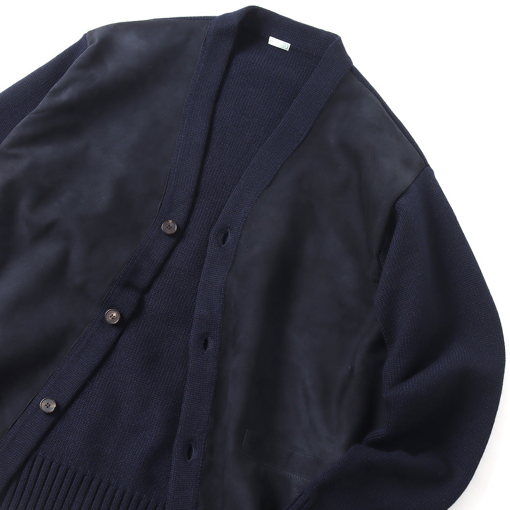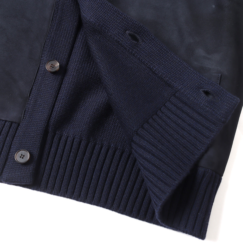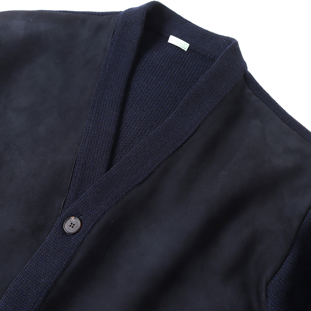 This leather knit combination cardigan has been carefully sewn and shaped.