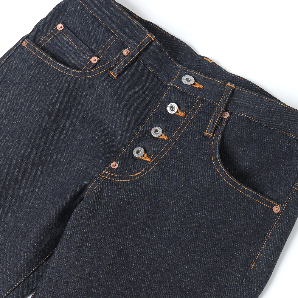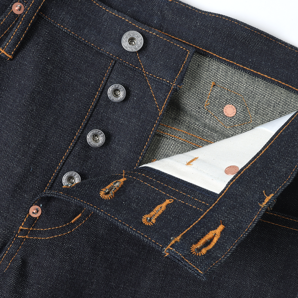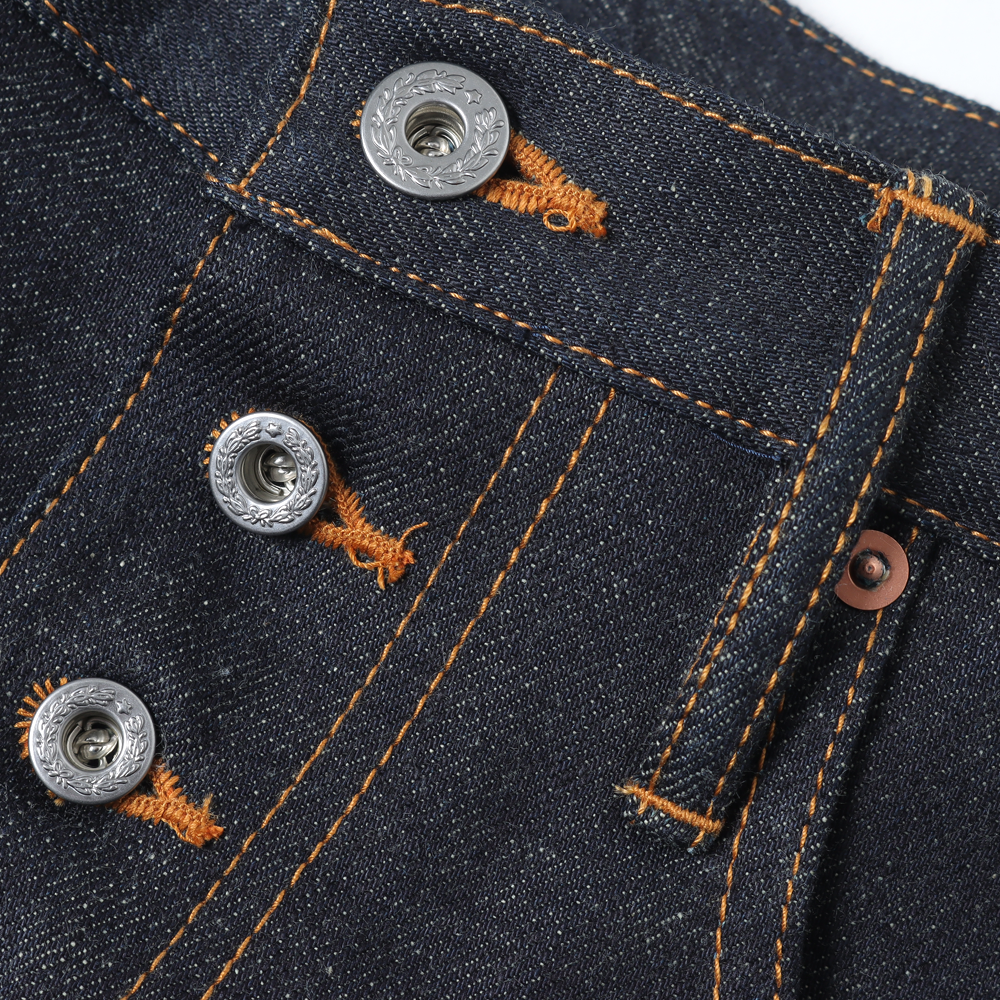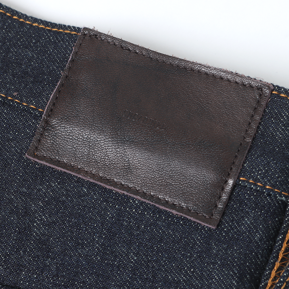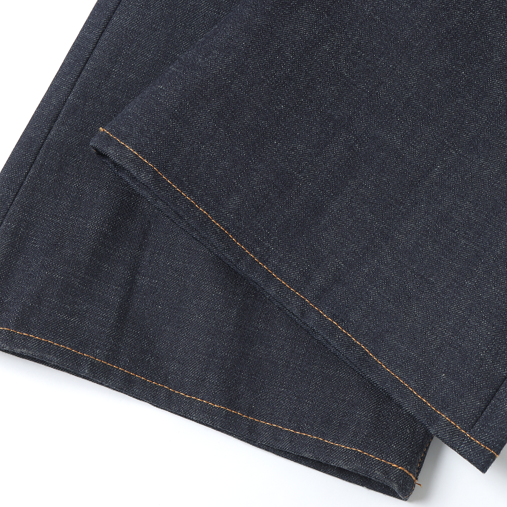 The raw material is American cotton, which is characterized by its hard uneven shape, and the warp threads are indigo rope dyed.