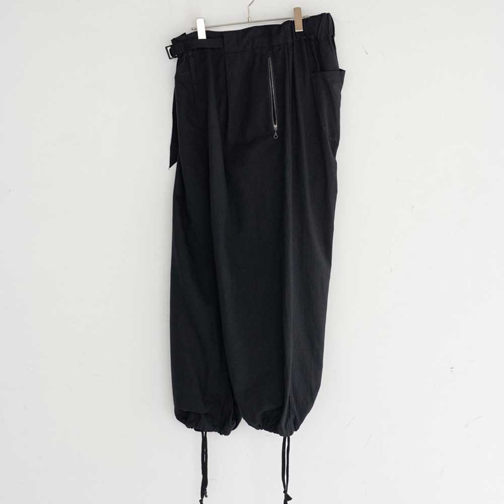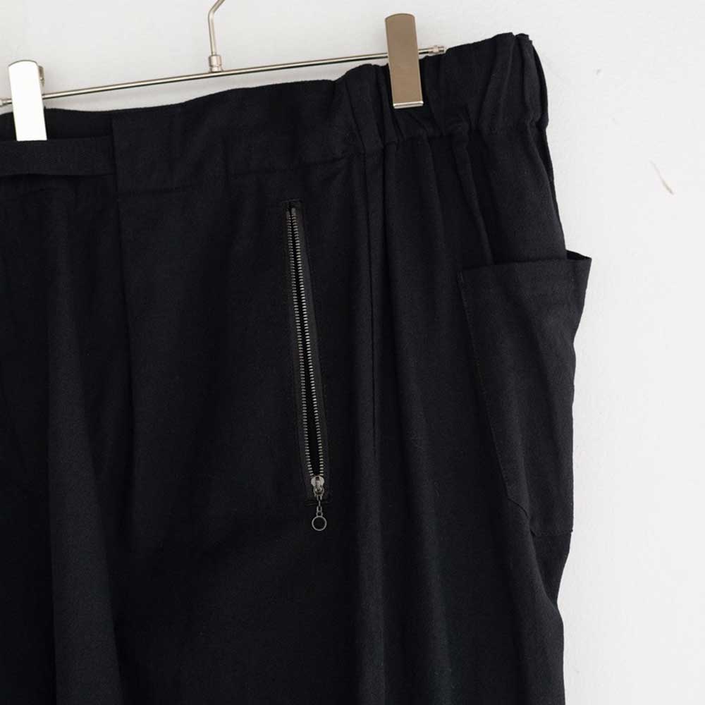 Wide pleated pants with clip-type waist adjuster.