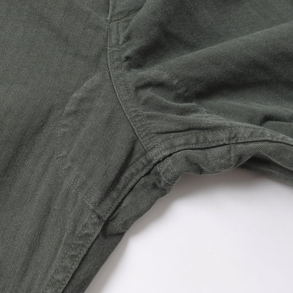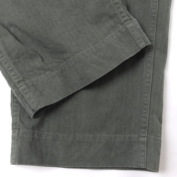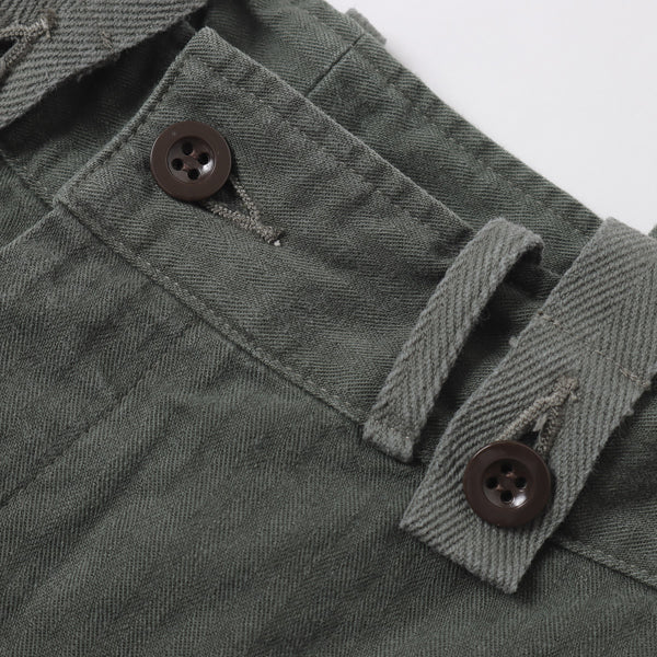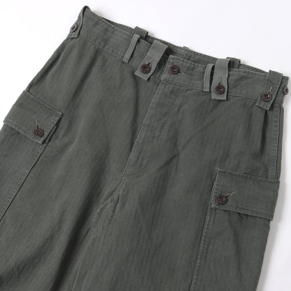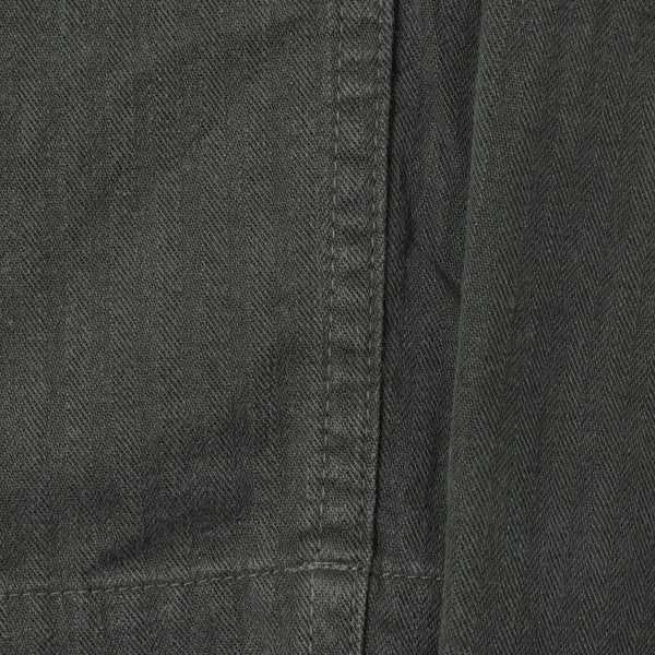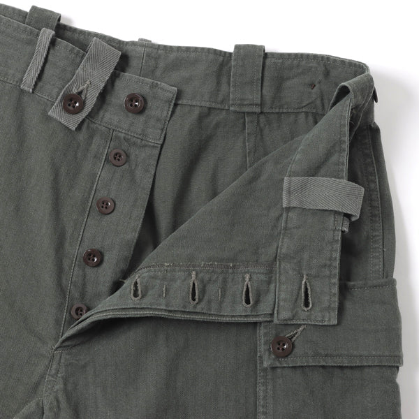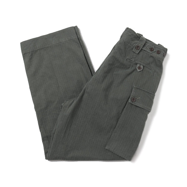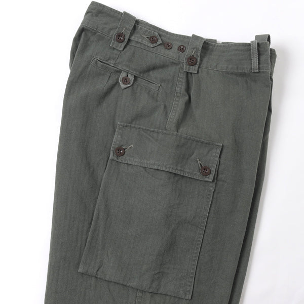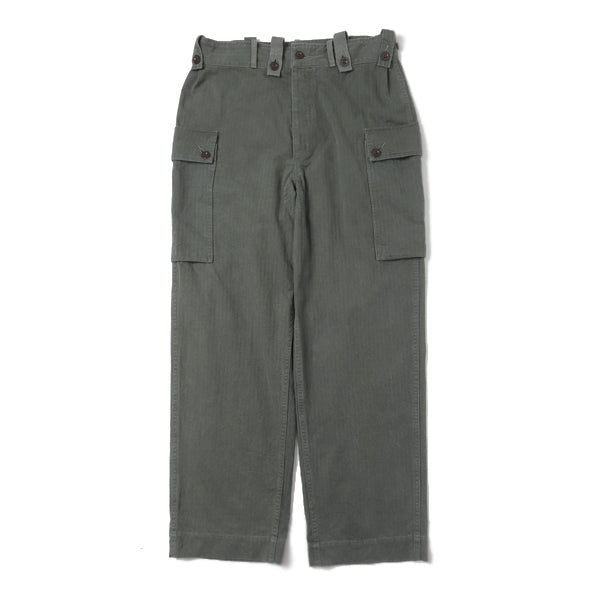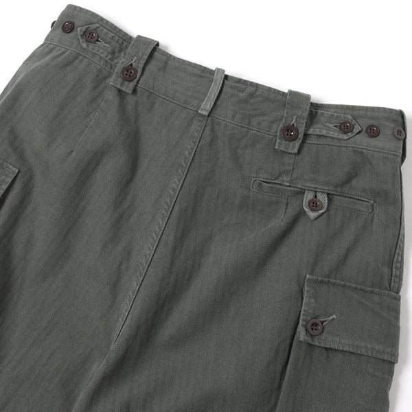 The original Belgian military style, which features no waist pockets and a clean waistline, has been left intact, but the excess material from the hips to the thighs has been removed,