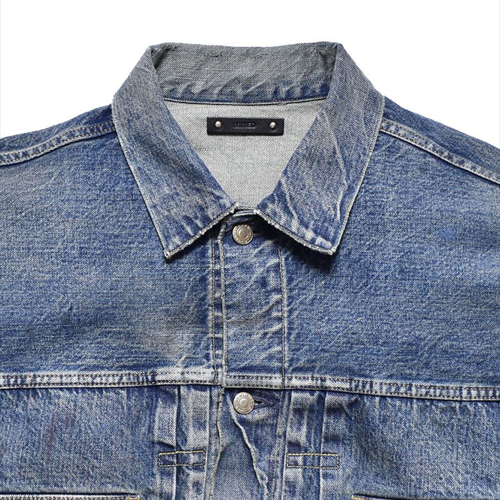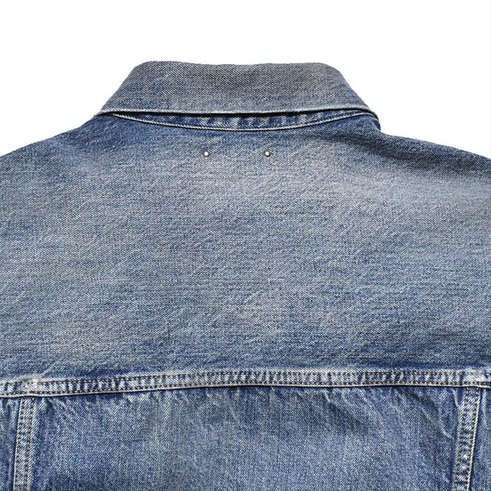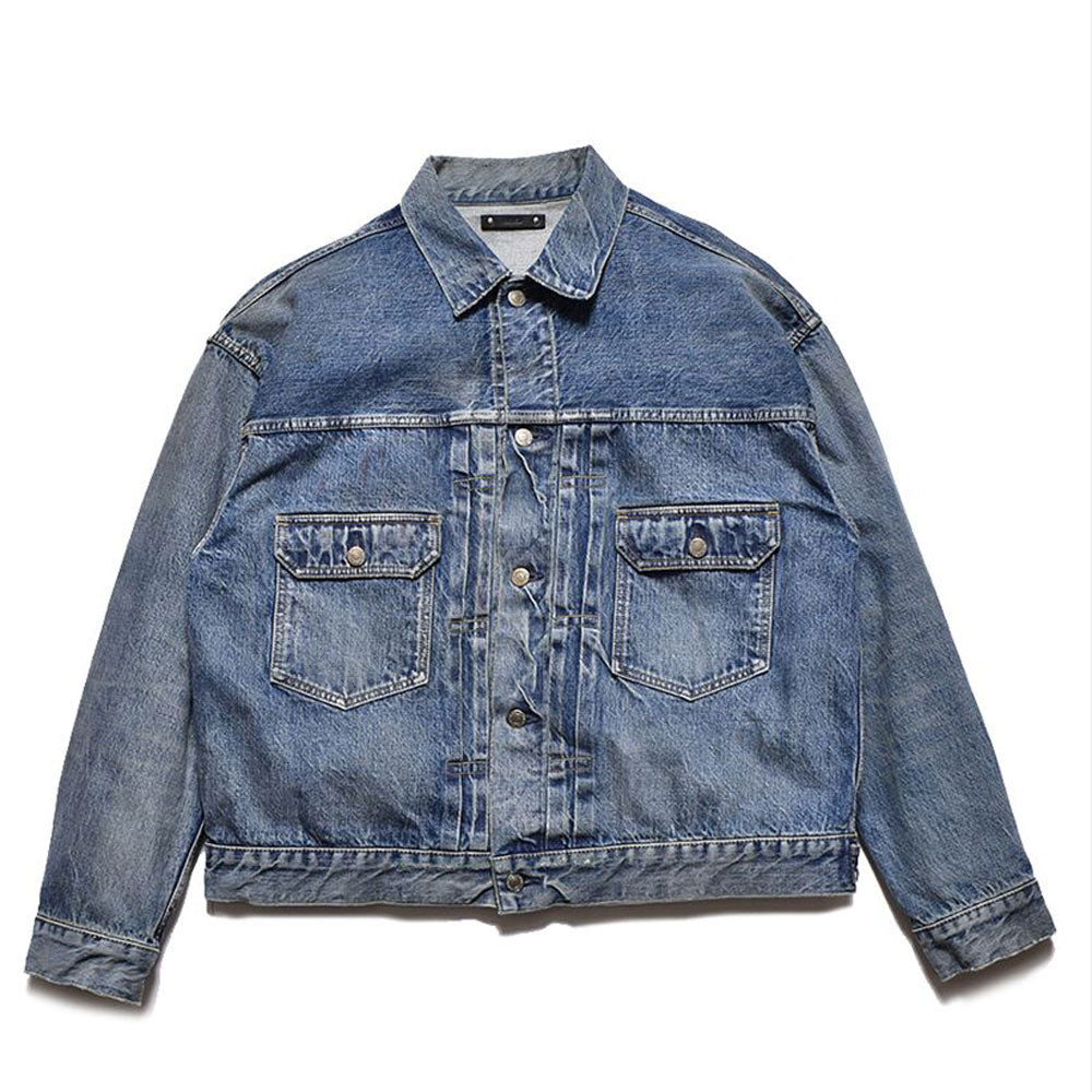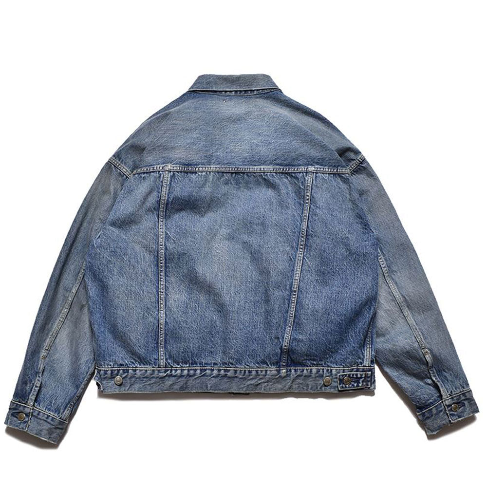 ・Indigo selvedge denim that reproduces the vintage denim of the 1940s is used for the outer fabric without sanforizing (shrinkage prevention) processing. ・Vintage USED processing with a realistic look is created by using it as is. ・Original tack buttons made of iron. ・Denim trucker jacket with an extra big silhouette.