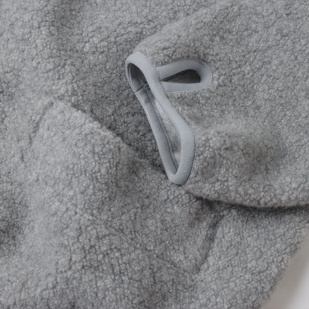 Although it follows the classic cardigan design, the material is recycled wool boa, and the details include stretch binding and thumb holes, making it a great addition to the outdoors. The material is warm, soft, and light, making it an attractive item. A weather badge is included.