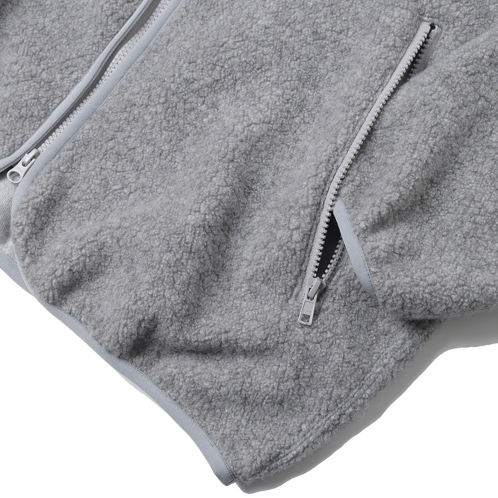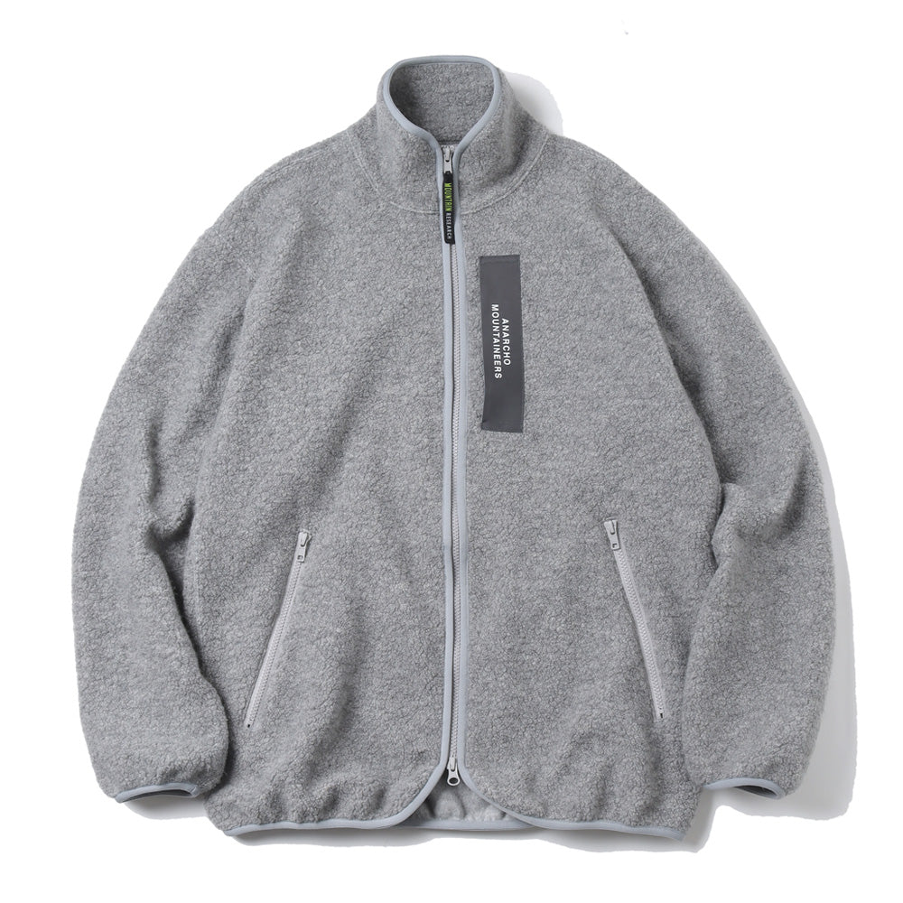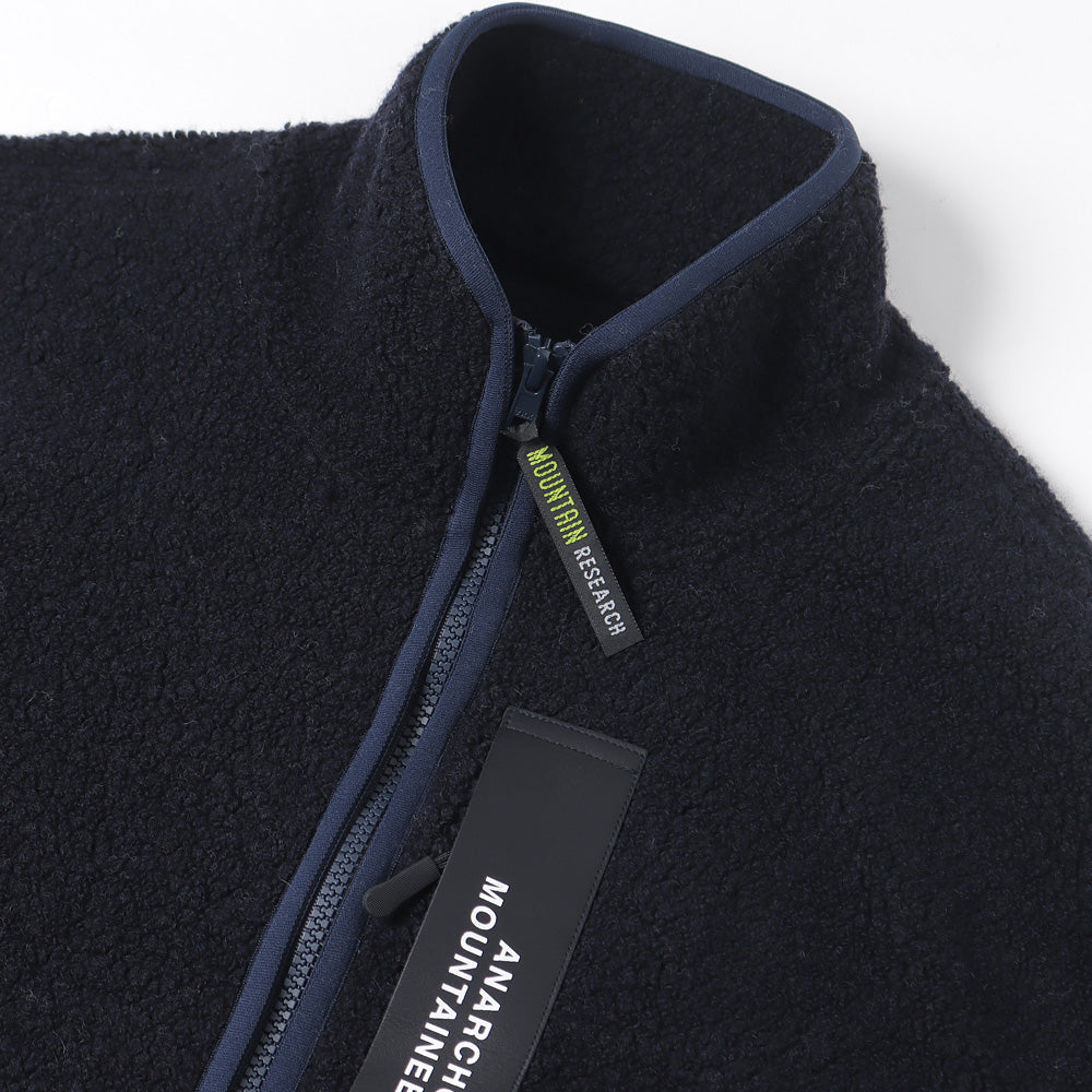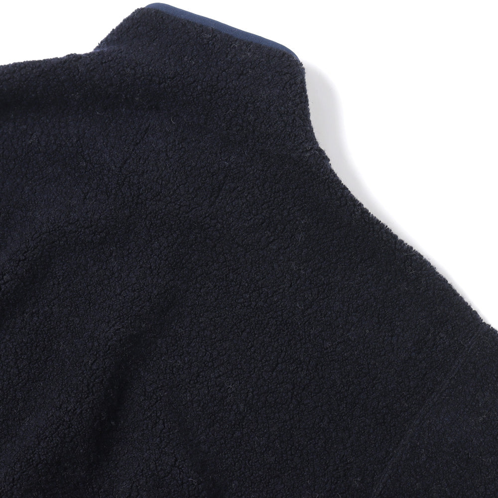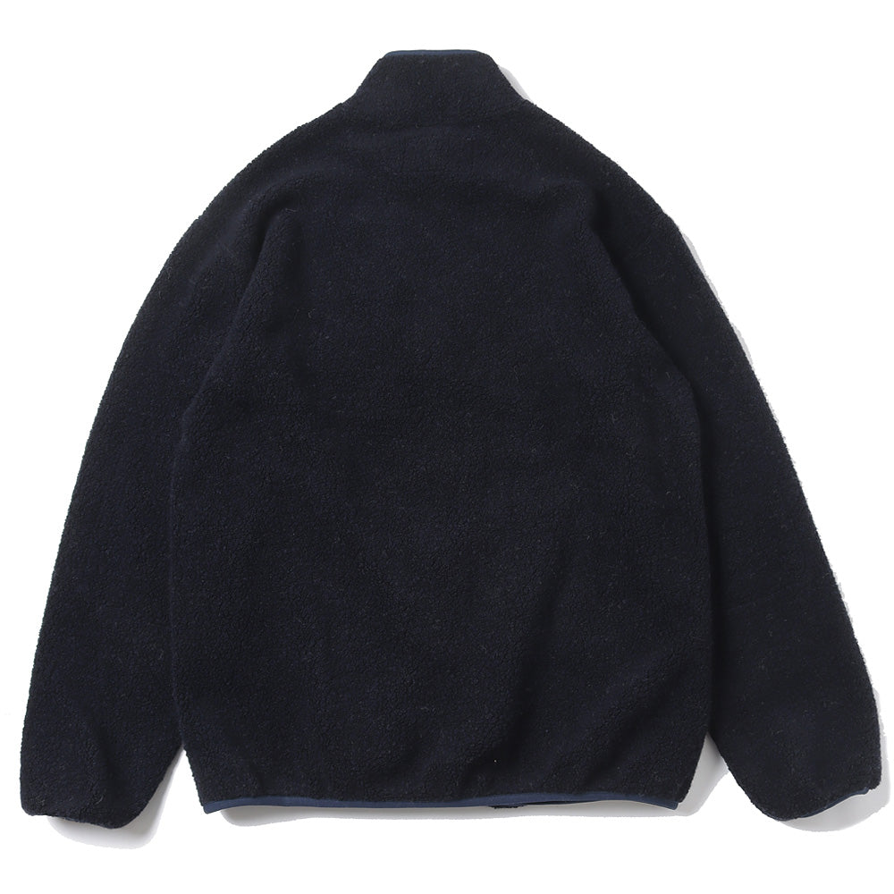 A stretch binding zip-up jacket with the loose feel of 90's fleece. The 23CC season version uses recycled wool boa. This popular design has been updated to be lighter and softer with the updated material, and the fluffy boa adds a loose feel. The spirit of using real leather on the chest pocket opening is still alive and well. A weather word badge is included.