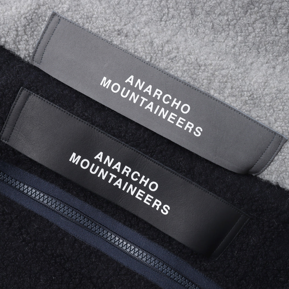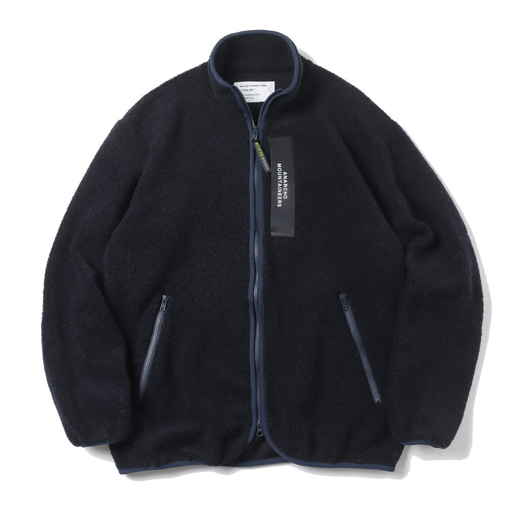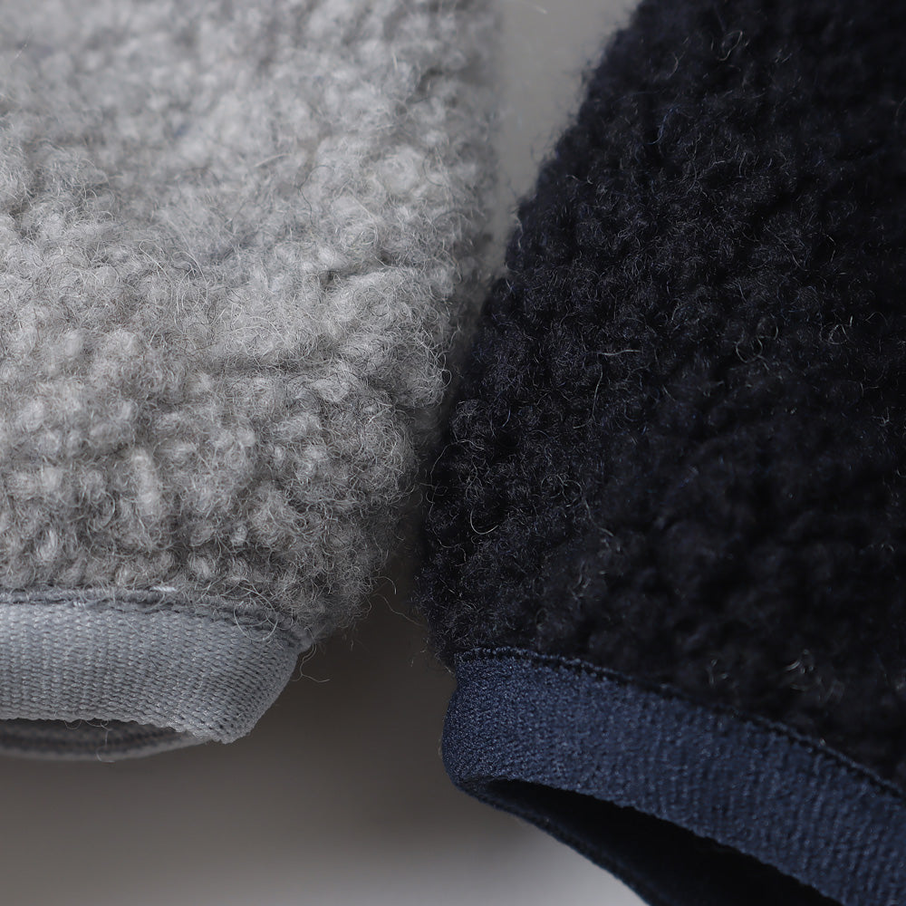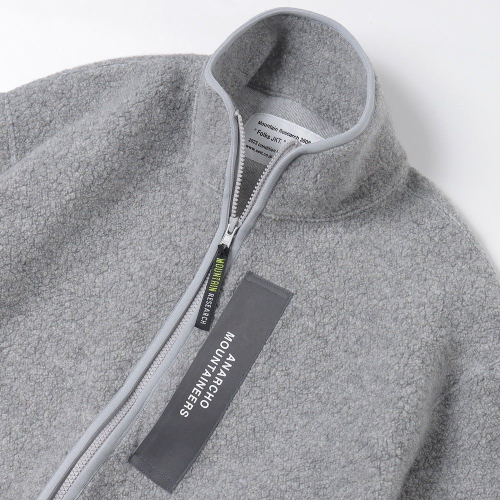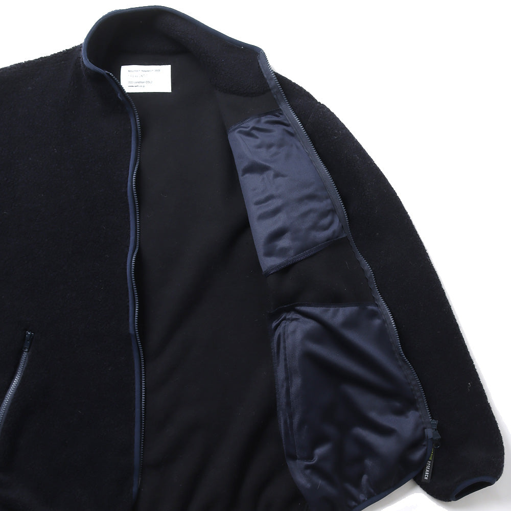 A stretch binding zip-up jacket with the loose feel of 90's fleece. The 23CC season version uses recycled wool boa. This popular design has been updated to be lighter and softer with the updated material, and the fluffy boa adds a loose feel. The spirit of using real leather on the chest pocket opening is still alive and well. A weather word badge is included.