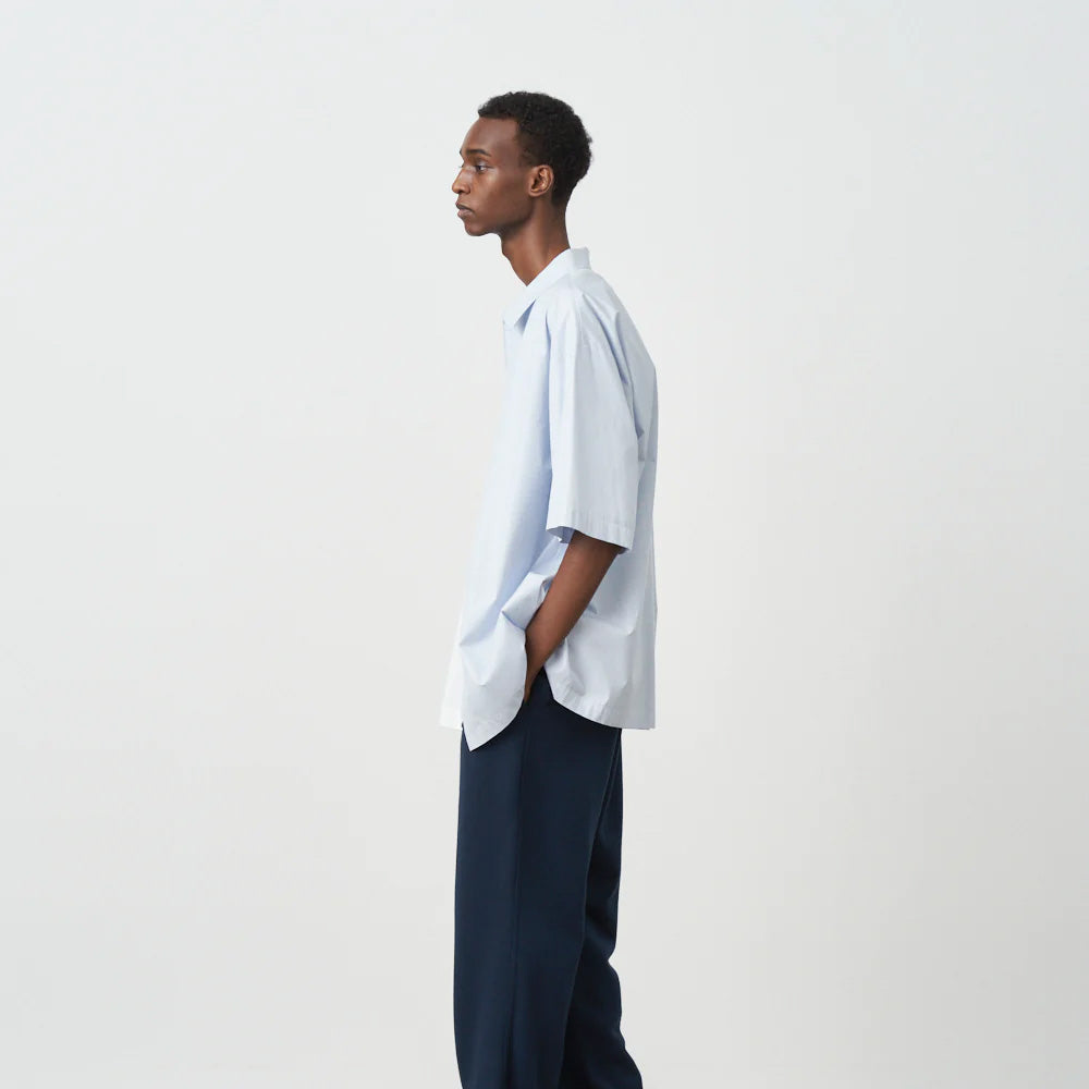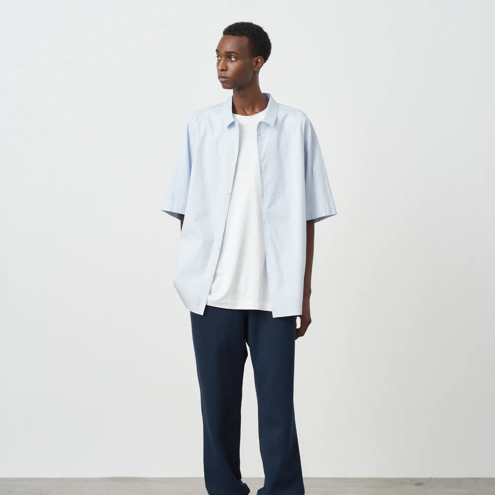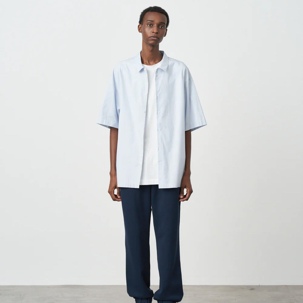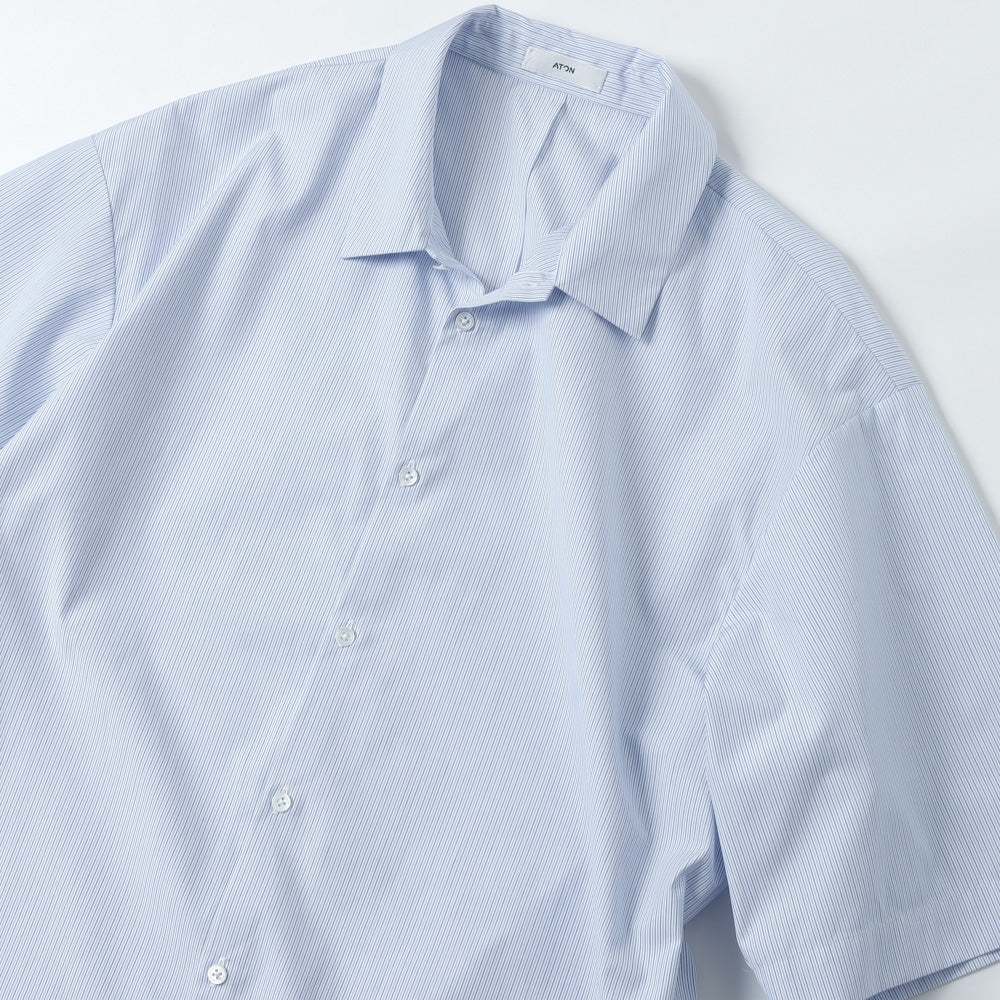 This is ATON's classic short-sleeved shirt, featuring a moderately oversized silhouette. It is an open-neck shirt with no stand collar.