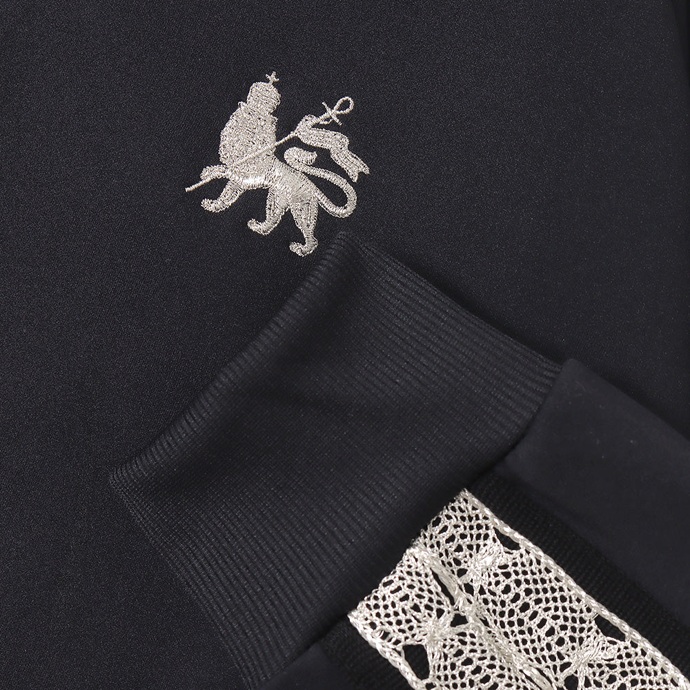There is a lion embroidered on the left chest and lace tape embroidery on both sleeves.