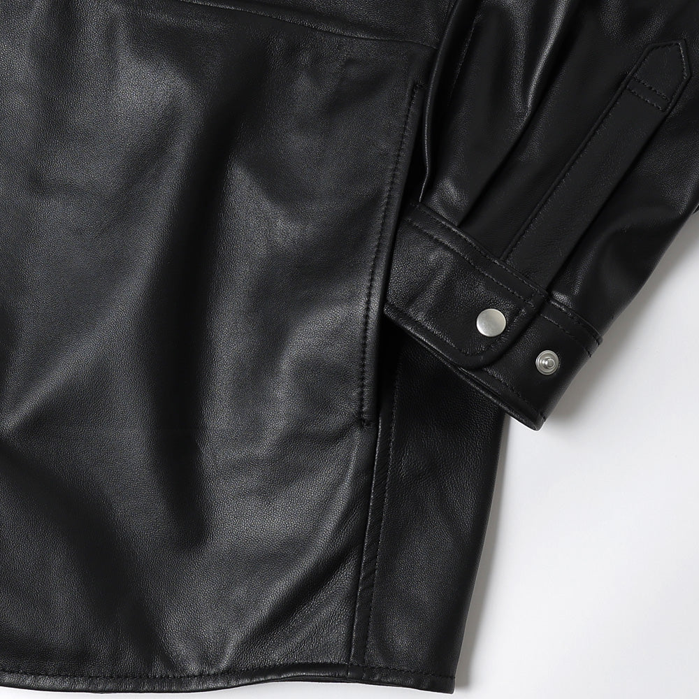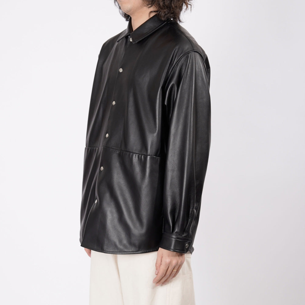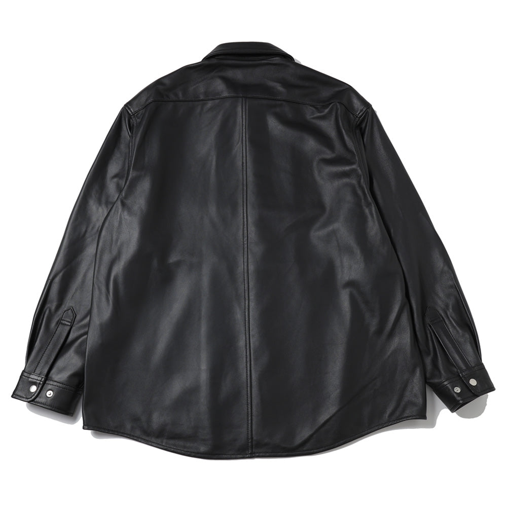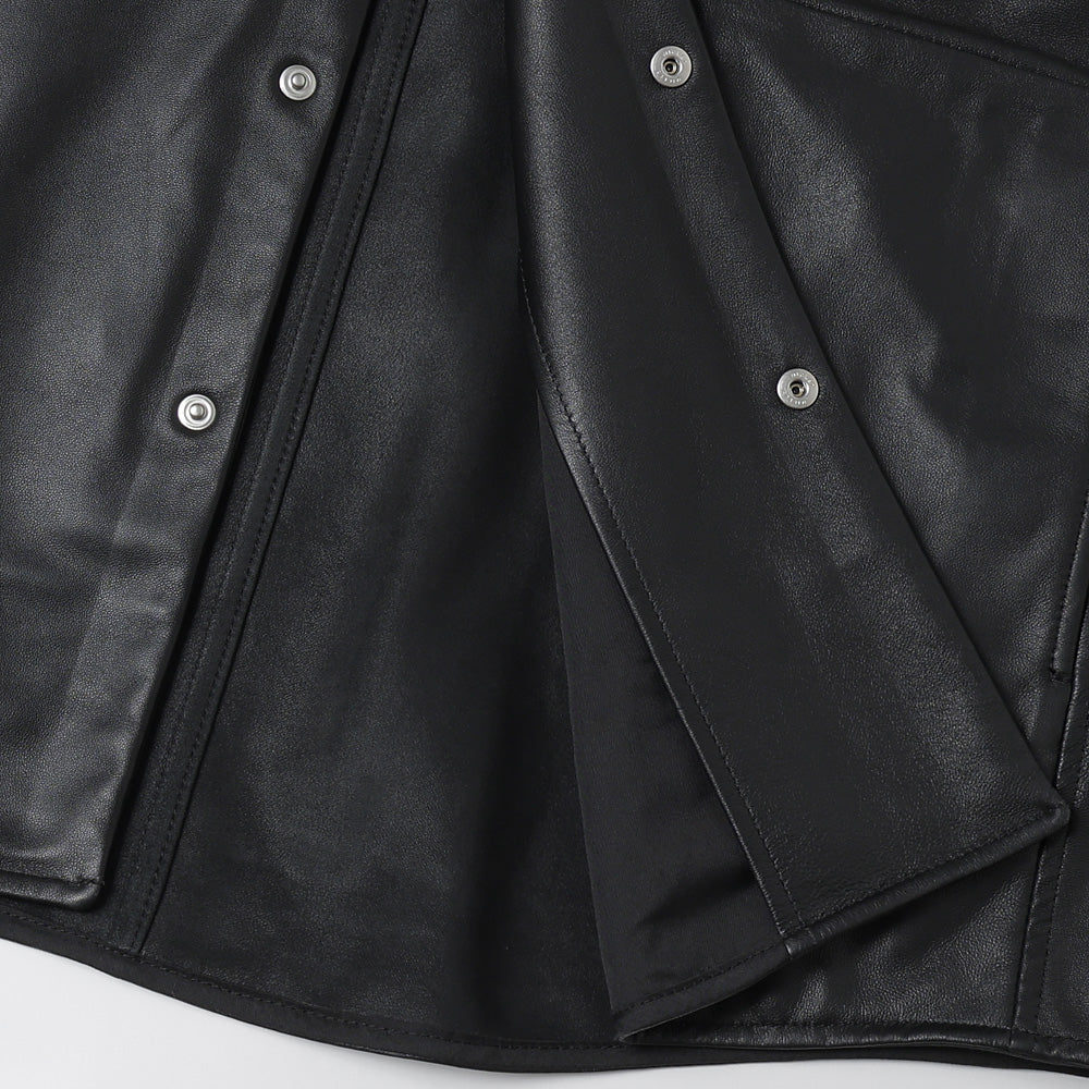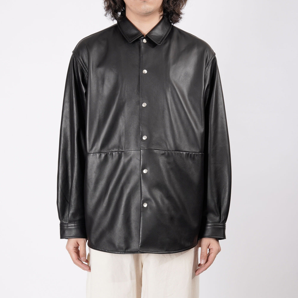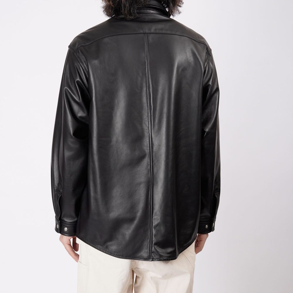 This slightly oversized shirt is made from leather that has been thinned as thin as possible so that it can be worn as a jacket.