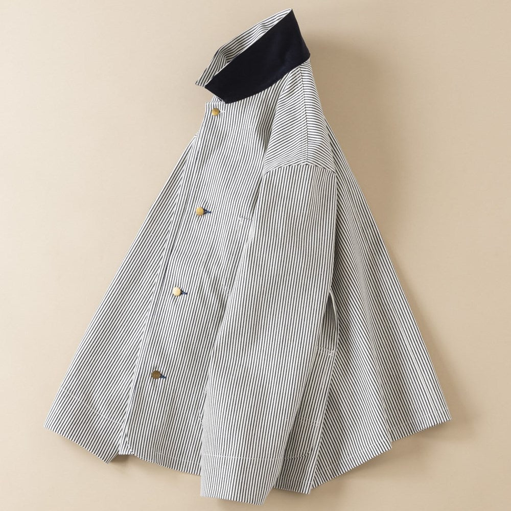 Faux suede is used on the back of the collar and the hanger loop at the neck to add an accent and adjust the overall balance.