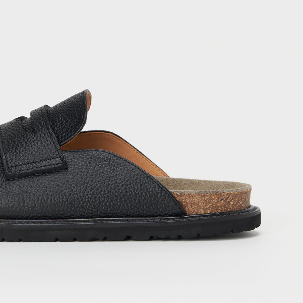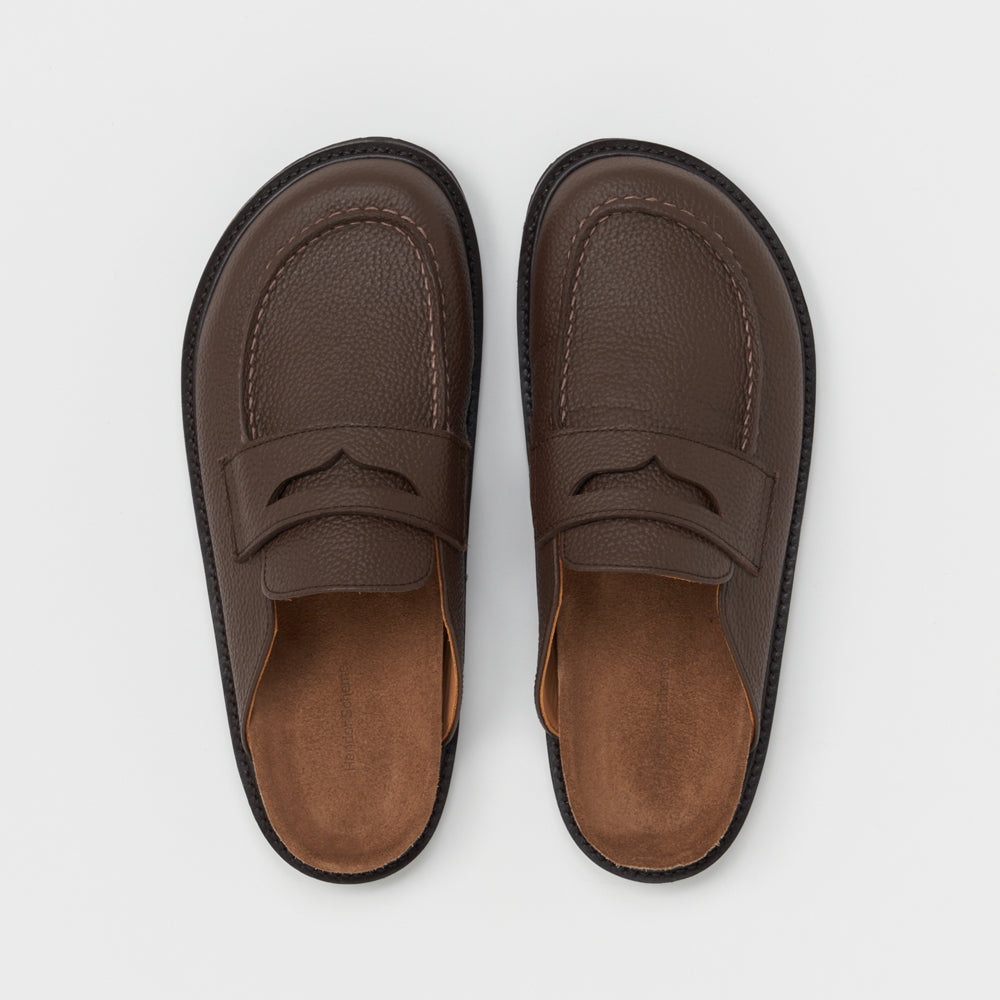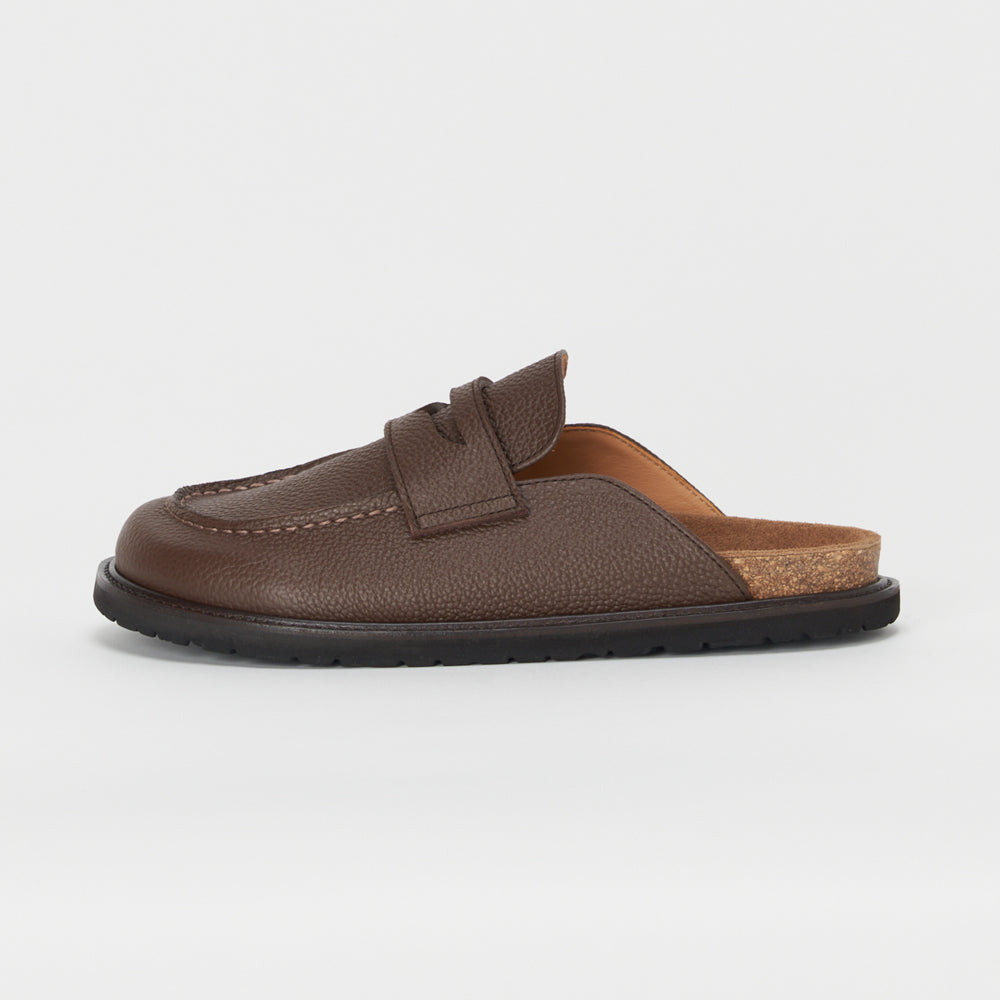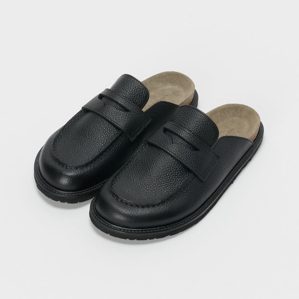 The contrasting focus on combining classic loafers and mules is also reflected in the materials used, such as embossed grained leather and velour leather footbed.
