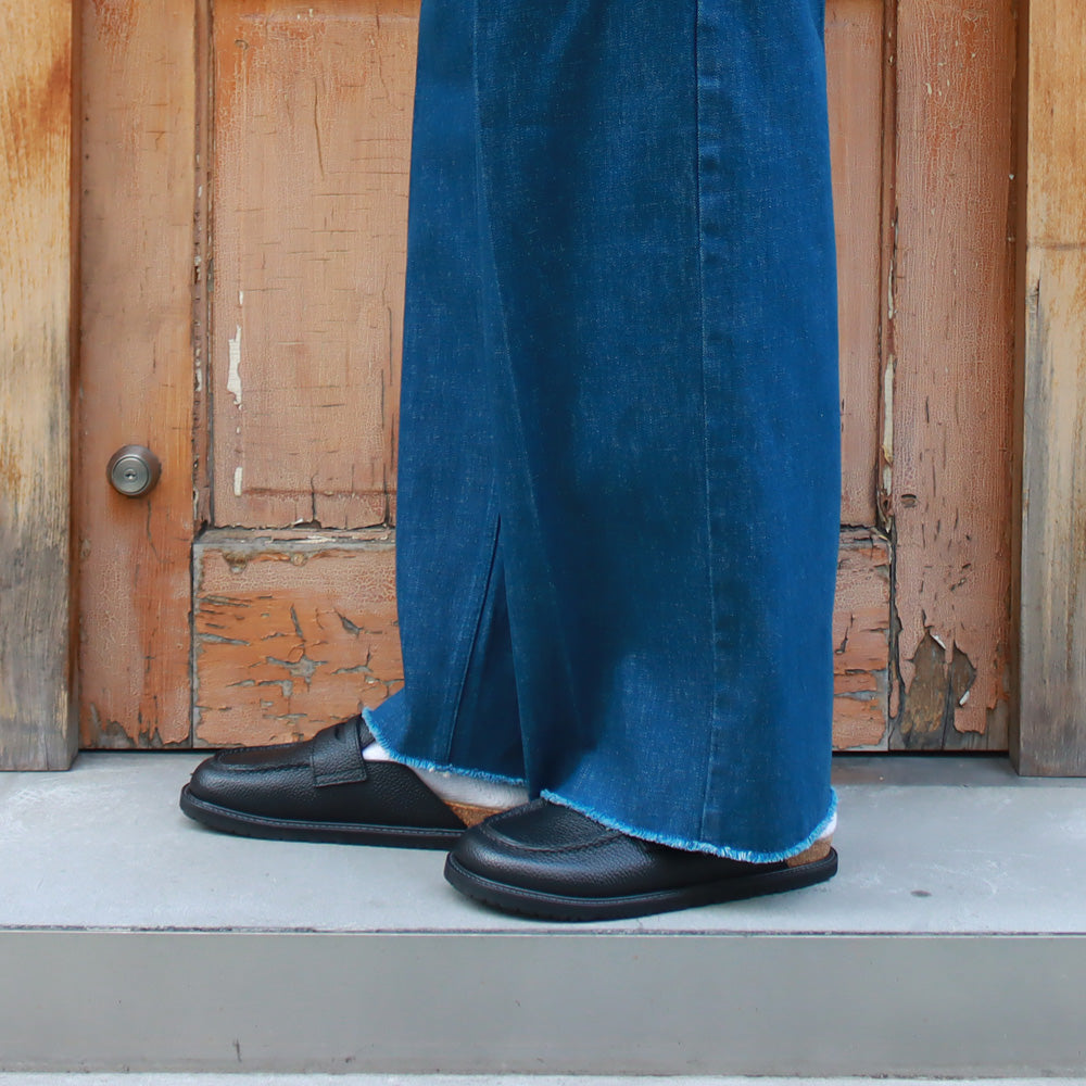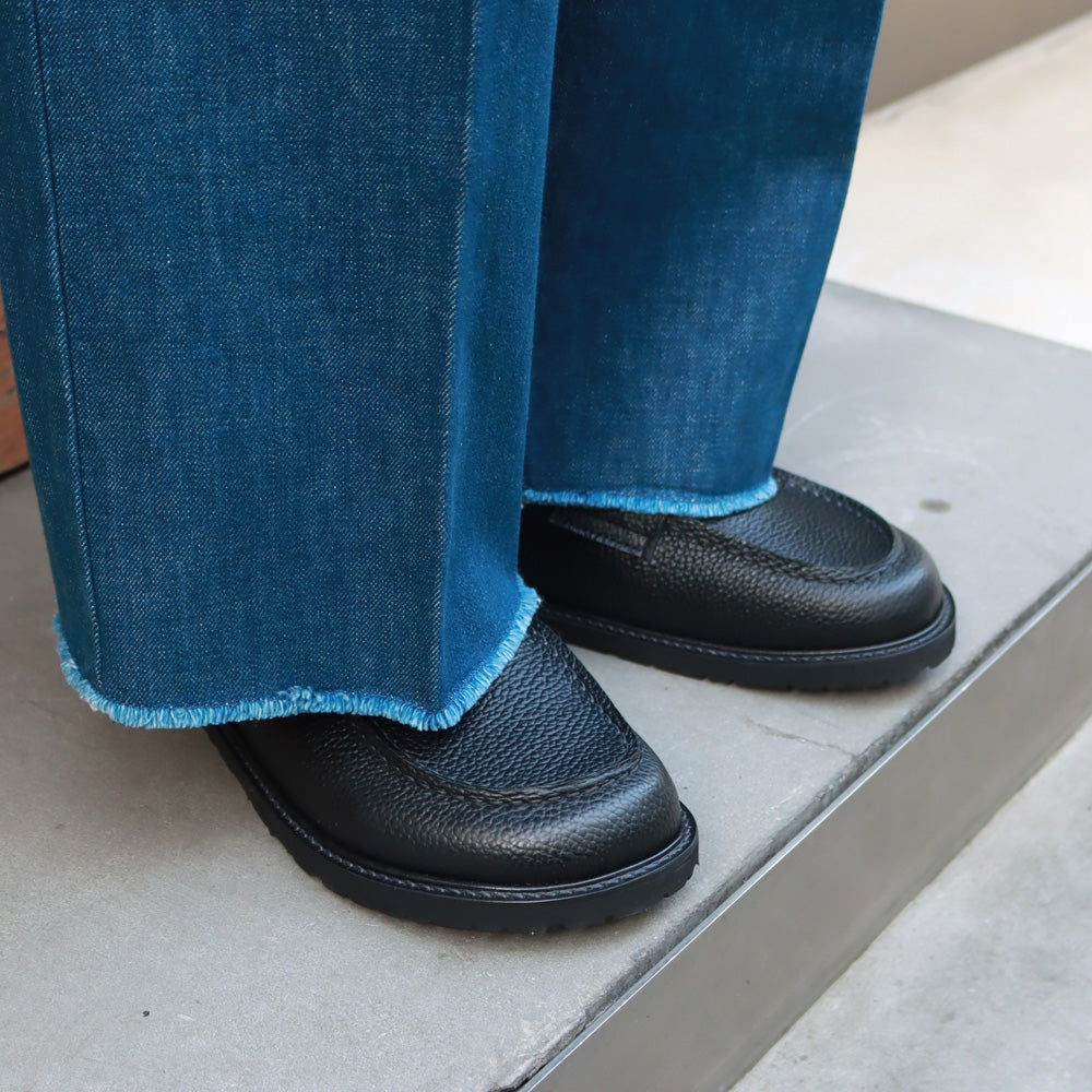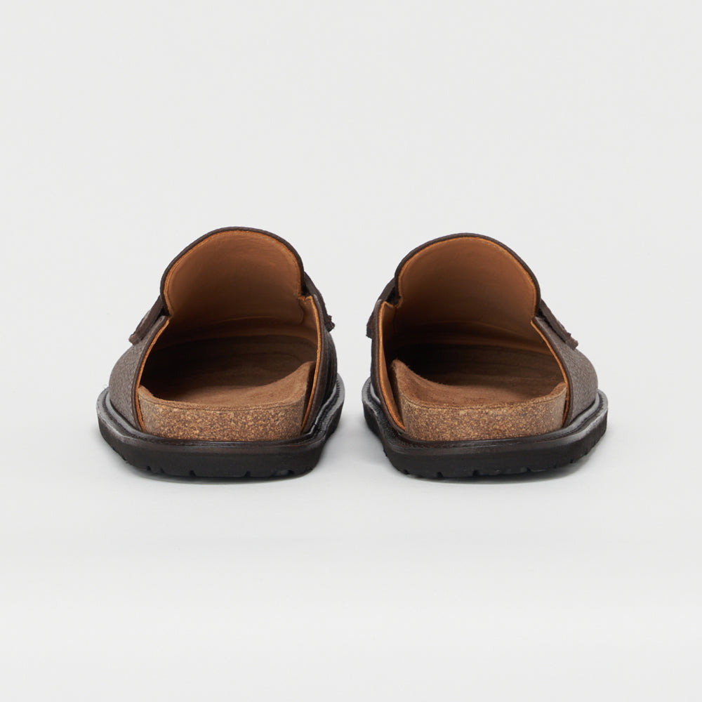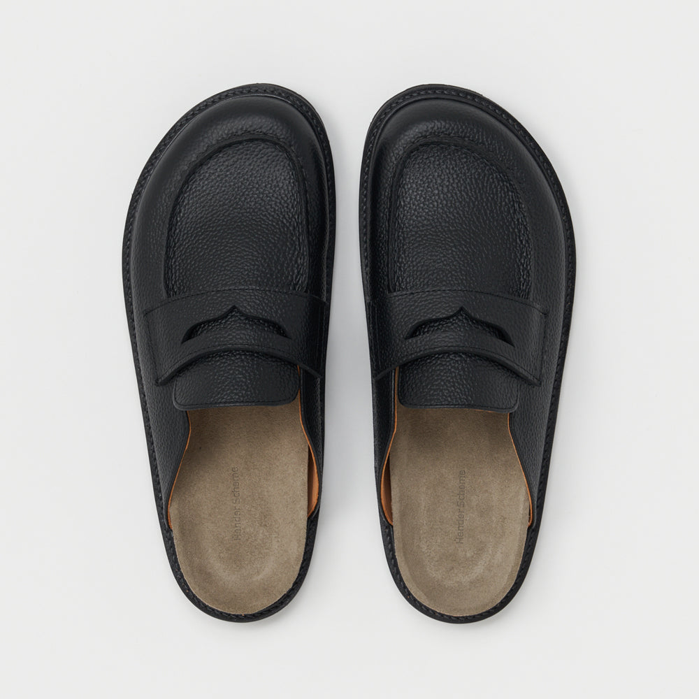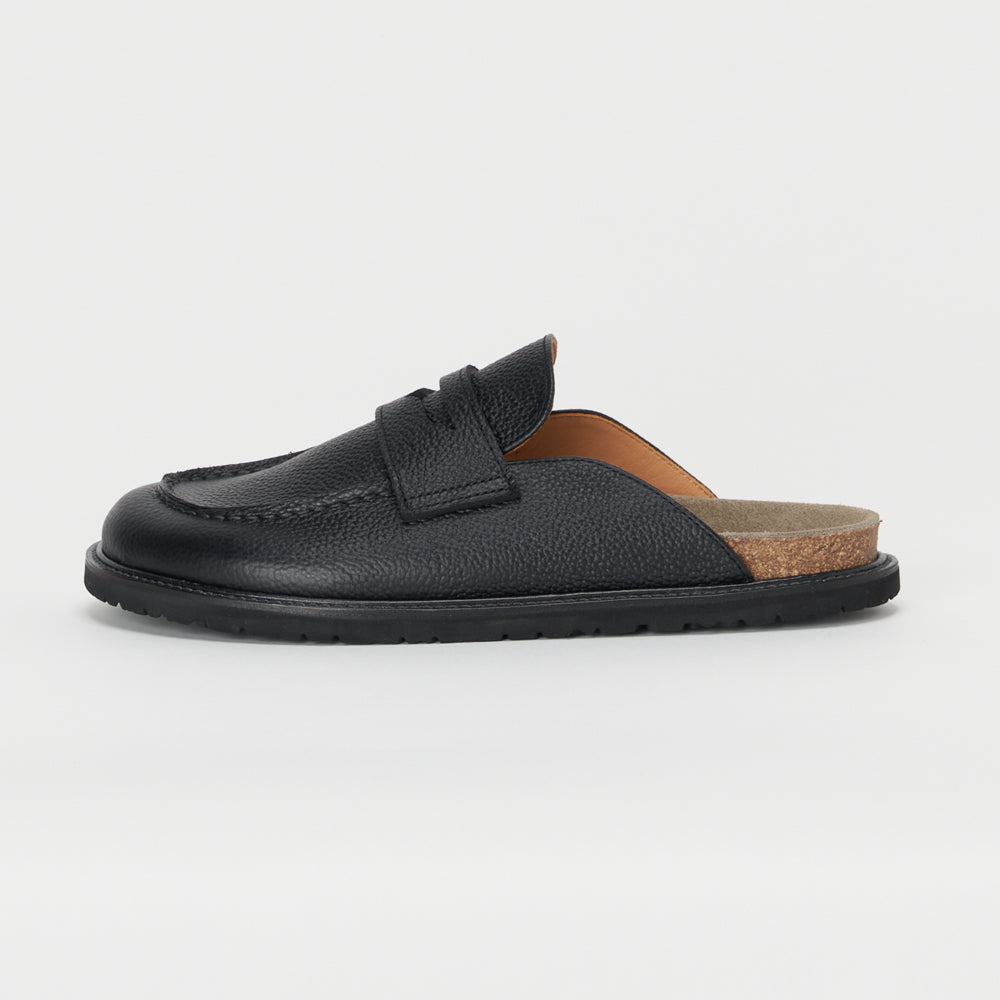 The contrasting focus on combining classic loafers and mules is also reflected in the materials used, such as embossed grained leather and velour leather footbed.