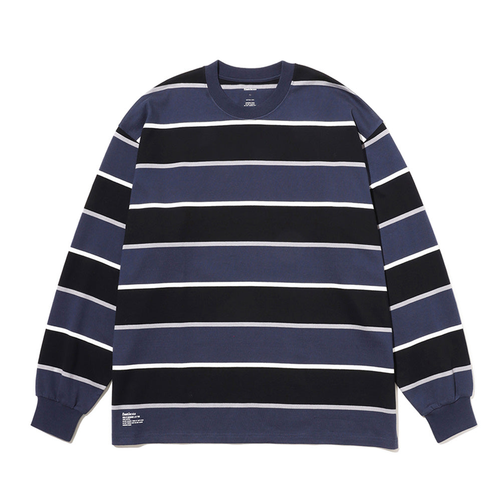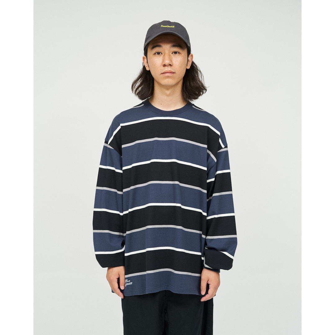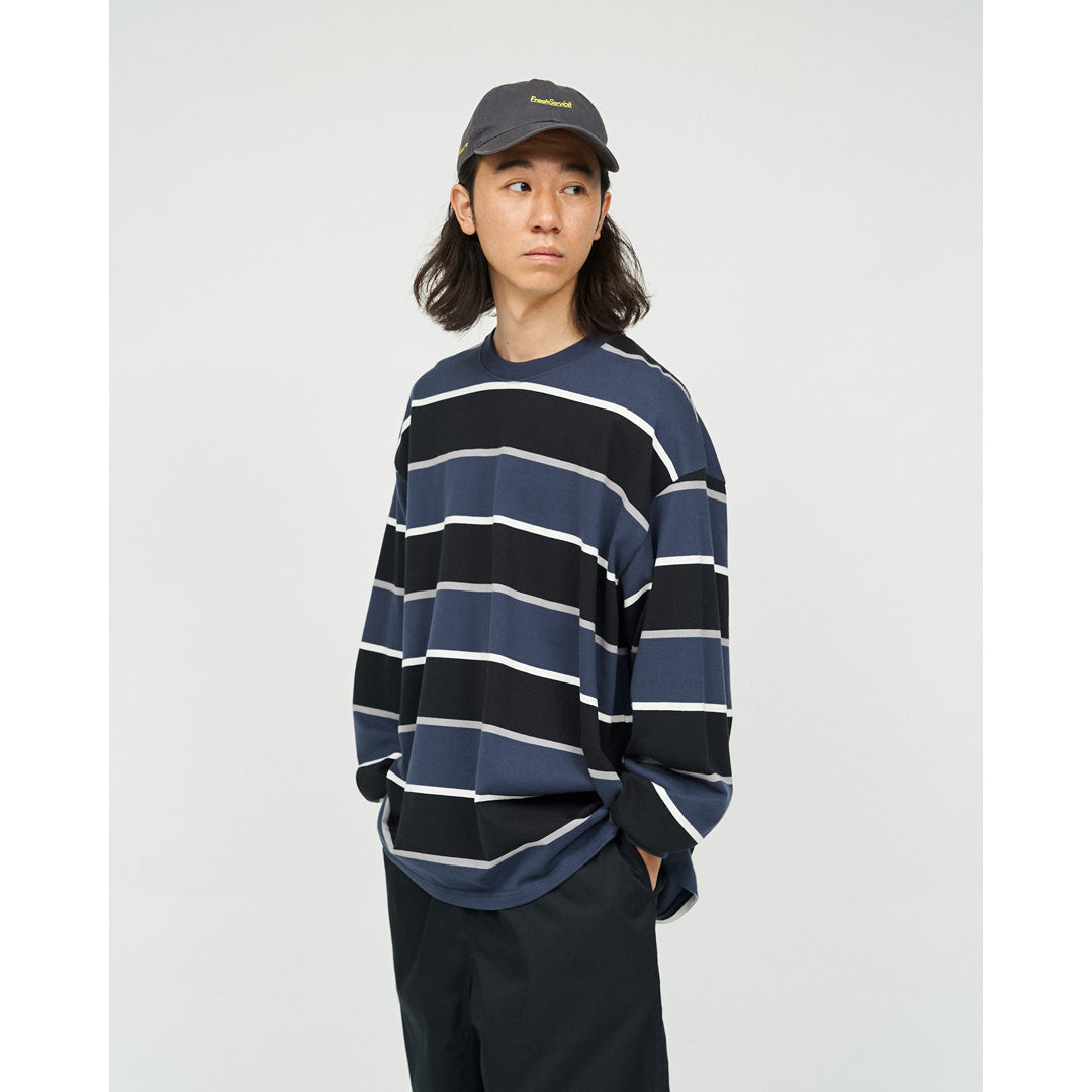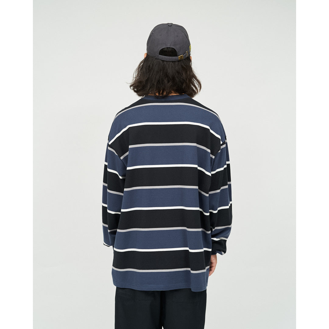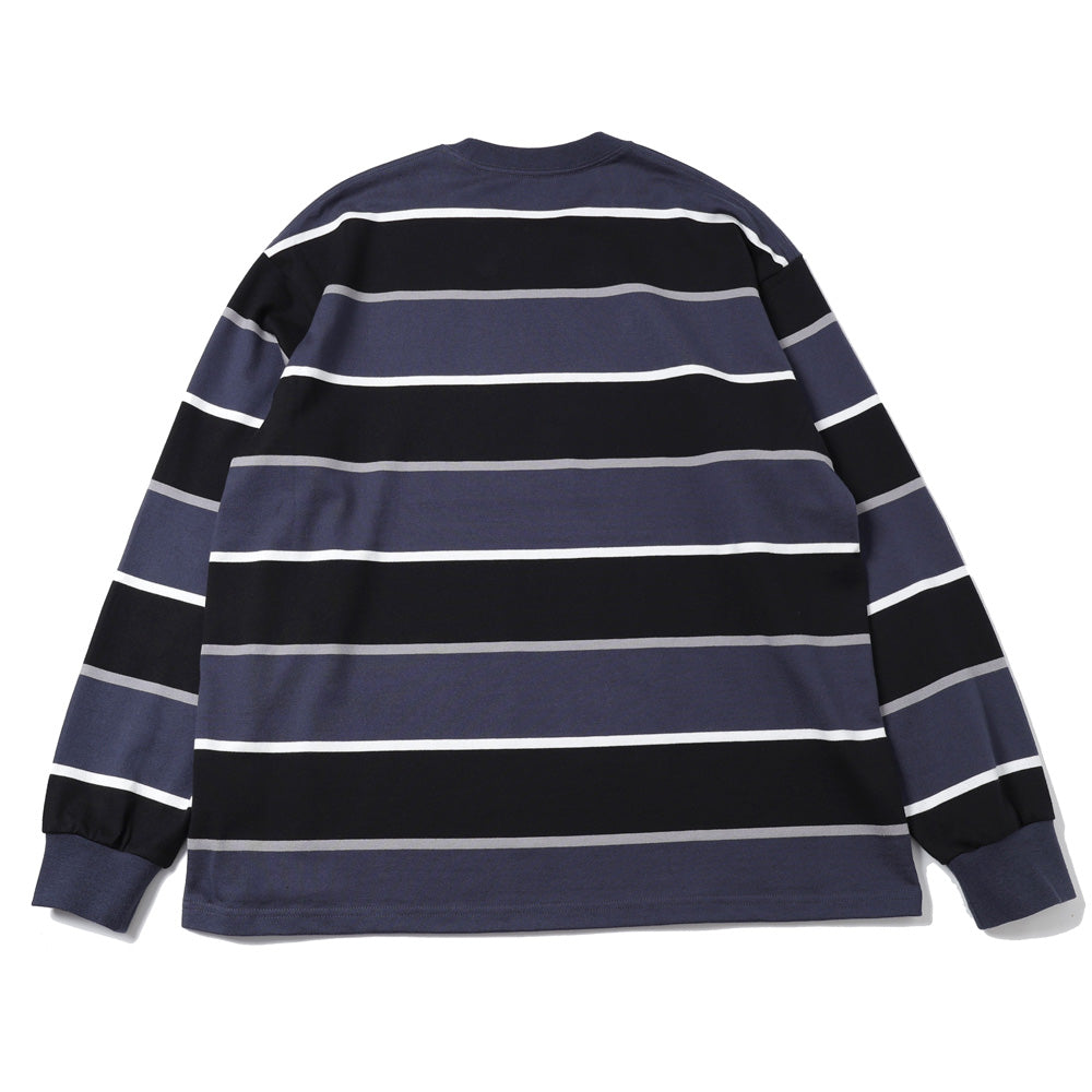 A striped series with new patterns each season. It features a wide-pitch striped pattern inspired by rugby shirts. The 100% cotton body has a fleshy yet soft feel. Oversized fit with short sleeves.