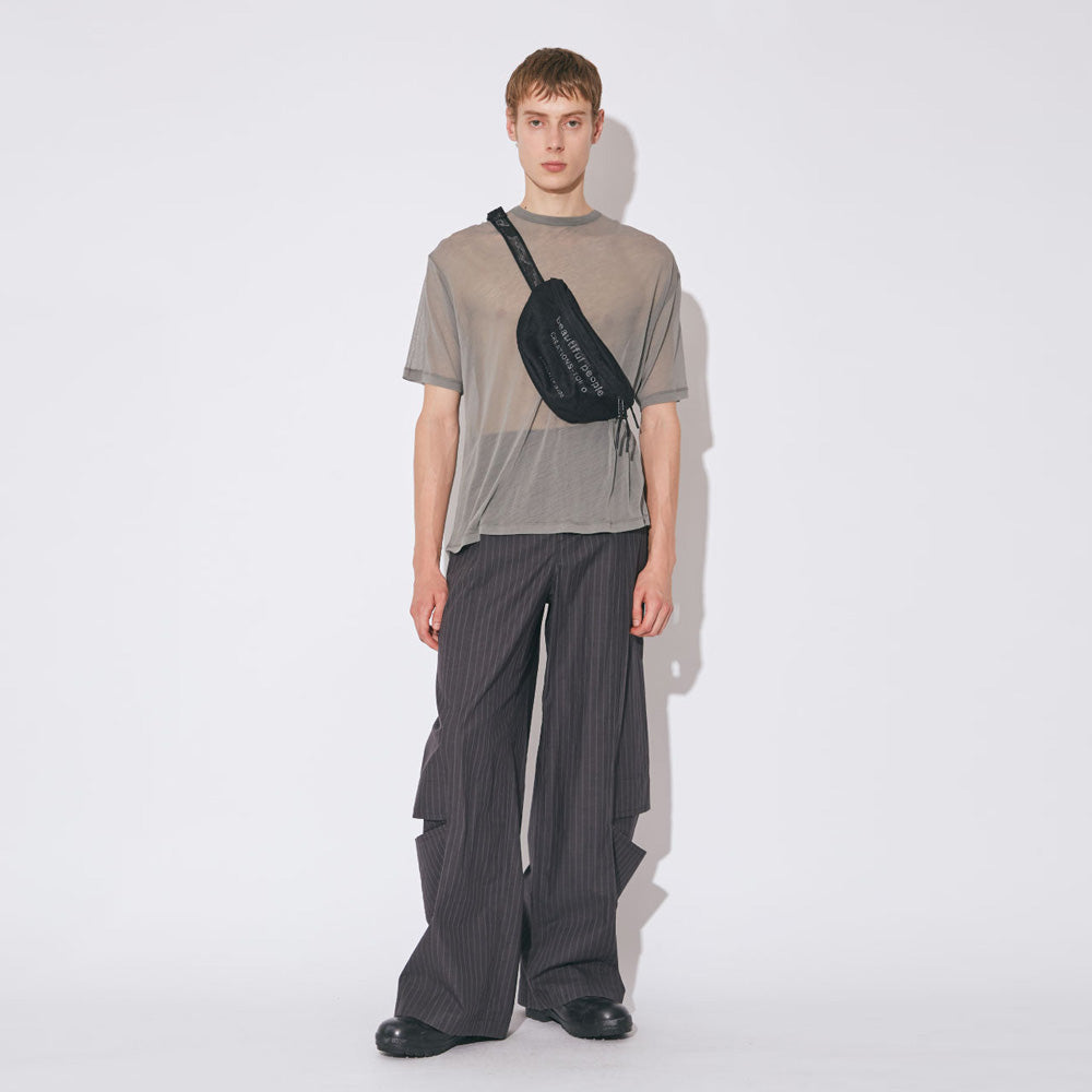 ・A body bag made from a transparent material ・Using original tape with a sheer and glossy finish ・Logo printed on the mesh interior ・The inner lining and seams of the bag are visible as if through an X-ray ・Can store a wallet and smartphone