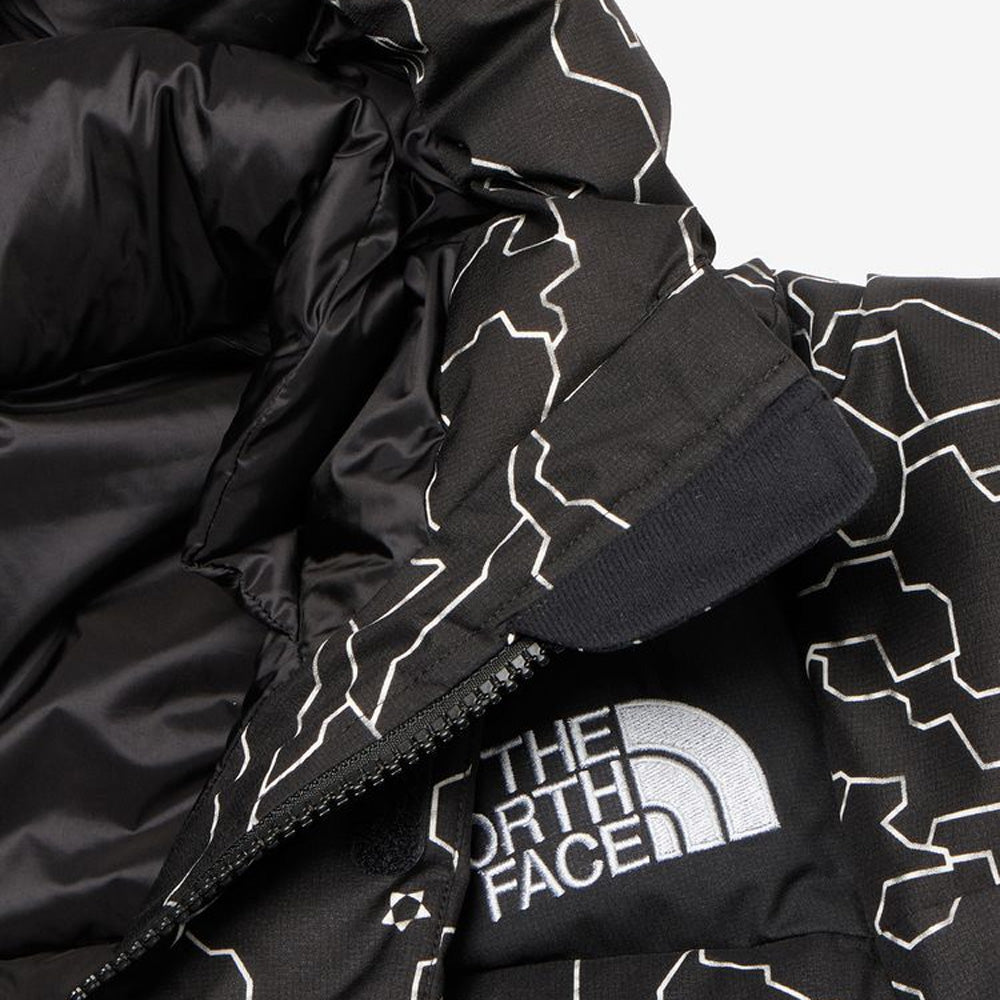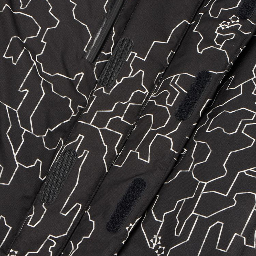 Double flap front / Two bottle pockets inside / One-hand adjuster hood / Waterproof zippers on both chest pockets / Down-filled inner collar