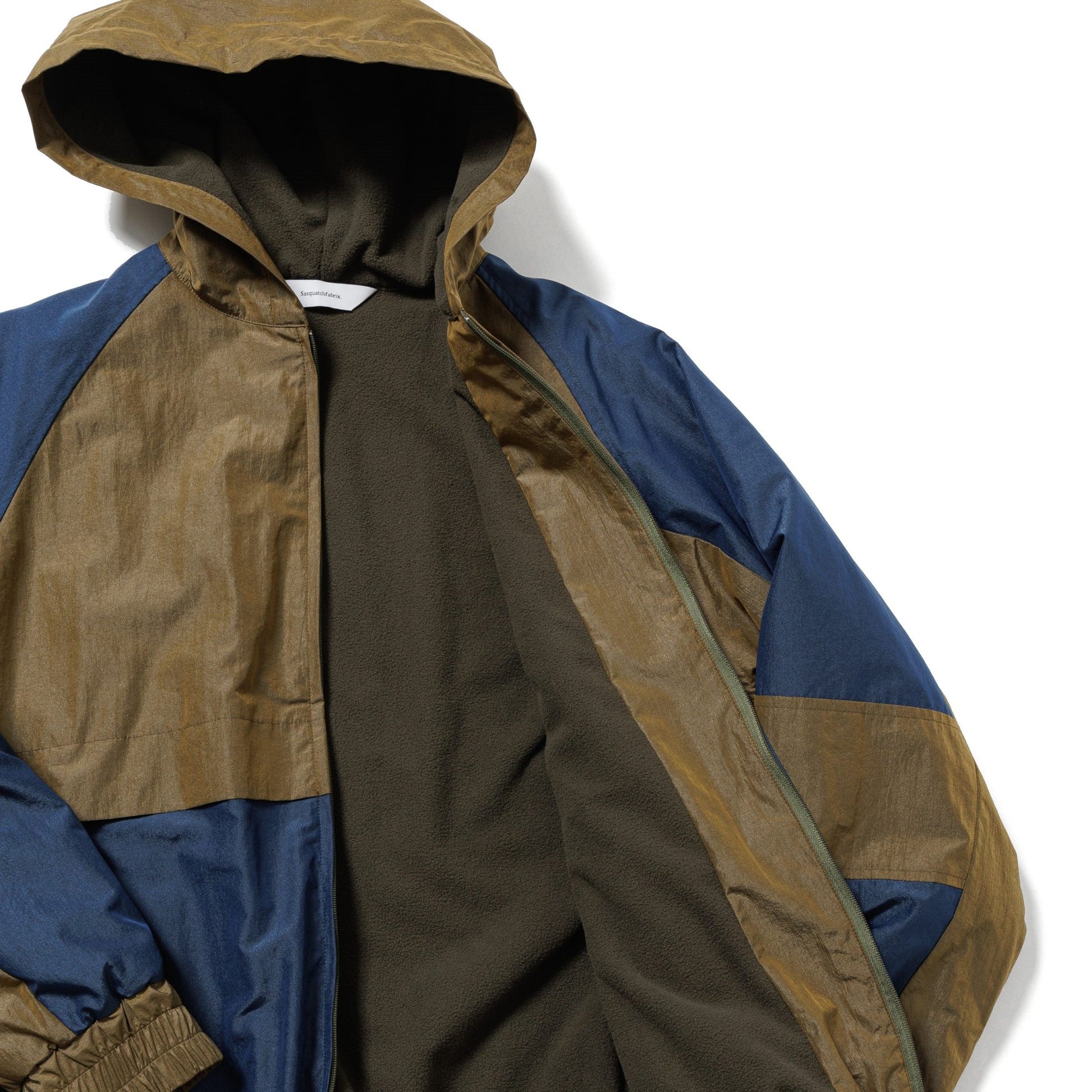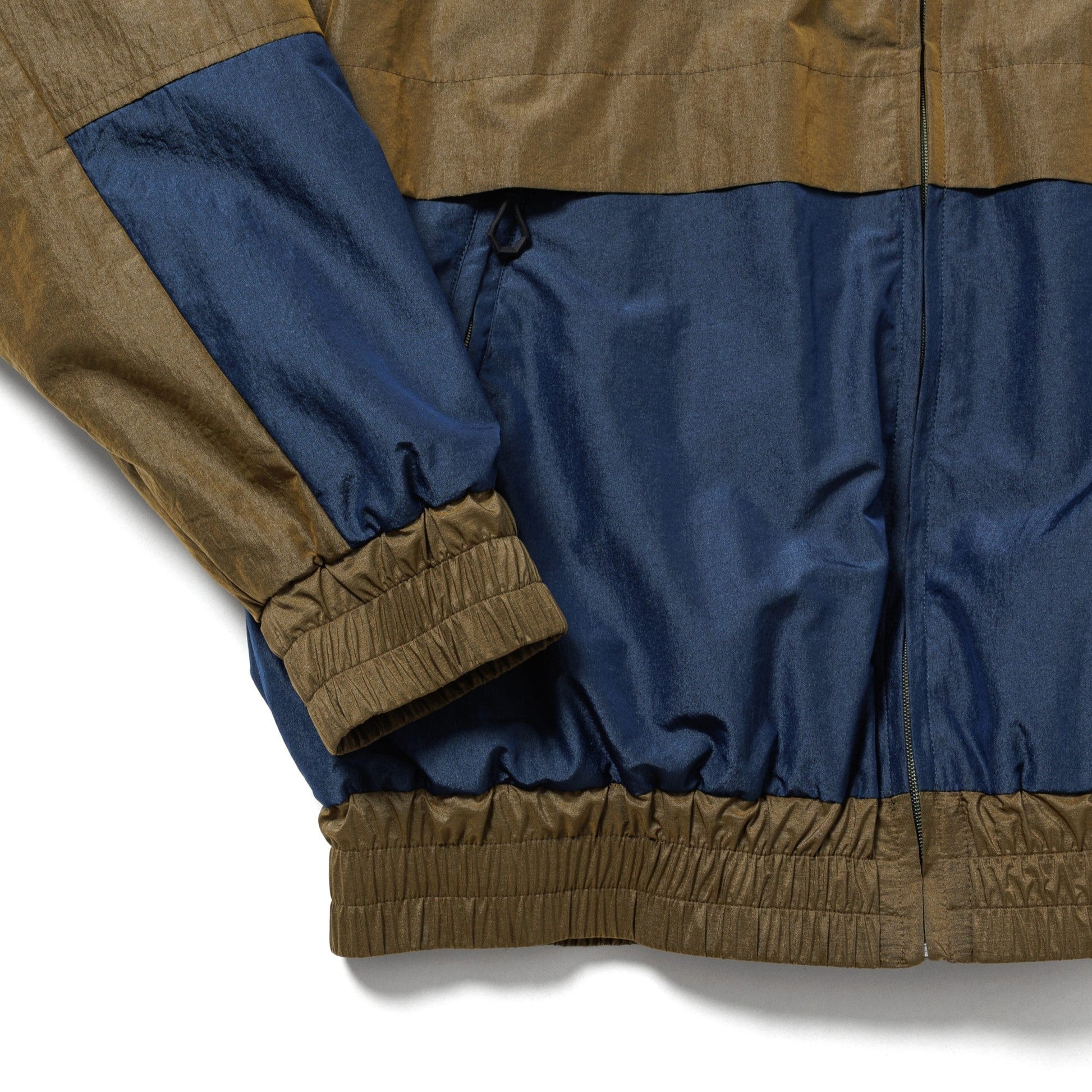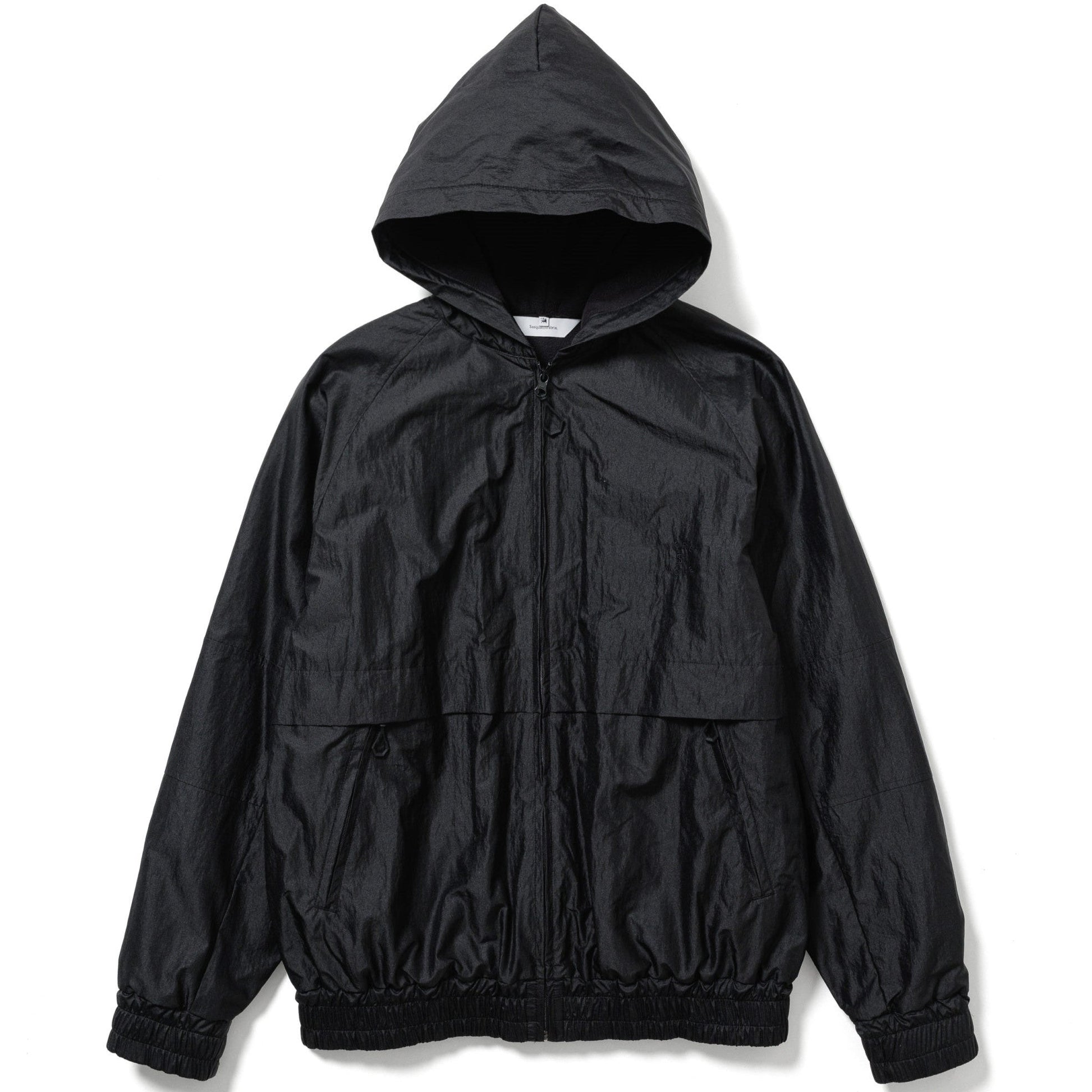 A track hoodie made from shiny, crisp nylon fabric.