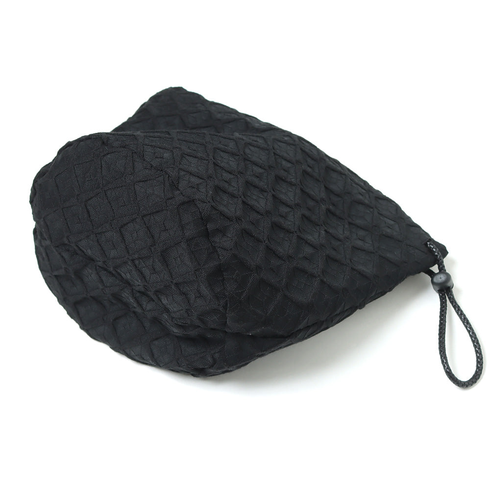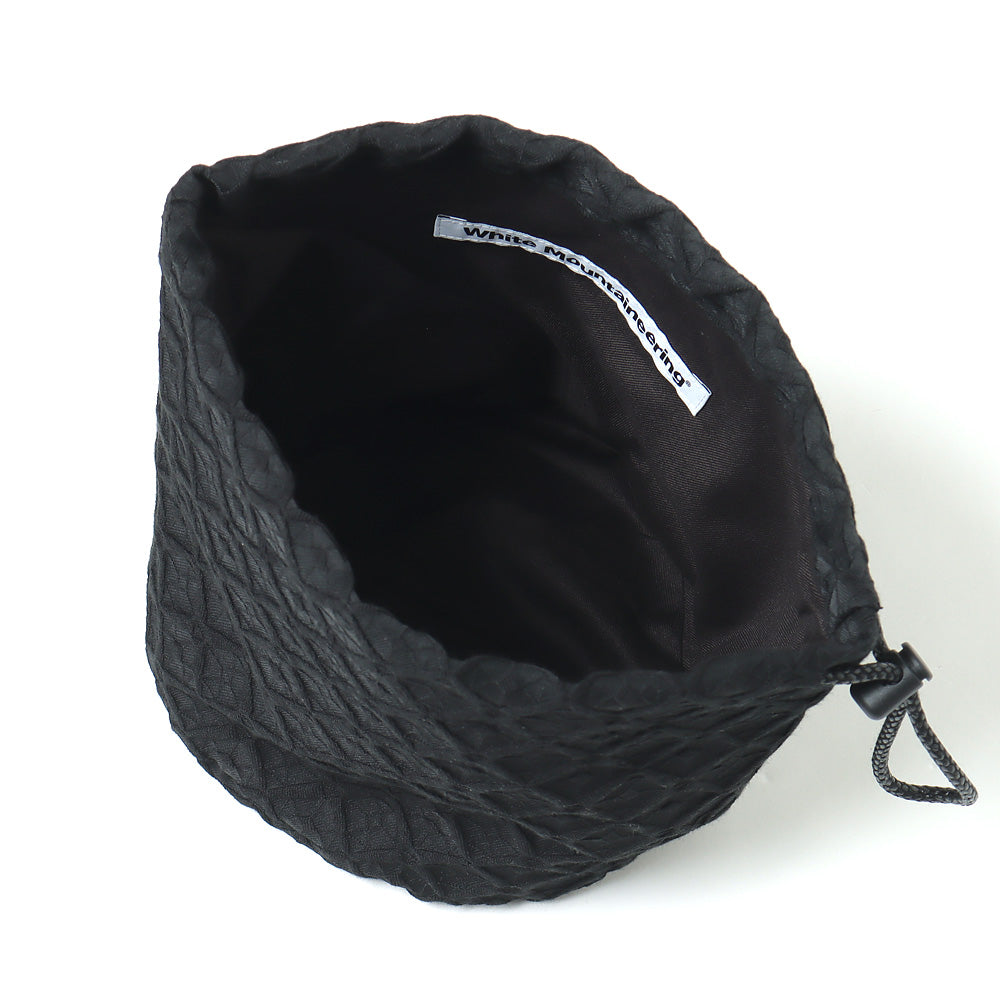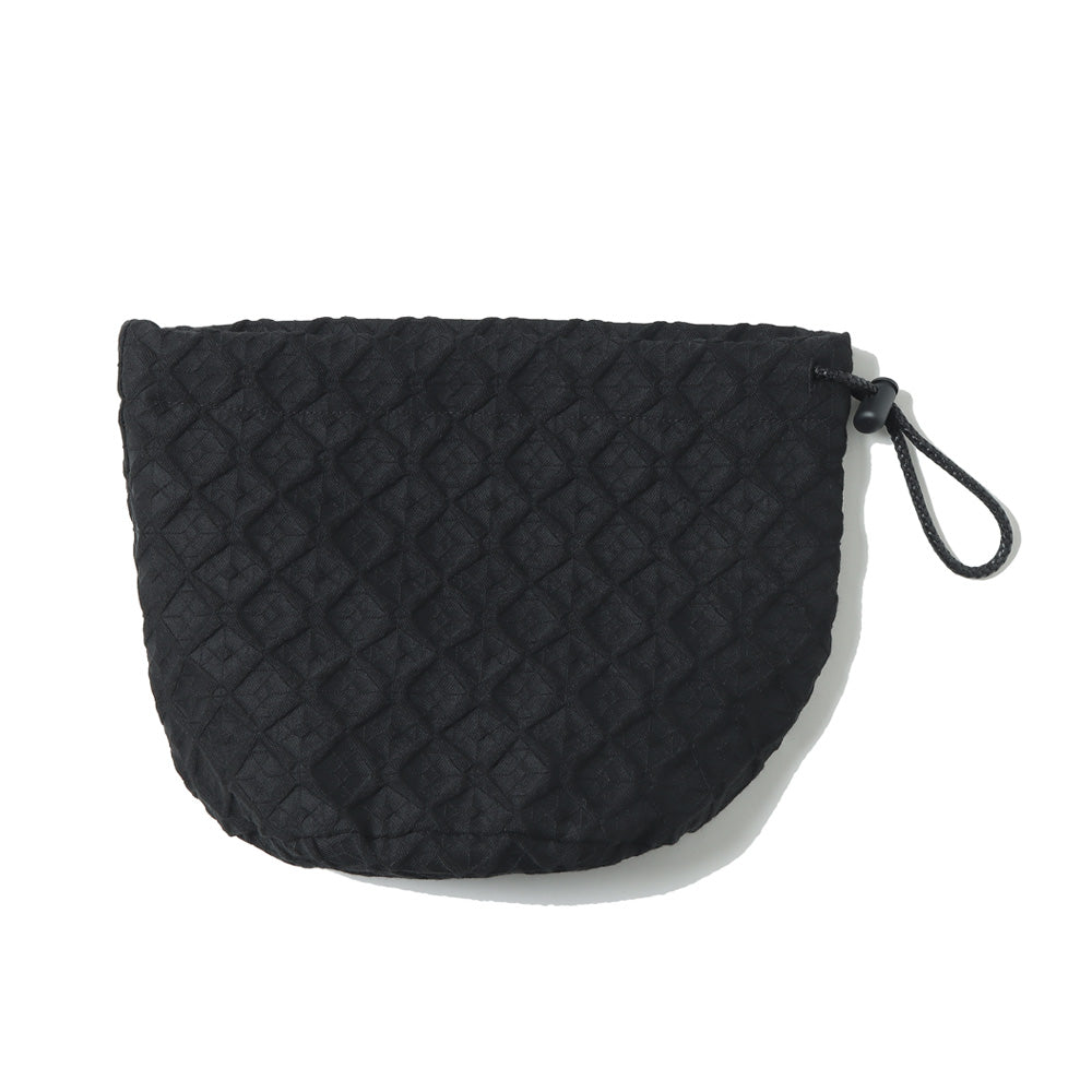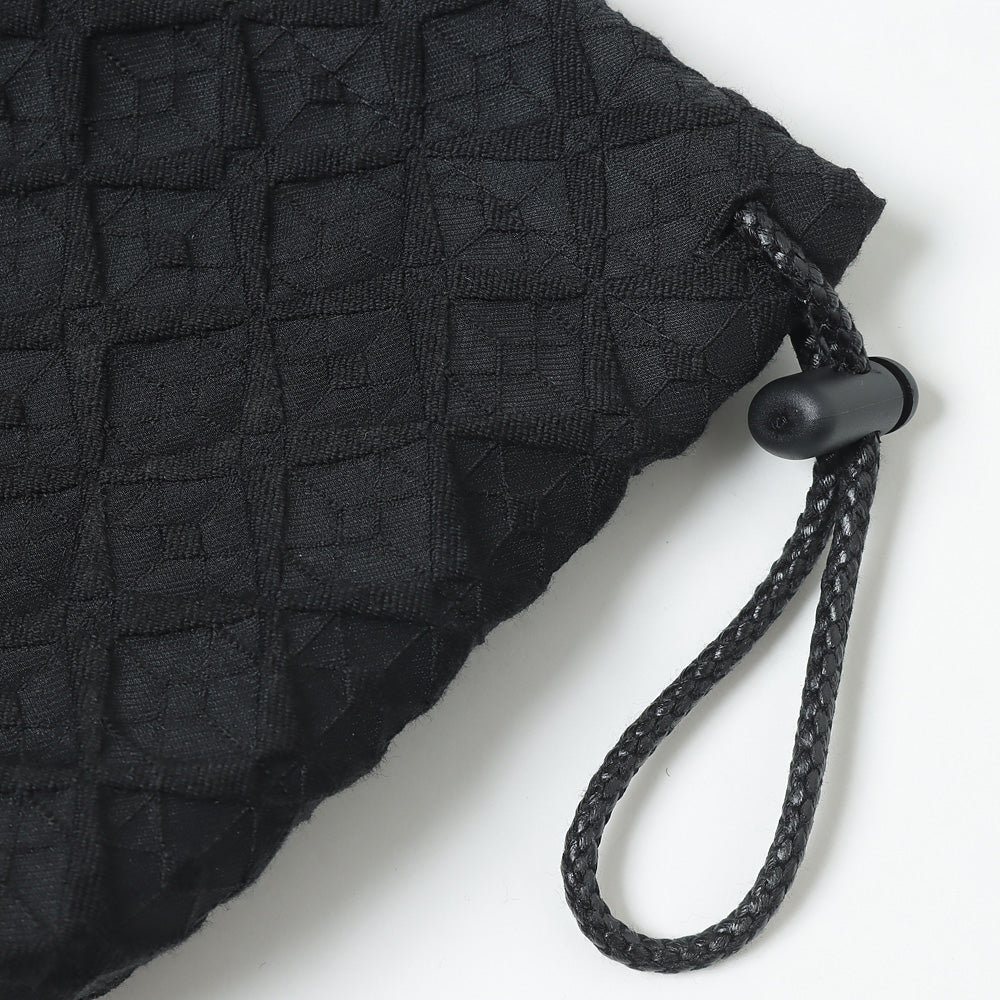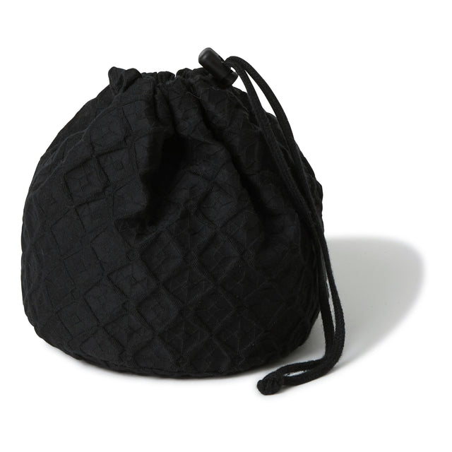 This drawstring pouch is made from an original inlaid jacquard fabric, woven so that the pattern stands out due to the difference in shrinkage between the vertical and horizontal nylon threads and thick cotton threads.