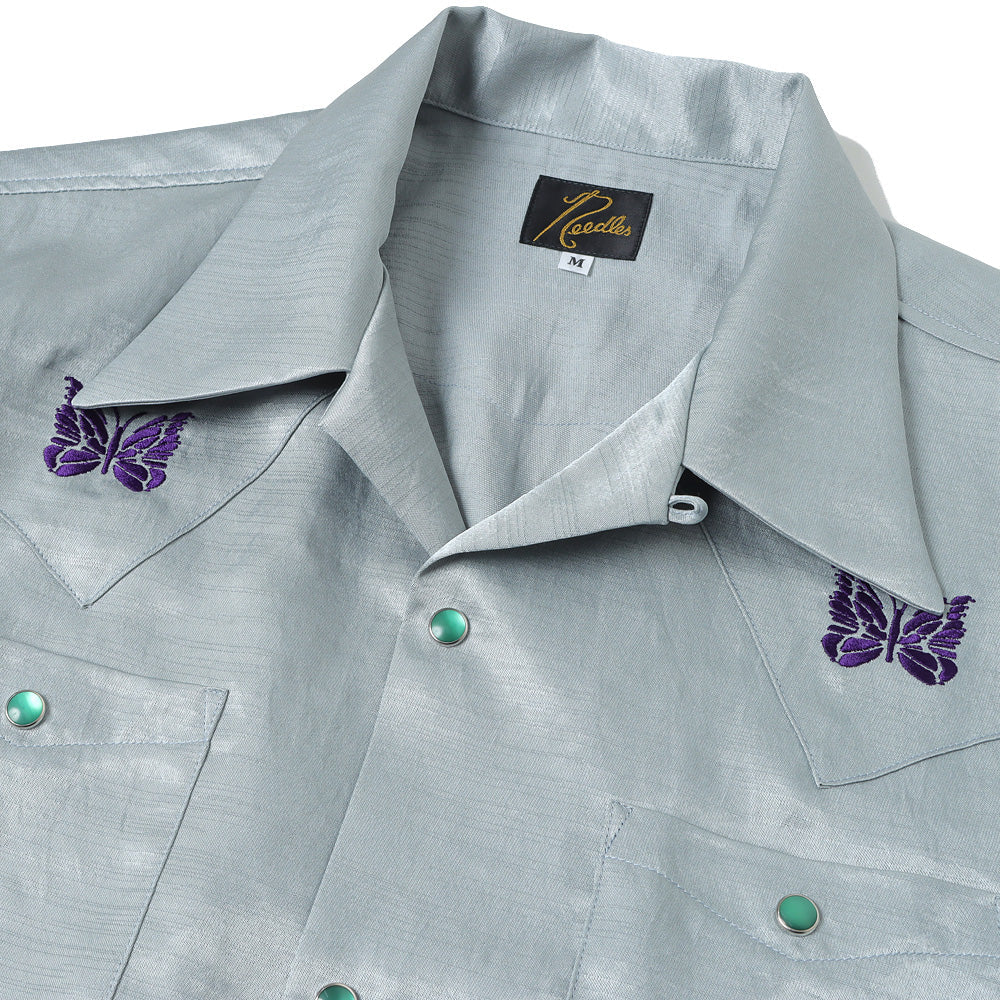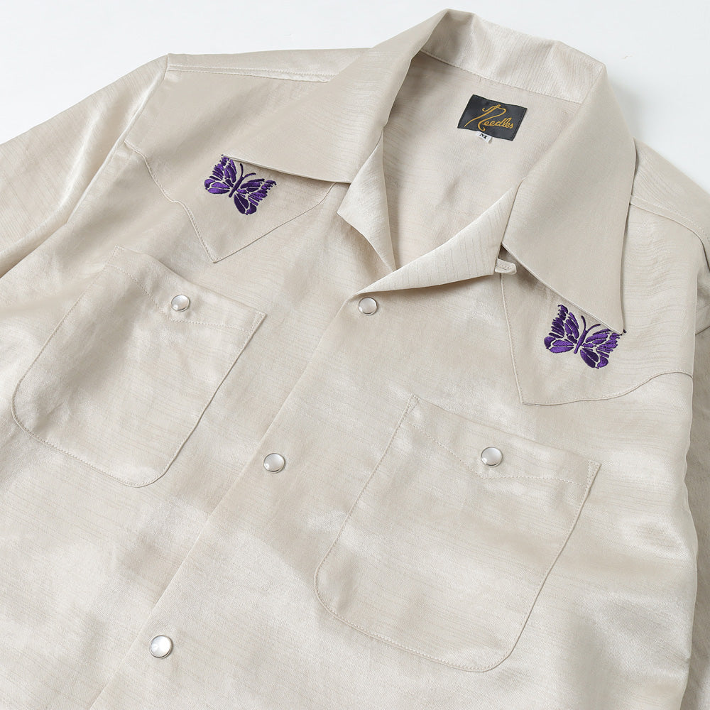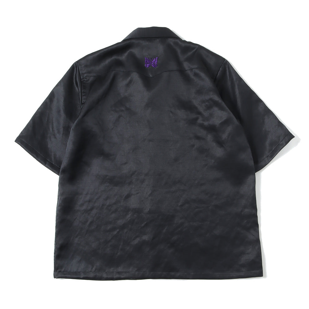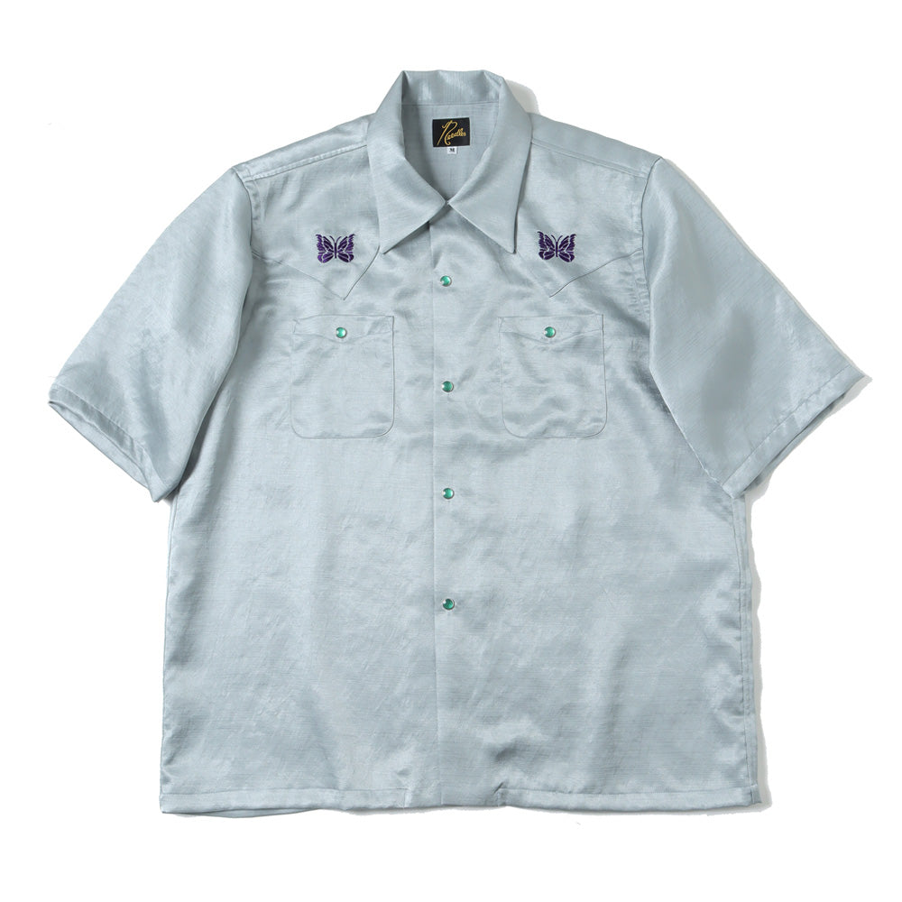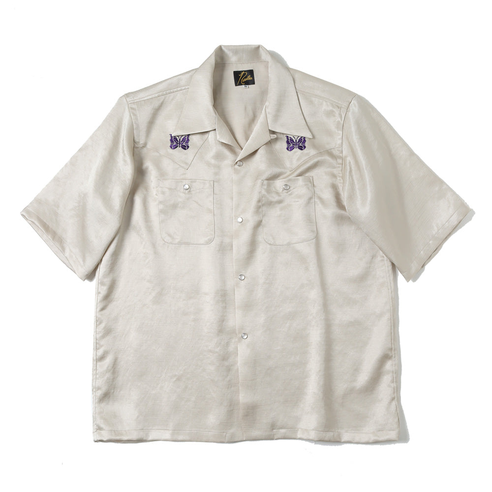 A spring/summer staple item, this cowboy shirt features a yoke and snap buttons, but with short sleeves for a spring/summer look. The slightly shorter length, boxy silhouette, and slightly longer sleeves create a retro and classic atmosphere that is characteristic of NEEDLES. This season, it is released in a slubby satin material. In addition to the gorgeous luster, the textured feel is appealing.
