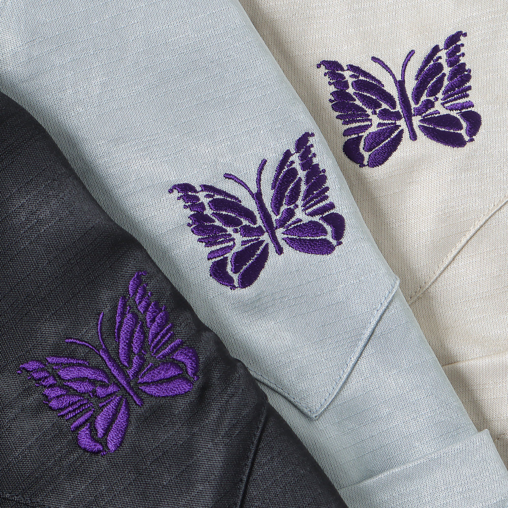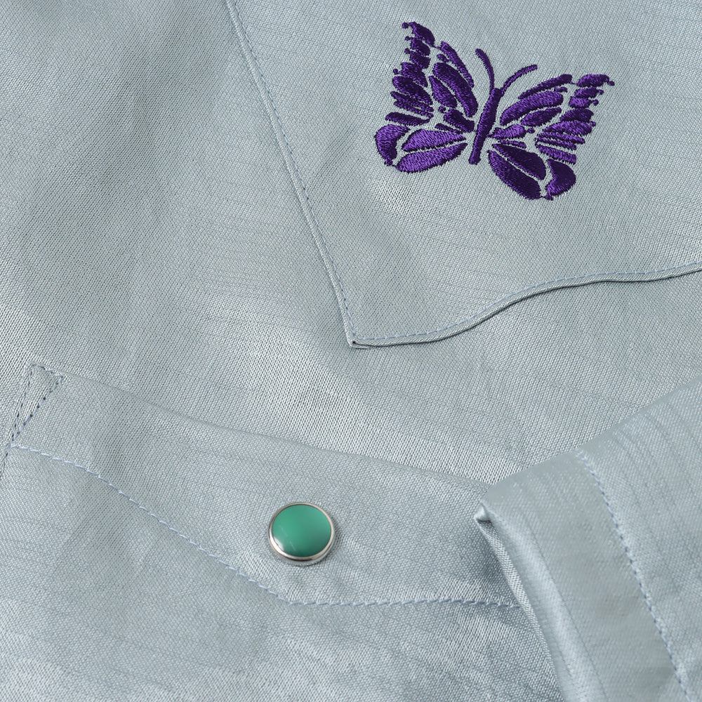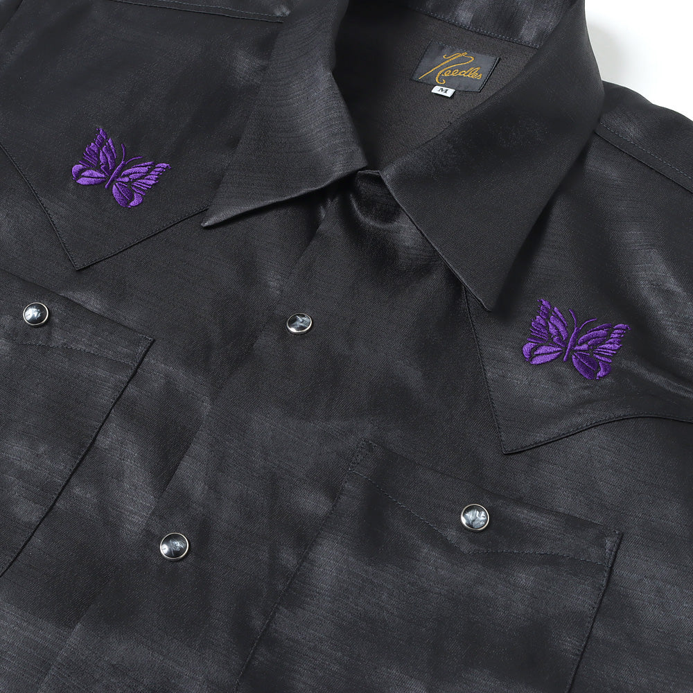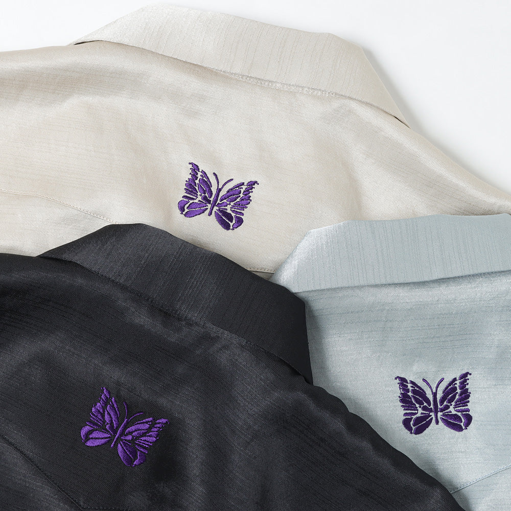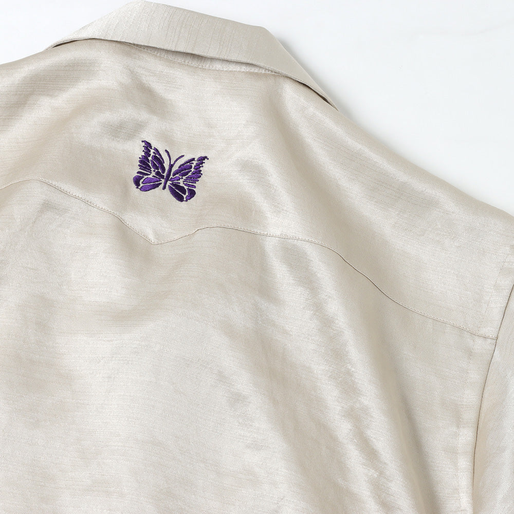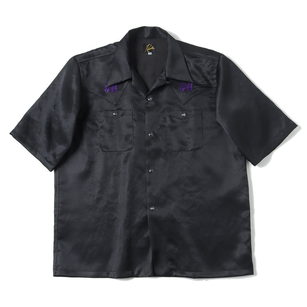 A spring/summer staple item, this cowboy shirt features a yoke and snap buttons, but with short sleeves for a spring/summer look. The slightly shorter length, boxy silhouette, and slightly longer sleeves create a retro and classic atmosphere that is characteristic of NEEDLES. This season, it is released in a slubby satin material. In addition to the gorgeous luster, the textured feel is appealing.