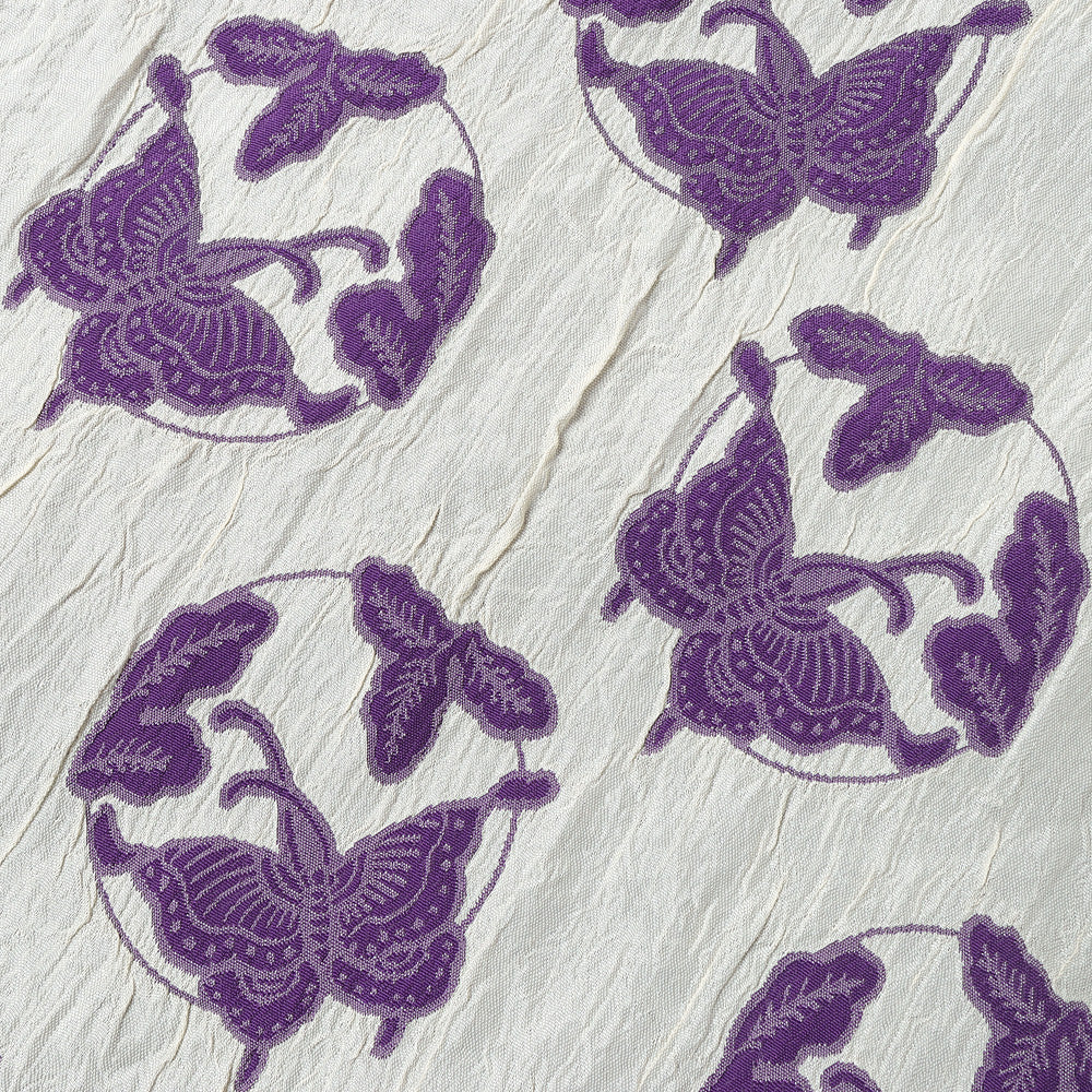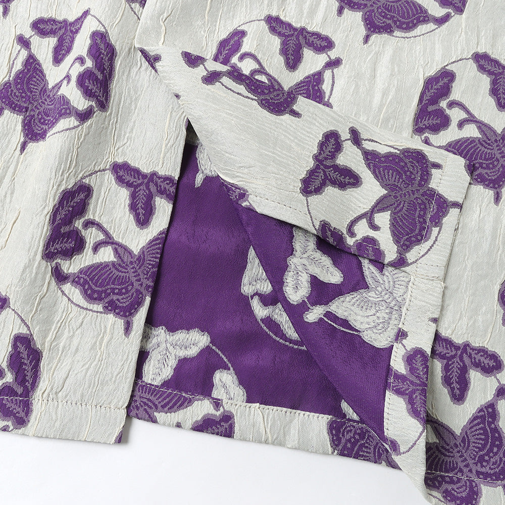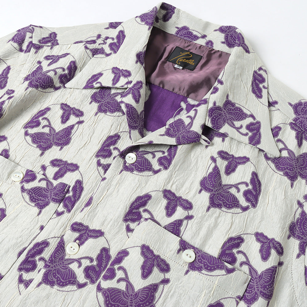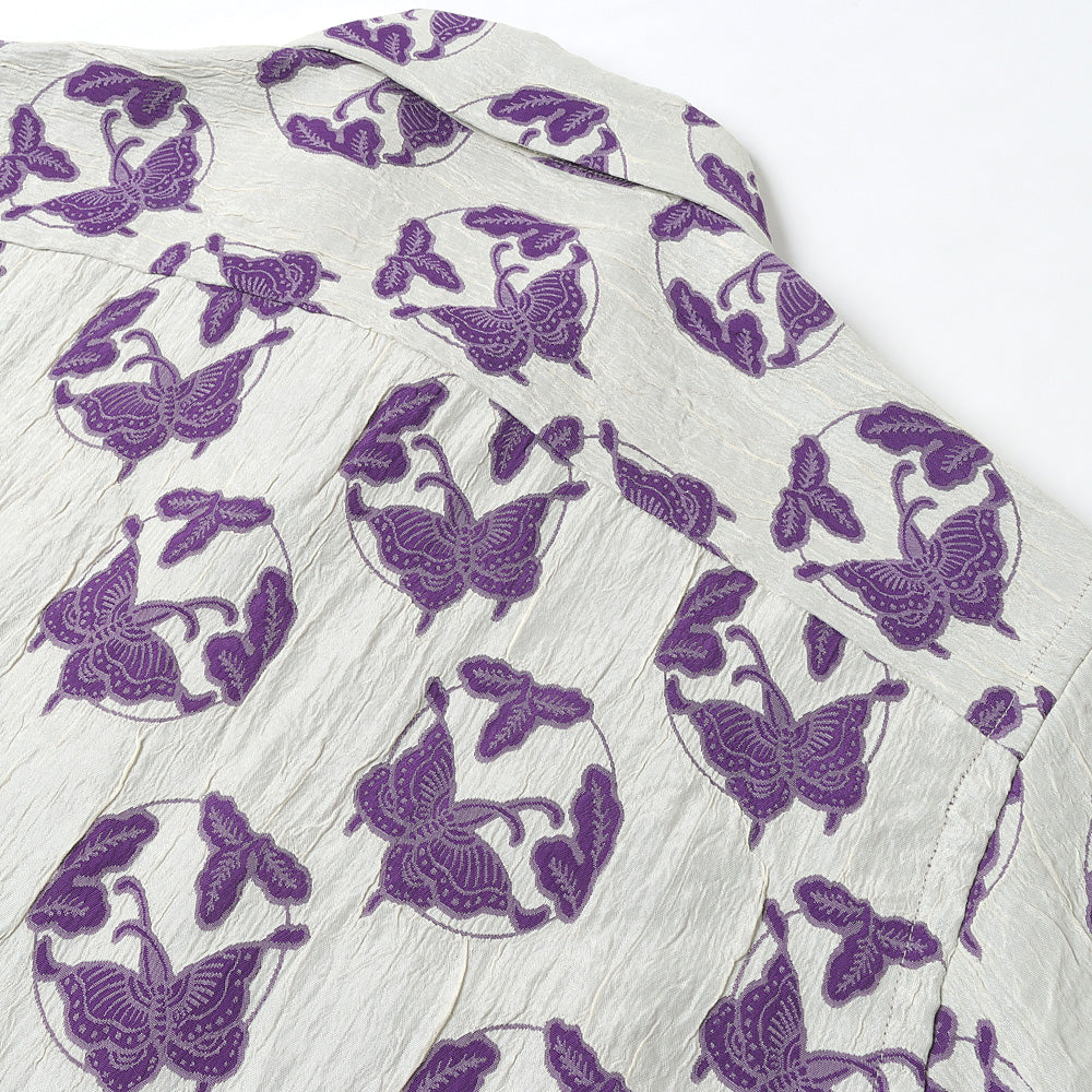 This short-sleeved shirt has an open collar that gives it a resort feel. The gently draped material matches the relaxed design well. This unique piece features an original jacquard pattern with a papillon (butterfly) motif.