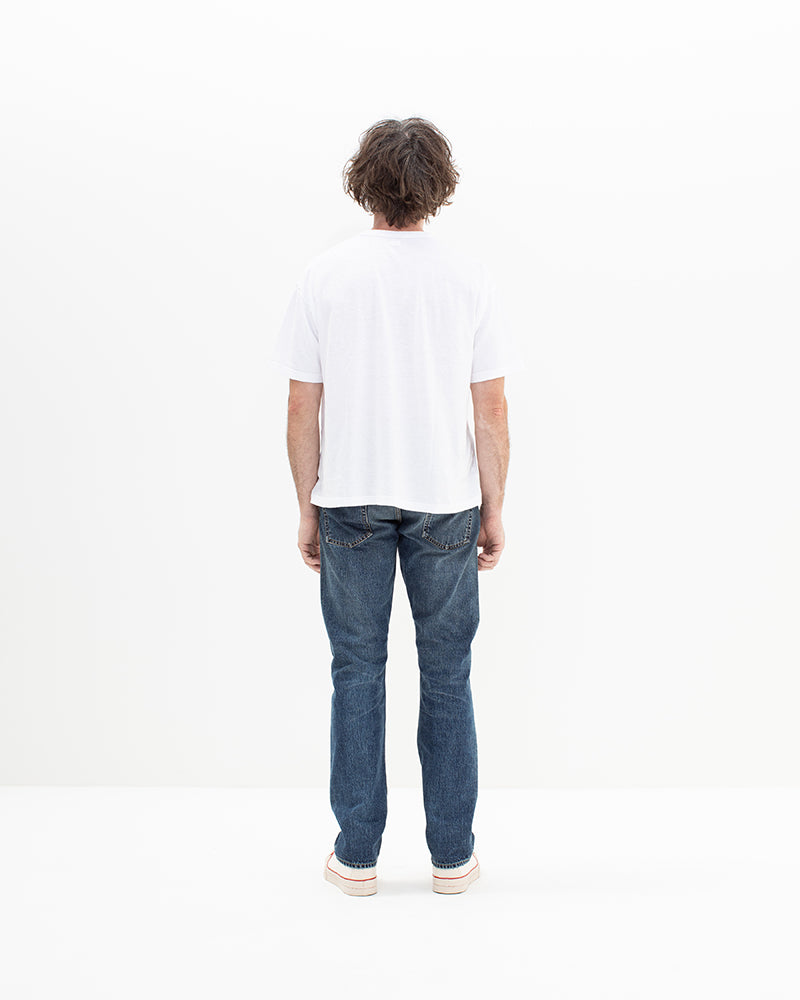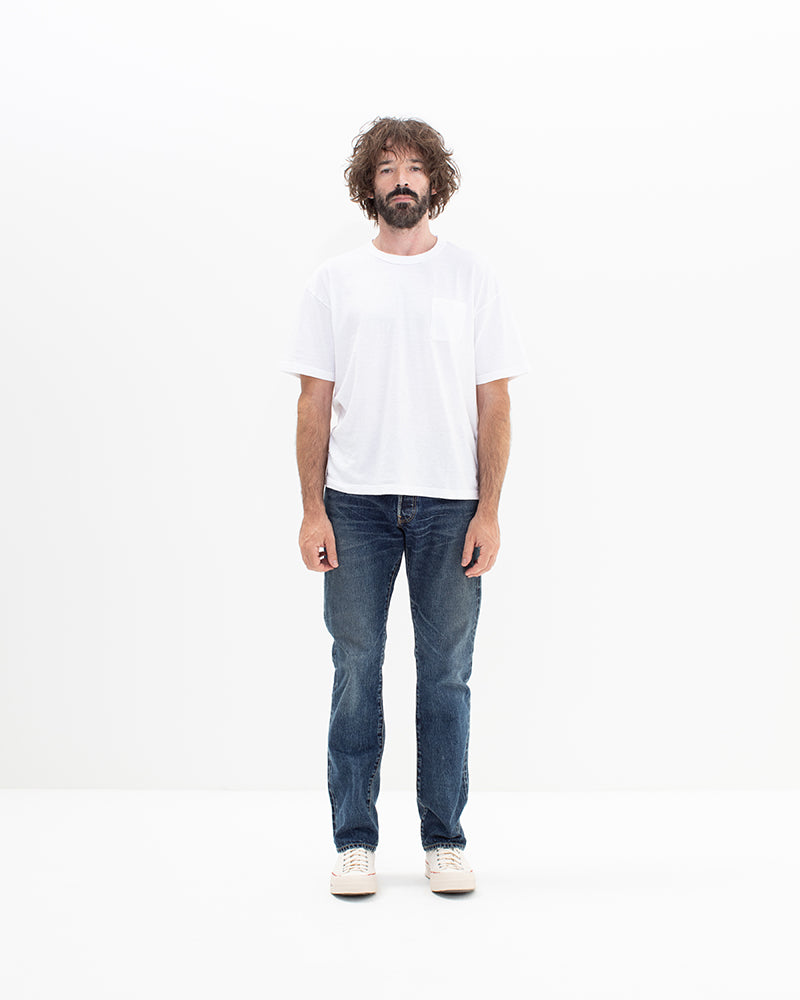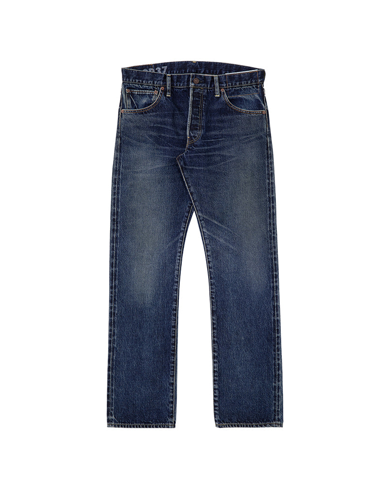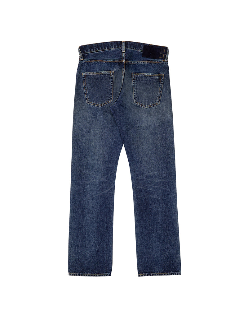 This denim is made with a focus on the deepest color of INDIGO rope dyeing. It is characterized by a deeper blue color than usual. Since it is woven without putting stress on the thread, the surface has an uneven texture and a deep expression. 14oz original denim pants Distressed Regular fit, slightly tapered silhouette, medium rise Button fly, red selvedge Inside zip pocket in right back pocket Details Original zipper slider, copper neoba button, rivet Deerskin patch with natural dyeing