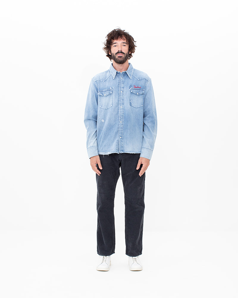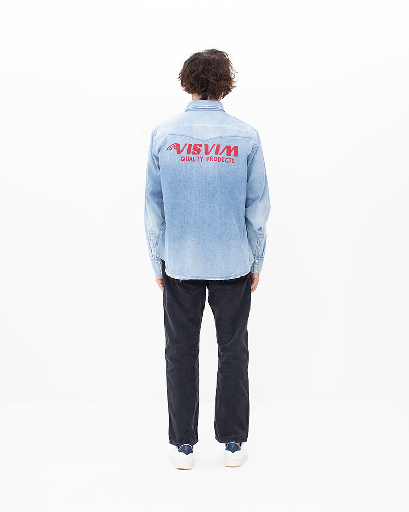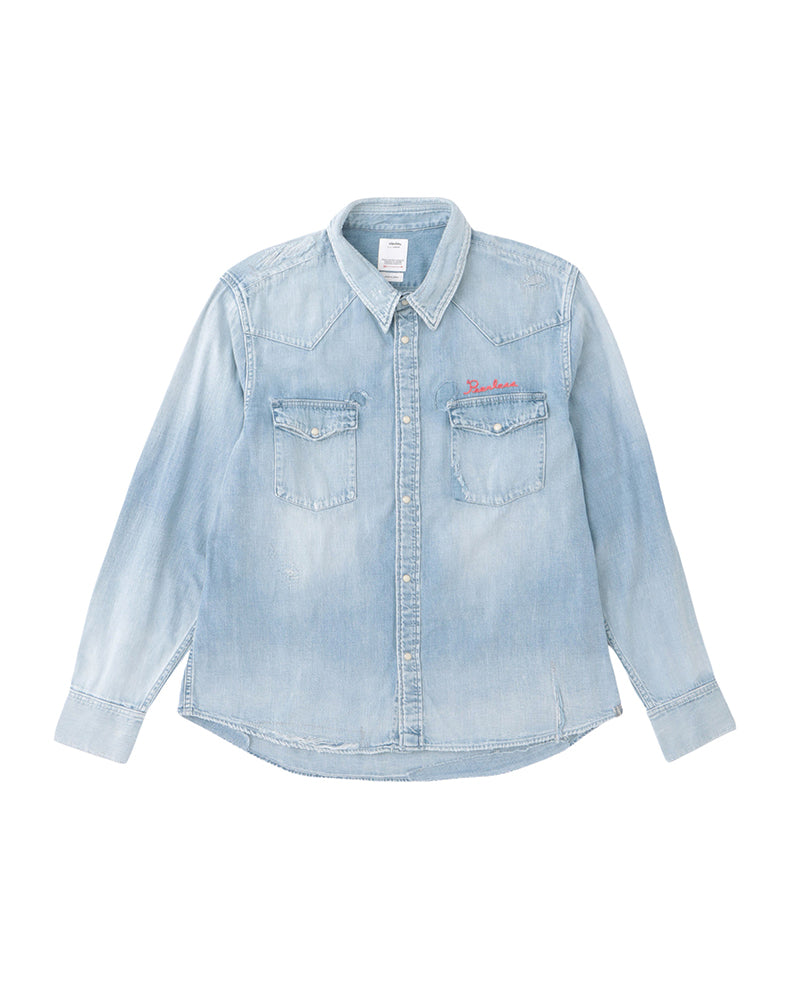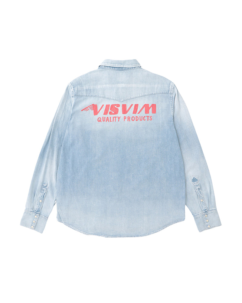 8oz original denim shirt Distressed gray selvedge American snap buttons Chest "Peerless" embroidered detail Back "VISVIM QUALITY PRODUCT" hand embroidered detail