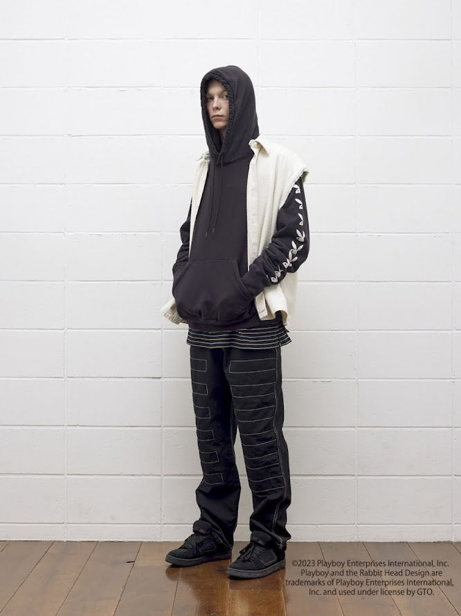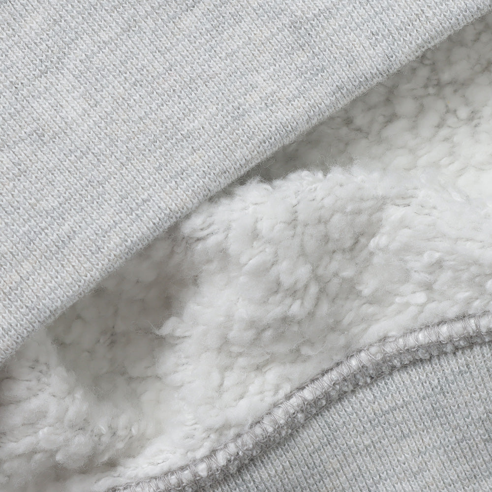 This is a hanging fleece knitted on an old-fashioned knitting machine. It has a very nice texture because it is knitted slowly, and the loops on the back are randomly exposed to give it a light nap.