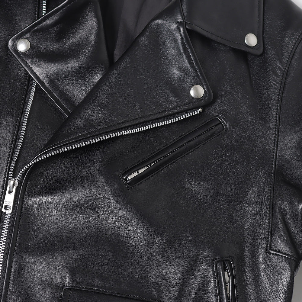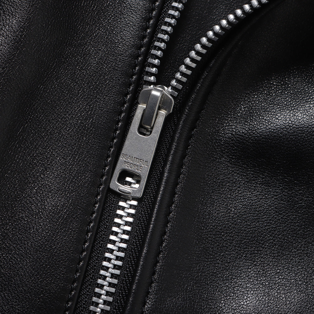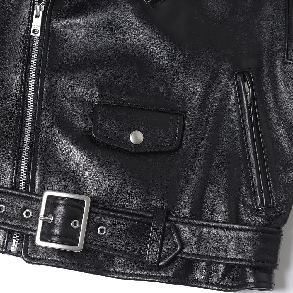 ・A compact rider's jacket with a classic design ・Features a short length and square silhouette ・Clean sleeve width and a forward-flared sleeve pattern that creates a three-dimensional effect when worn ・Sleeves feature pivot sleeves used in hunting jackets ・Features cutting and action sleeves that cover tightness and sleeve movement ・Choose a silhouette to suit the wearer's style ・Features logo-printed dot buttons, zipper top, and buckle