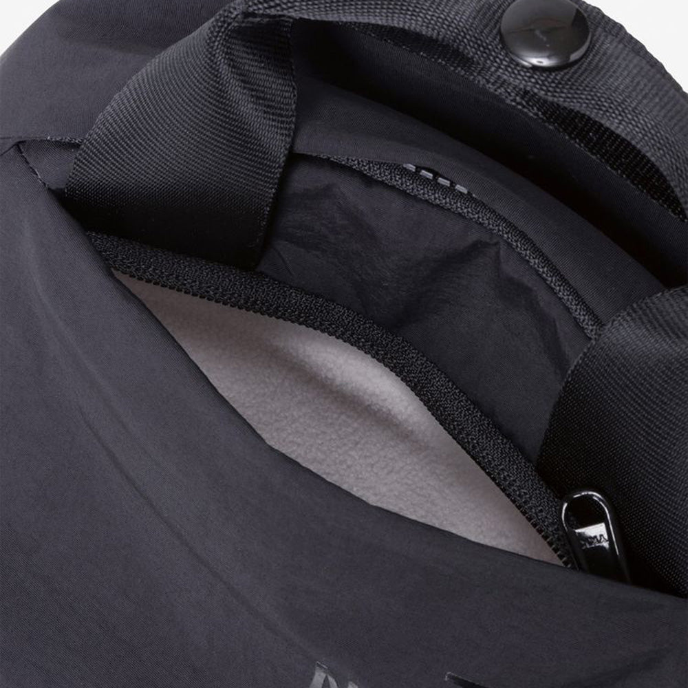 The zipper pocket is equipped with fleece lining that is useful for storing small mobile phones and sunglasses. The bottom part, which is prone to wear, is reinforced with a coating to improve durability.