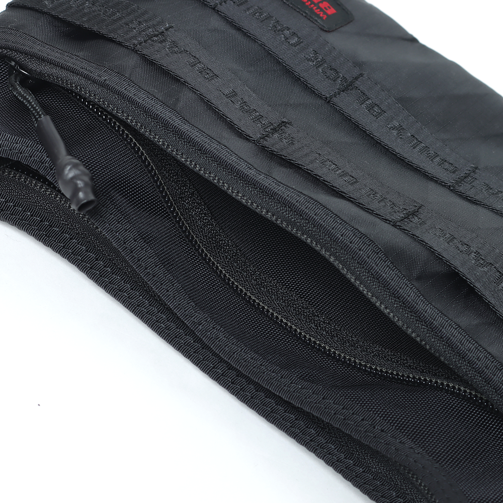 This sacoche bag is made of X-PAC fabric and can be fitted with accessories to a backpack harness. It can be attached by hooking the accessories onto the backpack harness. The design is highlighted by the tone-on-tone jacquard tape on the shoulder strap and front.