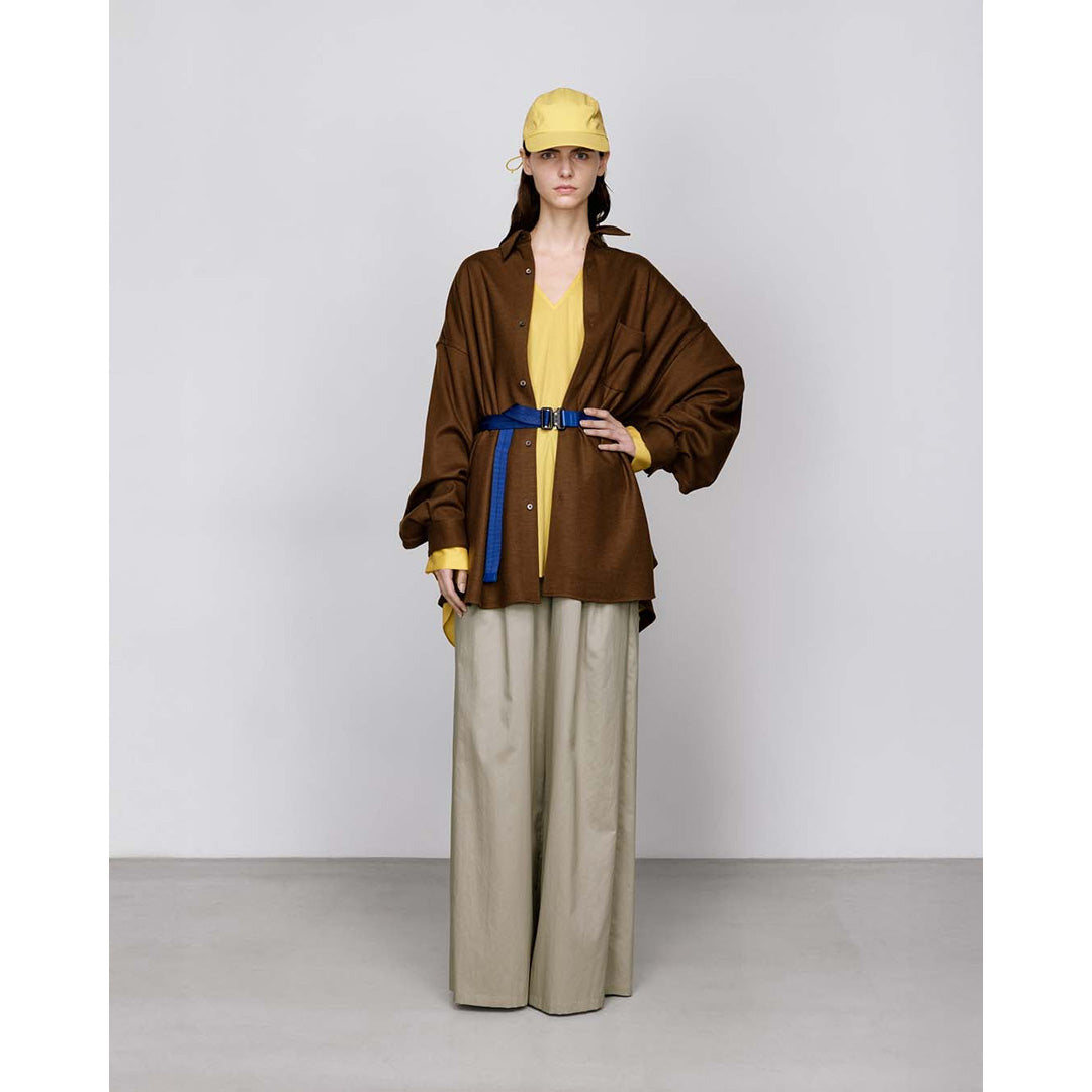 Compressed wool smooth knitted with high-quality wool and milled under high pressure to give it a flannel-like finish. Milled and scale-off processing is also used, making it hand washable. It features an elegant wool-like luster, a firm sense of firmness created by compression, and a supple drape. A regular collar shirt with an oversized fit that is perfect for winter and gives it a warm feel.