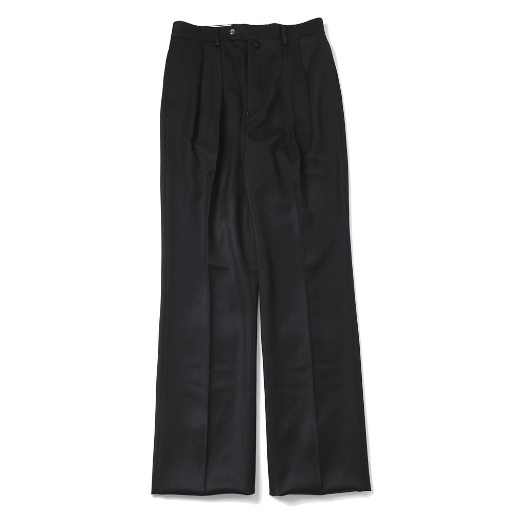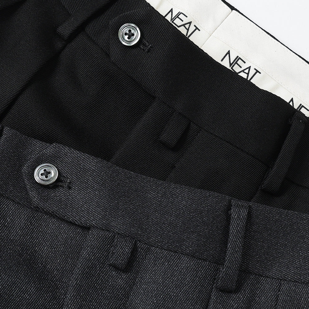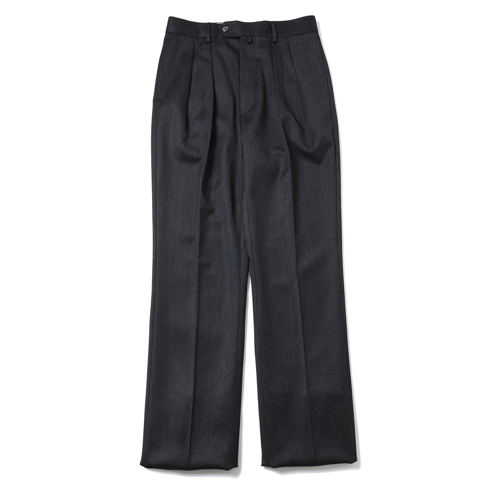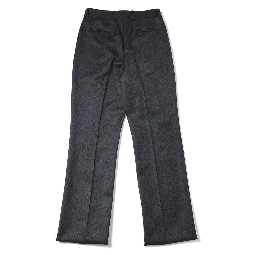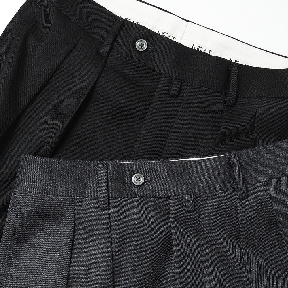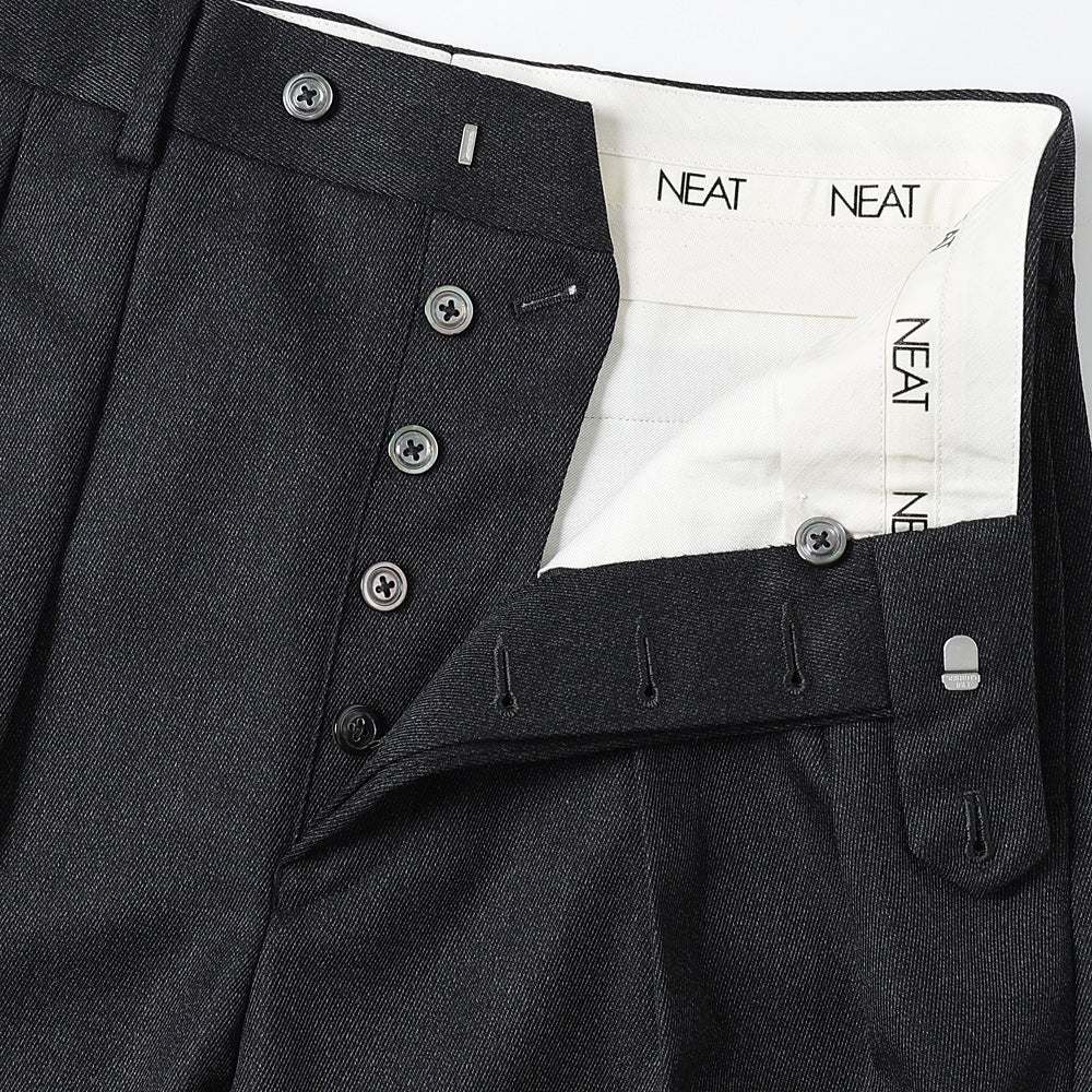 Both the warp and weft are made of medium count worsted wool 2/60, which gives the fabric a distinctive, lustrous appearance with a striking twill weave and unevenness due to the weave structure.